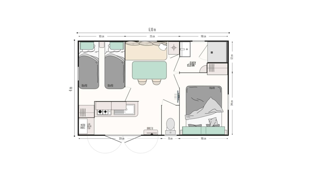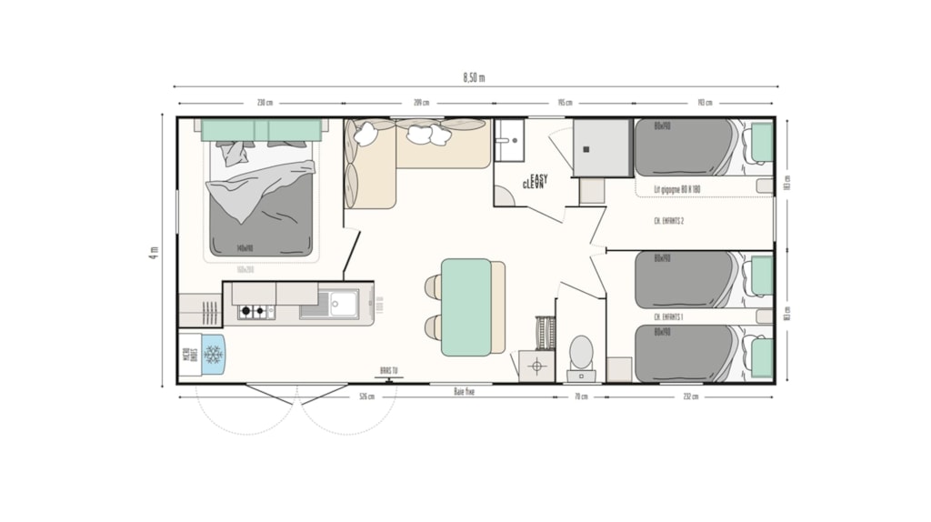 À l'intérieur de la tente, il y a quatre places de couchage réparties sur deux parties : 1 grand lit (160 x 200 cm) et un lit superposé (80/90 x 200 cm). La cuisine est entièrement équipée avec une cuisinière à 4 feux, un réfrigérateur avec compartiment congélation et de l'eau chaude et froide. De plus, il y a une salle de bain dans la tente pour un confort supplémentaire. À l'intérieur, il y a un coin repas avec un banc et des chaises.