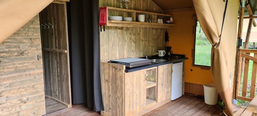 Avis aux amoureux de la nature ! 100% toile et bois, la tente lodge s’intègre parfaitement dans le paysage.