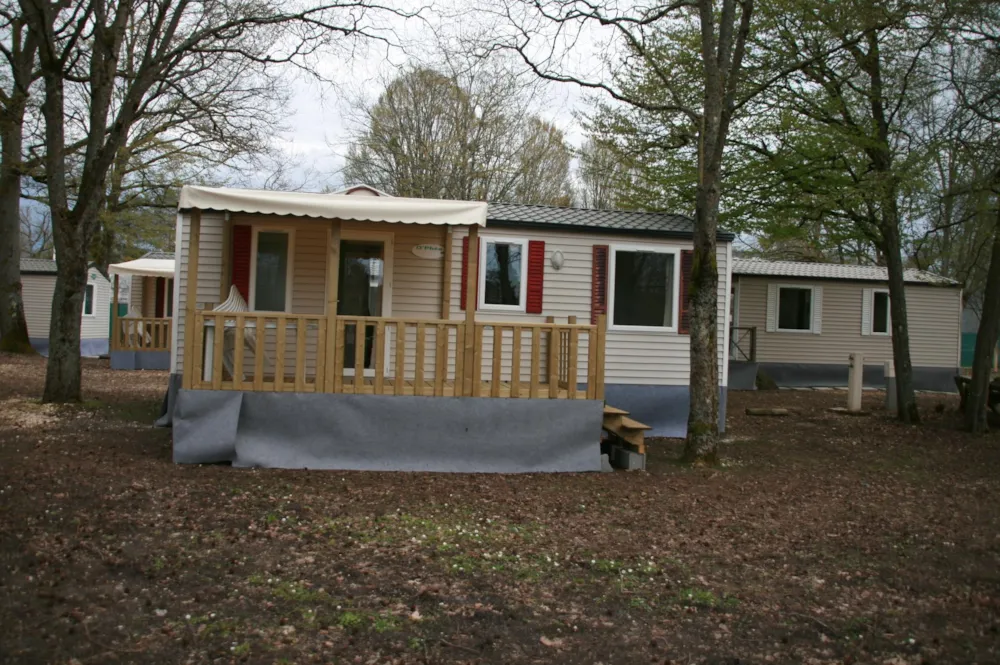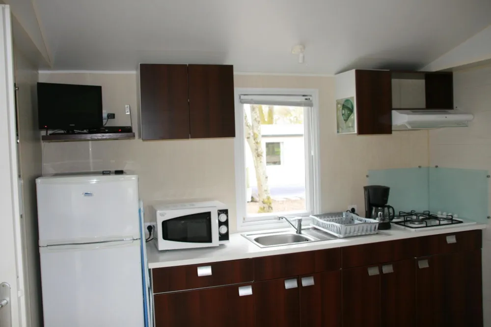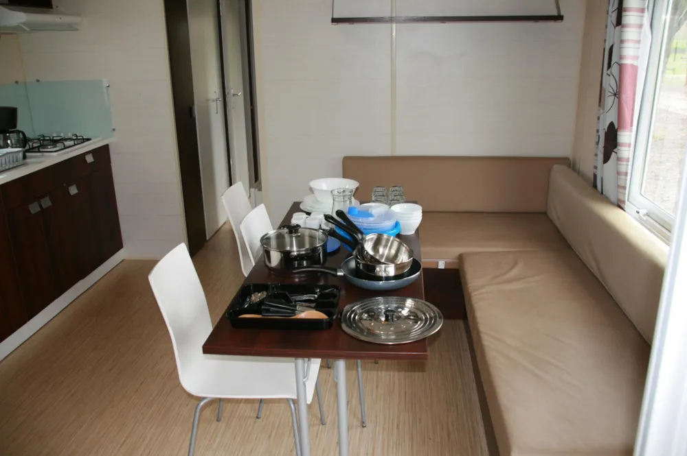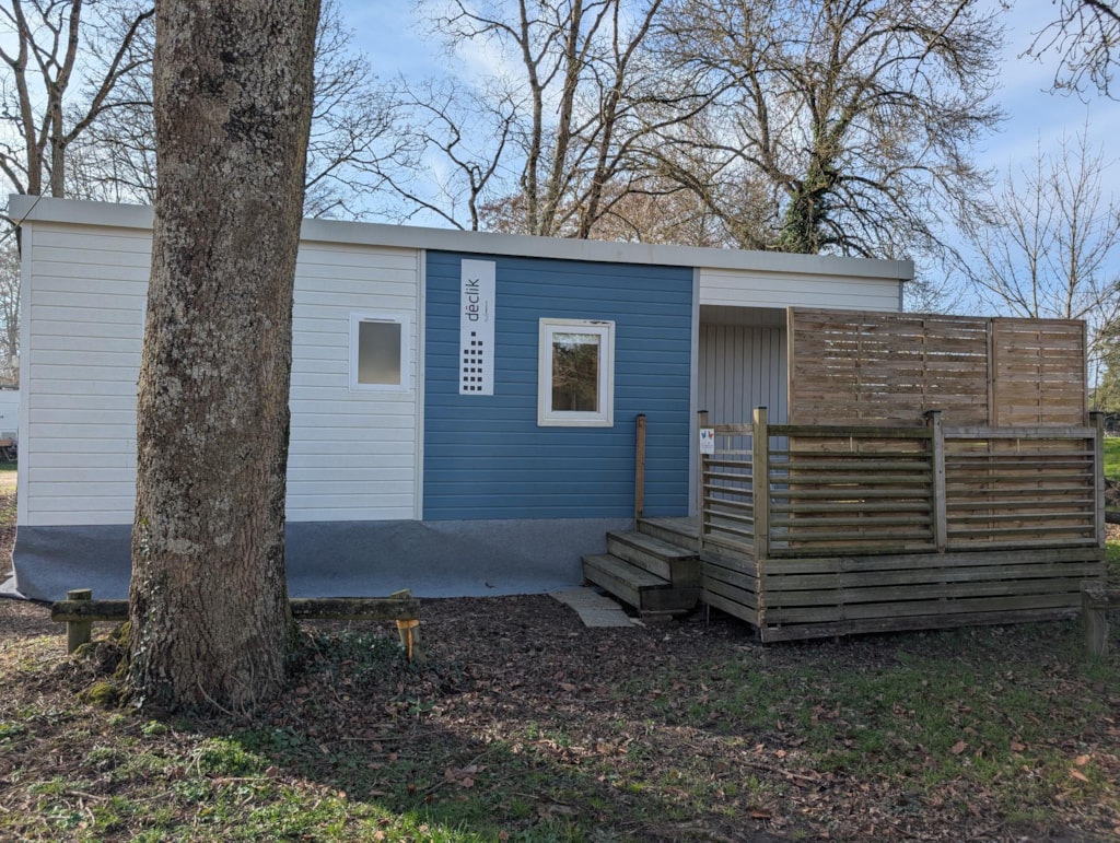 Mobile home 2 bedrooms, for People with Reduced Mobility, 26 m², fully equipped, crockery, fridge, coffee machine, microwave, television, semi-covered terrace, garden furniture, free wifi Its assets: - All rooms are wheelchair accessible. - Bathroom with Italian shower and seat. - Possibility to accommodate 4 to 6 people. Night side: All doors slide to facilitate access to the different rooms, with a minimum opening of 78 cm. The main bedroom occupies the entire width of the mobile home for optimum comfort. A raised bed to facilitate transfers. A second bedroom with 2 bunk beds. Numerous storage units and brightly coloured grab bars contrasting with the walls. Living area: The layout of the living area facilitates circulation. No obstruction at face level. sofa . Long kitchen with large work surface. Specific rectangular table, designed to respect a height of 700 mm. Turning area of 150 mm.
