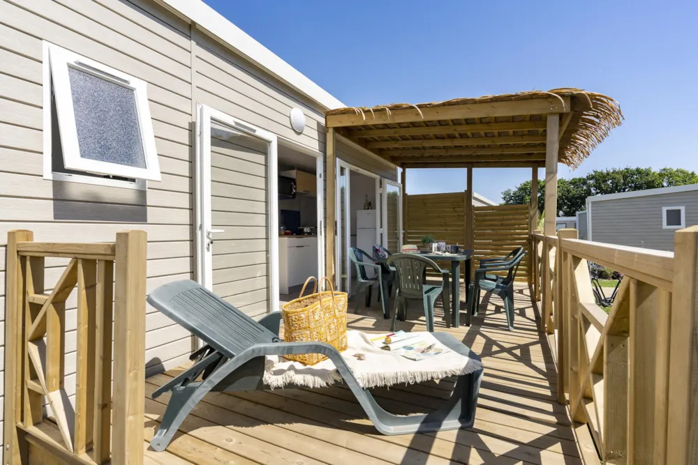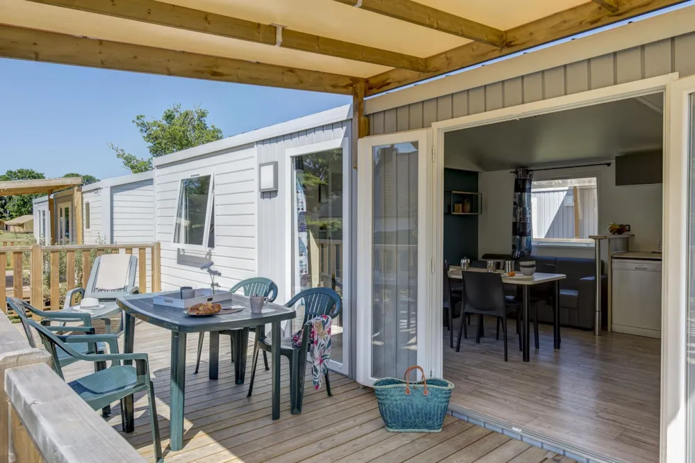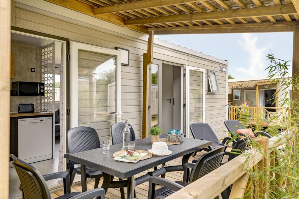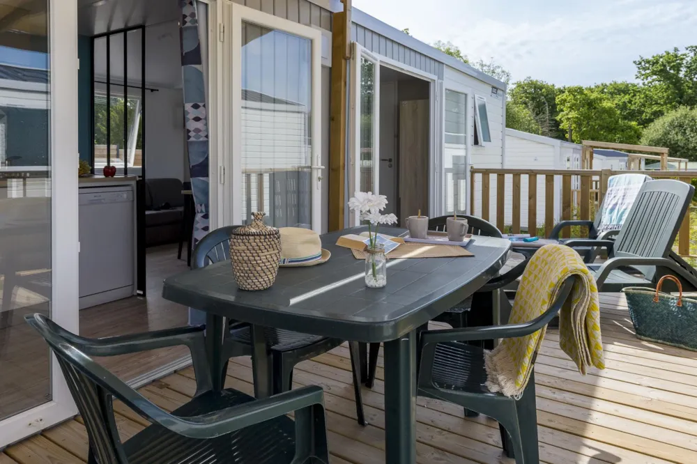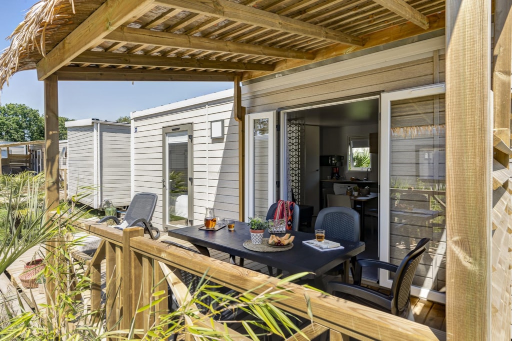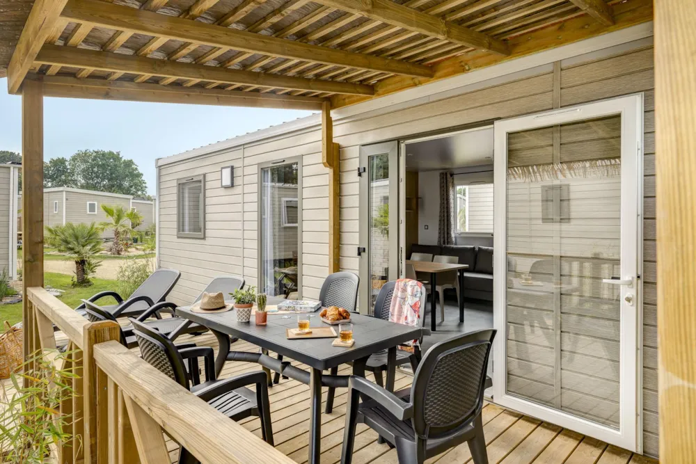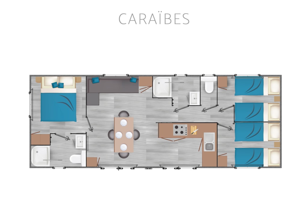 Premium Caraïbes, 3 bedrooms – 2 bathrooms, 6/8 pers - 40m², New mobile home, Year: 2018 ; Exterior : Garden table and chairs, Sunbeds, Barbecue on request (2€/day, deposit required), Partially covered terrace (15m² including 7.5m² covered area), Clothes dryer