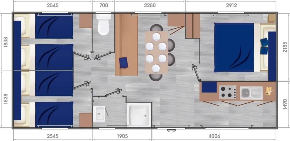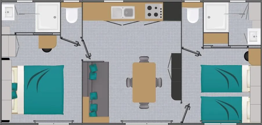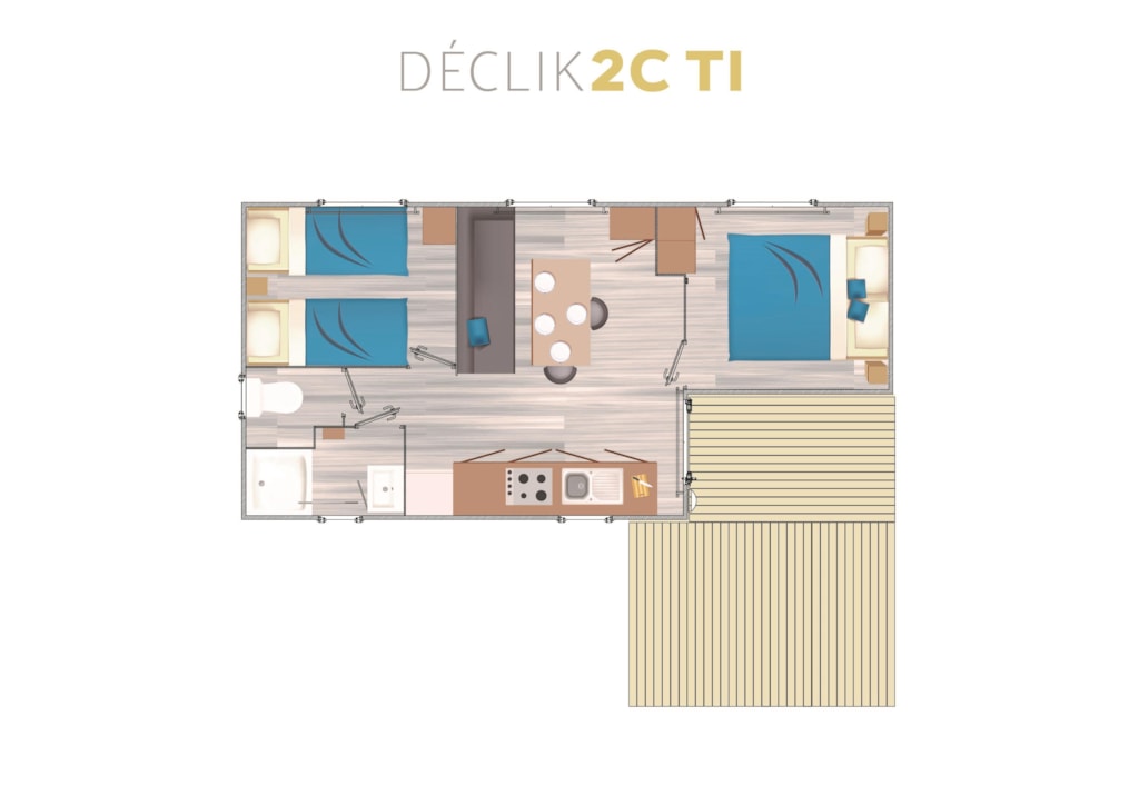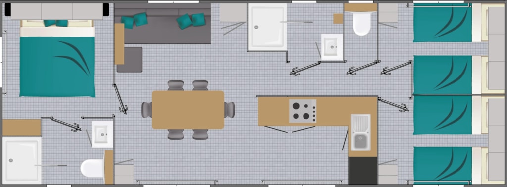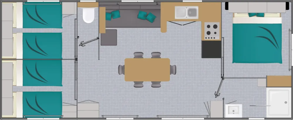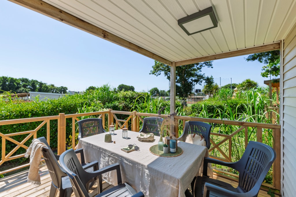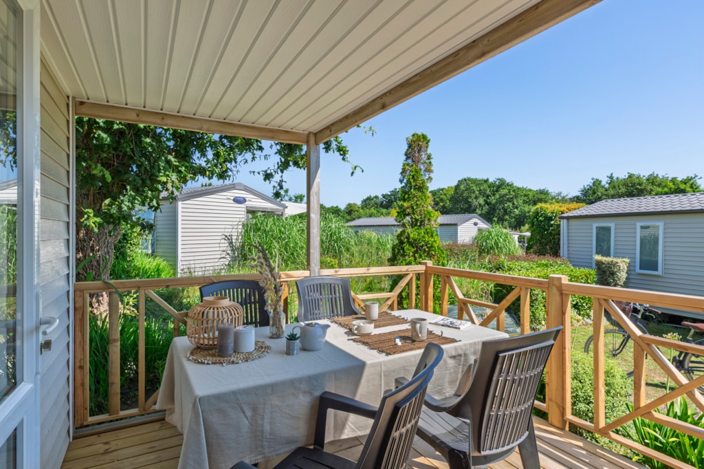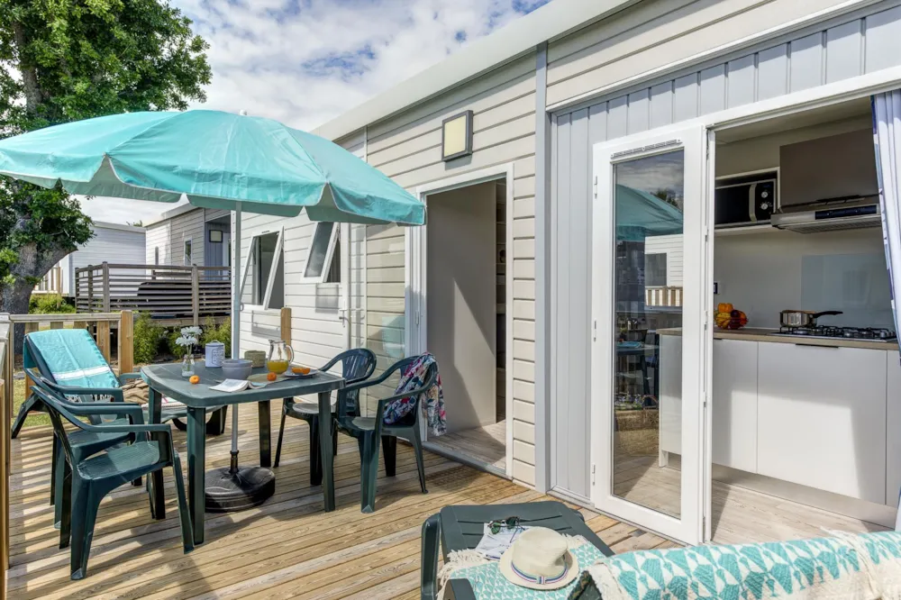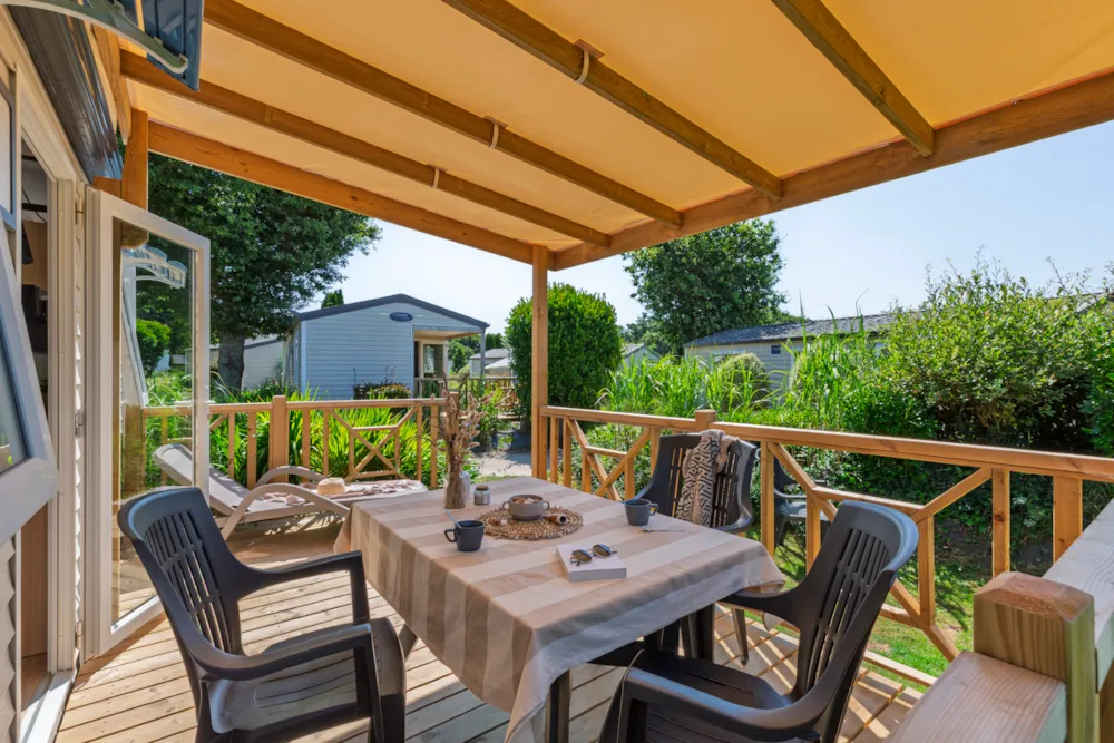 Premium Caraïbes, 3 bedrooms – 2 bathrooms, 6/8 pers - 40m², New mobile home, Year: 2018 ; Exterior : Garden table and chairs, Sunbeds, Barbecue on request (2€/day, deposit required), Partially covered terrace (15m² including 7.5m² covered area), Clothes dryer