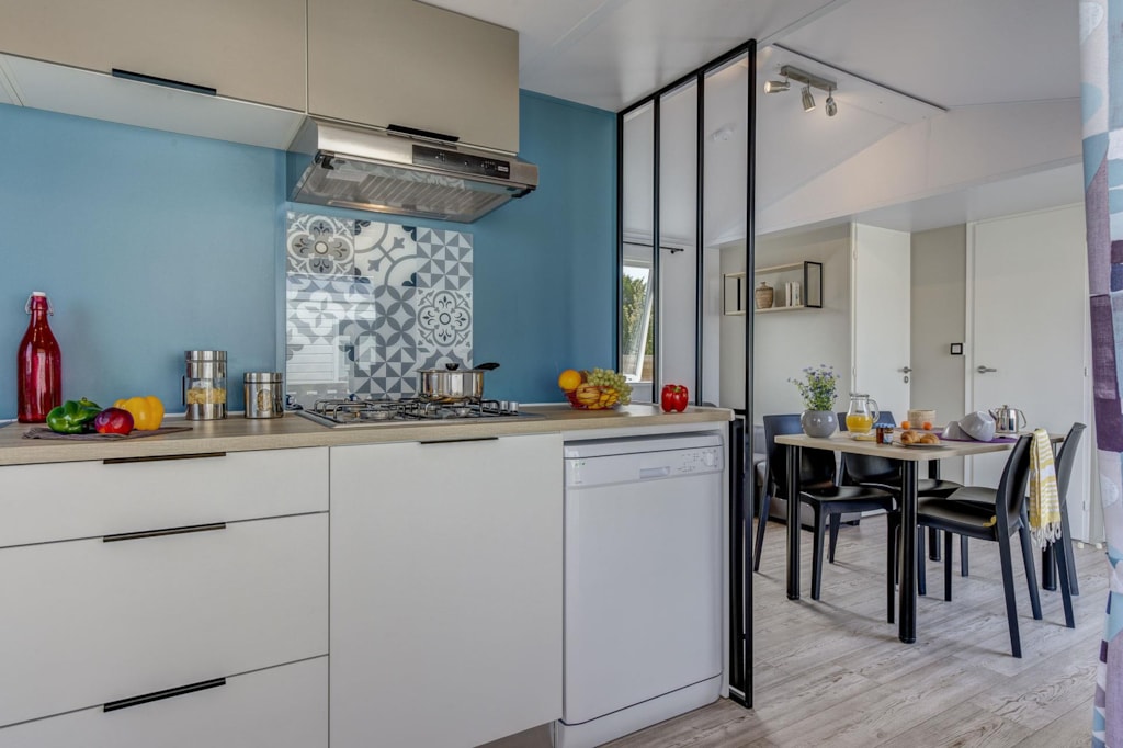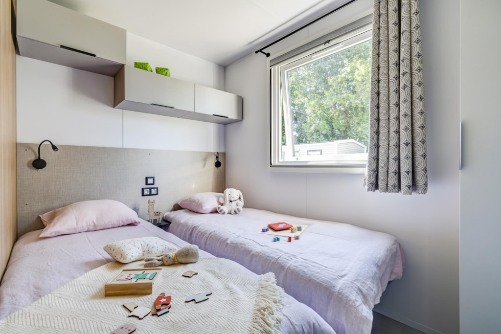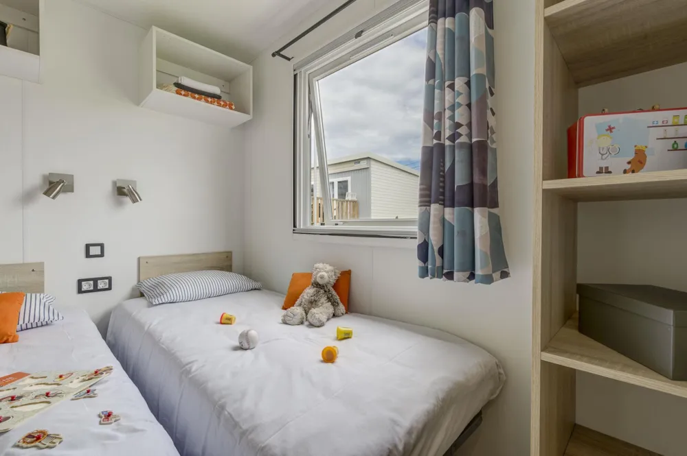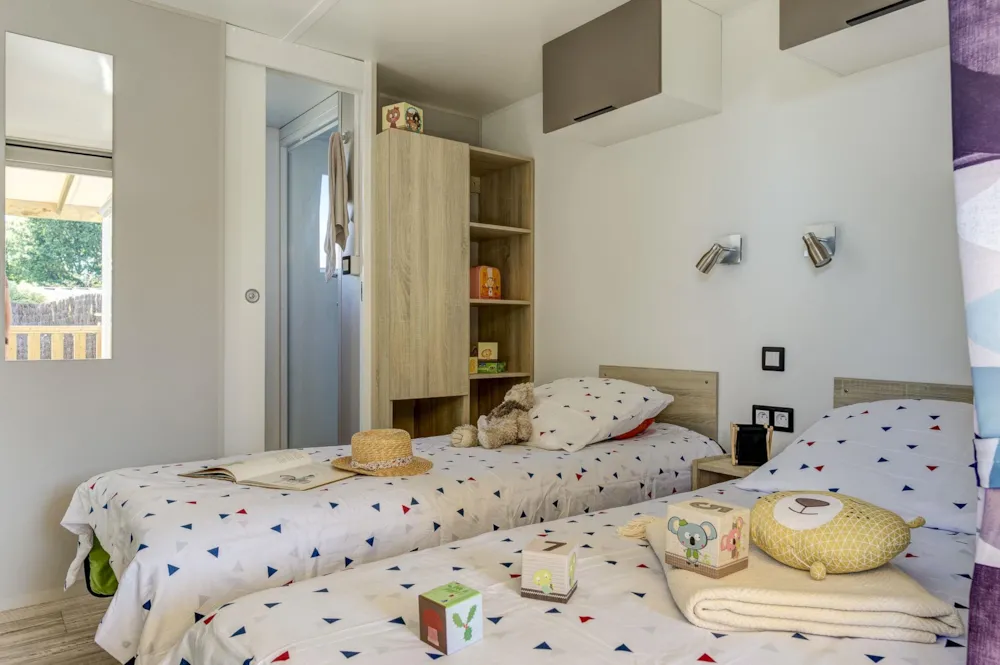 PRESTIGE BALI - 4/5 PEOPLE - 30M² 2 BEDROOMS . New mobile home - 2020 Model . Pedestrian area Exterior : Garden table and chairs, Deckchairs, Barbecue on request (2€/day), Partially covered terrace, Drying Rack Kitchen area, Hob, Microwave oven, Electric coffee machine and Nespresso machine, Kettle, Toaster, Fridge + freezer compartment, Crockery and kitchen utensils, Dishwasher, Extractor fan Living area : Tables and chairs, Radiator, Vacuum Cleaner, TV, Comfortable sofabed: 140x190cm Bedrooms : 1 bedroom - 1 double bed : 160x200cm « Belle Literie » Label mattress, 1 bedroom - 2 single beds : 80x190cm, Quilts and pillows provided, Radiator Bathroom, Shower, washbasin, Separate WC, Radiator, Hairdryer