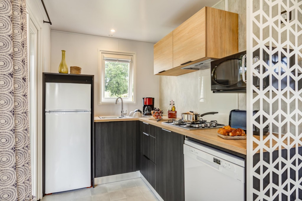 Kitchen area : Hob, Microwave oven, Electric coffee machine, Kettle, Toaster, Fridge + freezer compartment, Crockery and kitchen utensils Lave-vaisselle, Extractor fan, sink