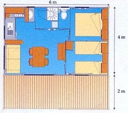 32m2 Chalet mit 3 Schlafzimmern und einer großen Terrasse. Das Badezimmer ist vom WC getrennt. Sie haben viel Platz um Ihr Chalet herum. Ideal für 6 Personen.