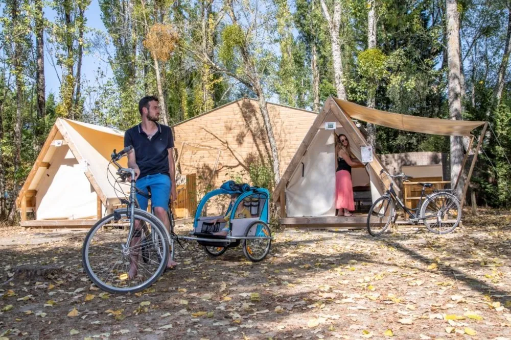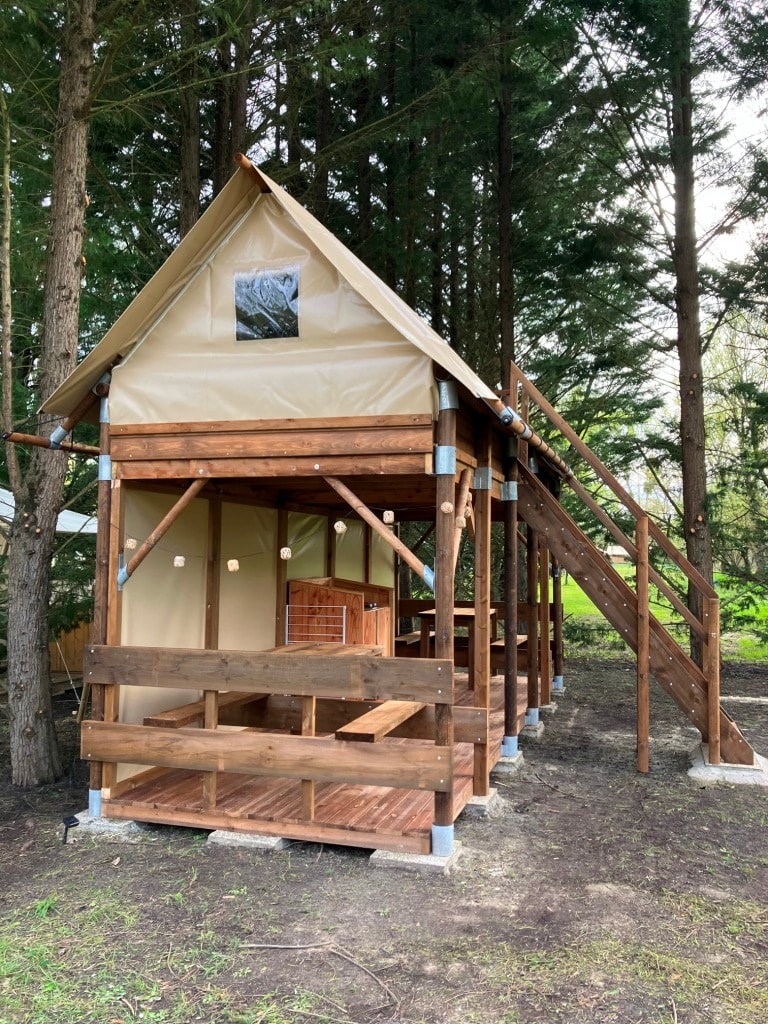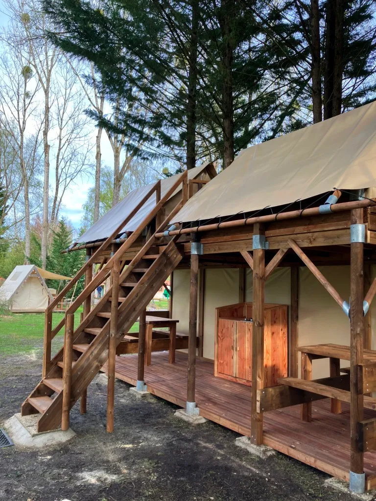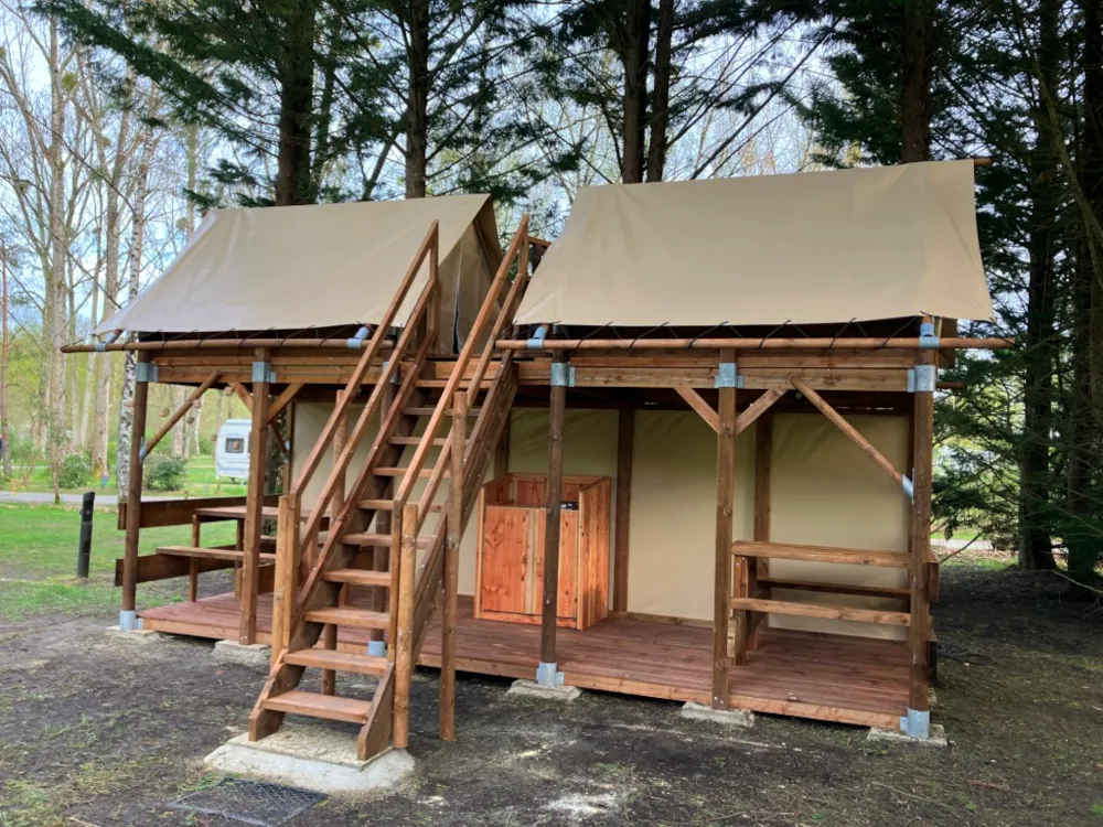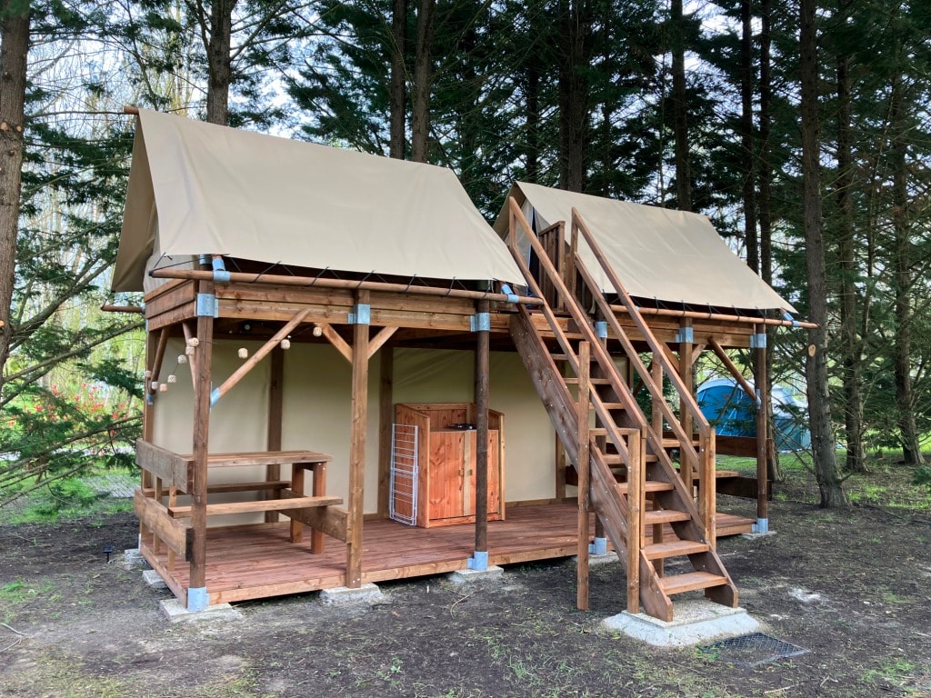 Kommen Sie zu Fuß oder mit dem Fahrrad und entdecken Sie den Wandergeist neu. Diese Hütte auf Stelzen bietet Platz für 4 Personen in 2 Hütten, die durch eine Terrasse verbunden sind. Das Parken von Fahrzeugen ist in dieser autofreien Zone nicht gestattet. Auf dem Campingplatz stehen spezielle Parkplätze zur Verfügung.