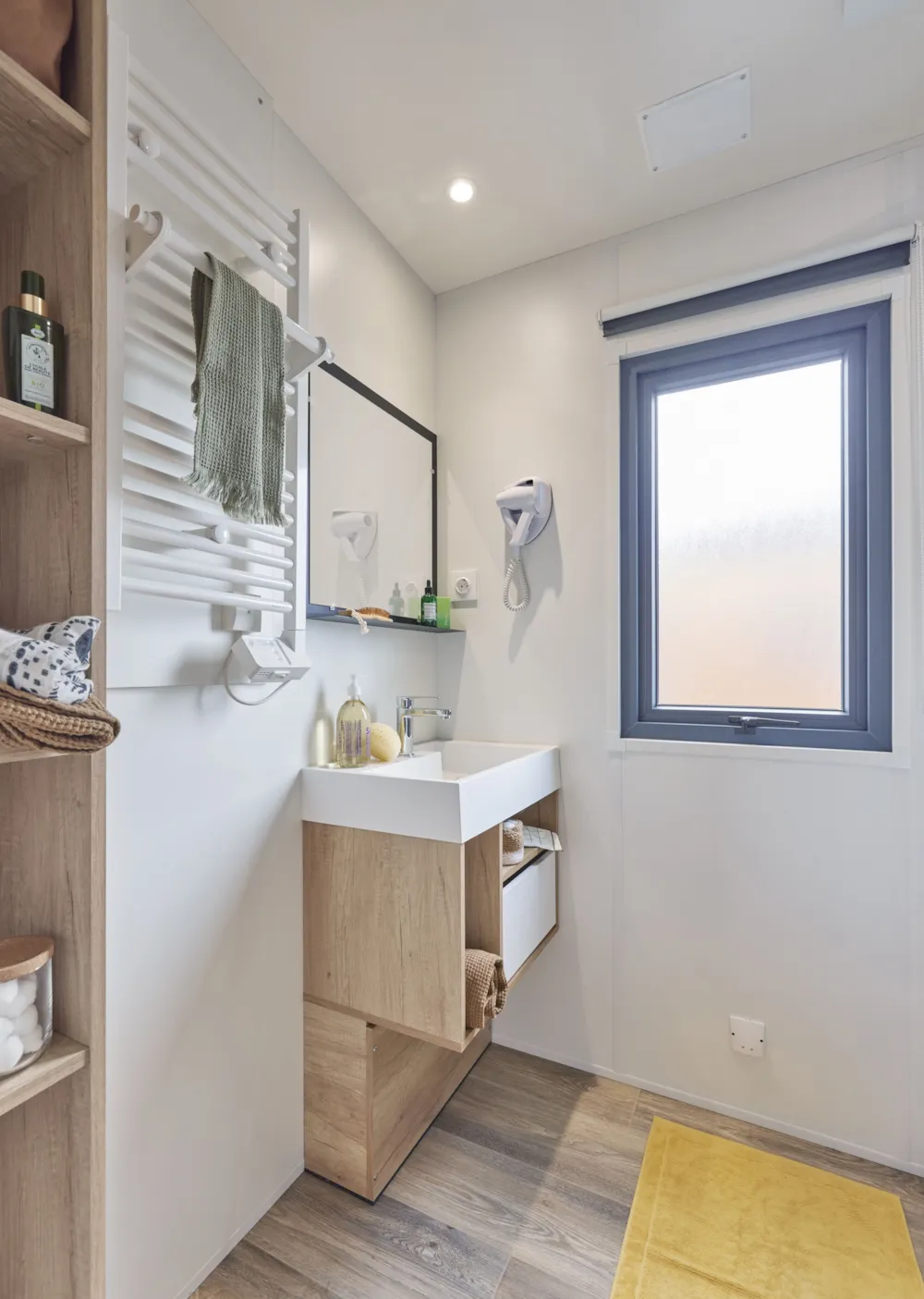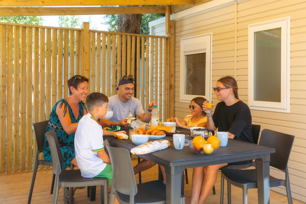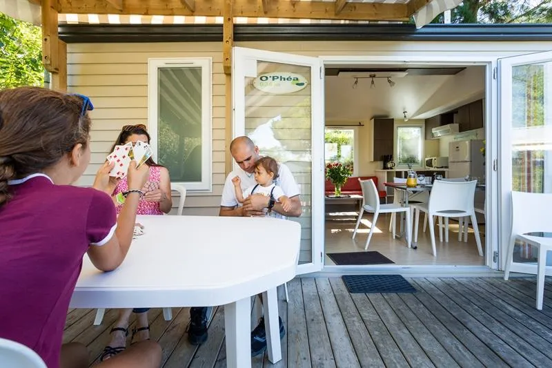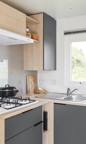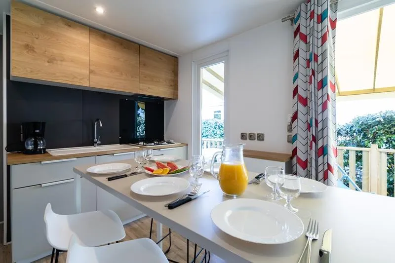 The Grand Large mobile home is one of our most spacious accommodations at Le Bois Soleil and one of the newest. With 3 bedrooms and a kitchen/living room that opens to the outside, the Open Sea mobile home is a comfortable living space, set up to make your life easier. It sleeps 6, so it’s the perfect choice for a holiday with family.