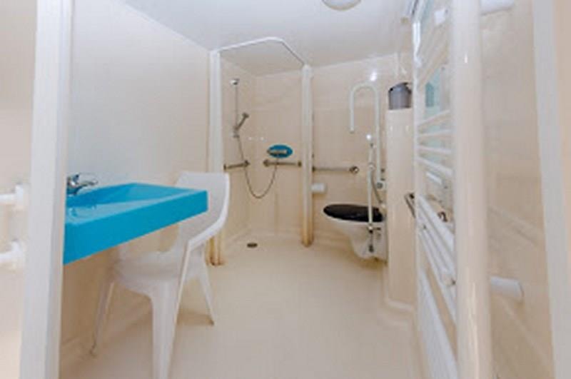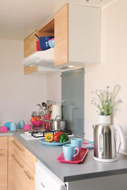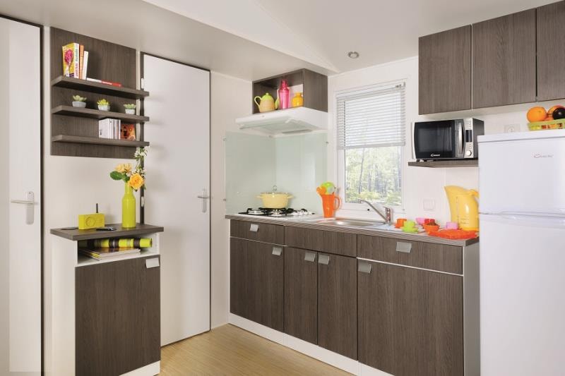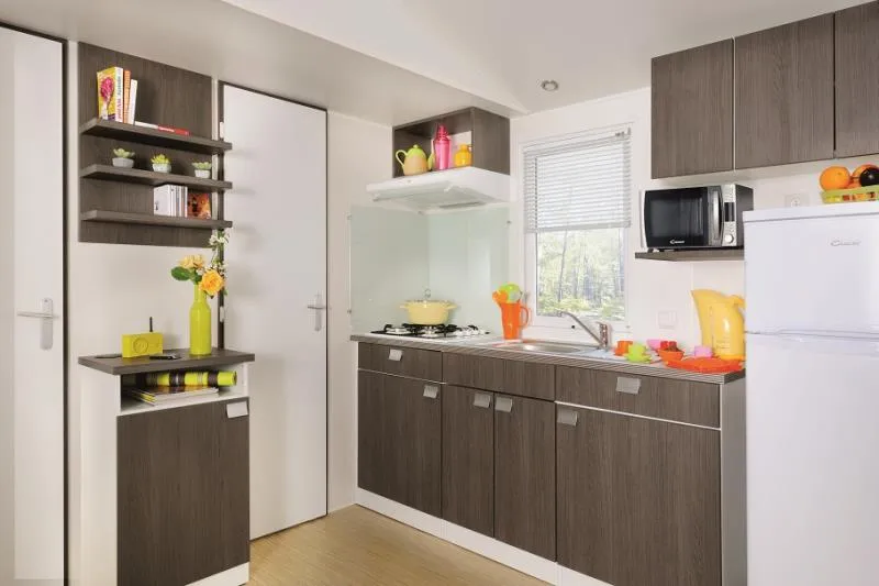 Un mobil-home spacieux et adapté aux personnes à mobilité réduite ; espace de circulation dans chaque pièce, hauteur des meubles de cuisine, salle de bain équipée.