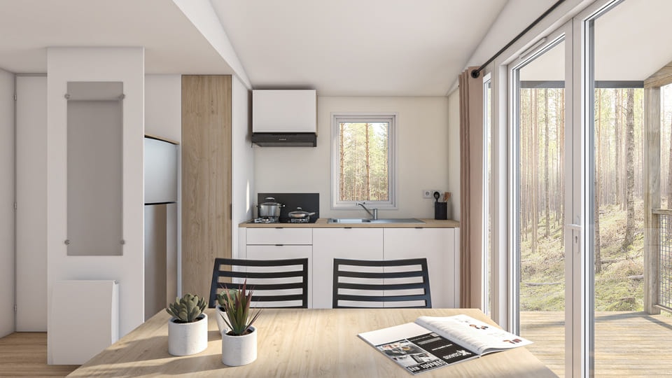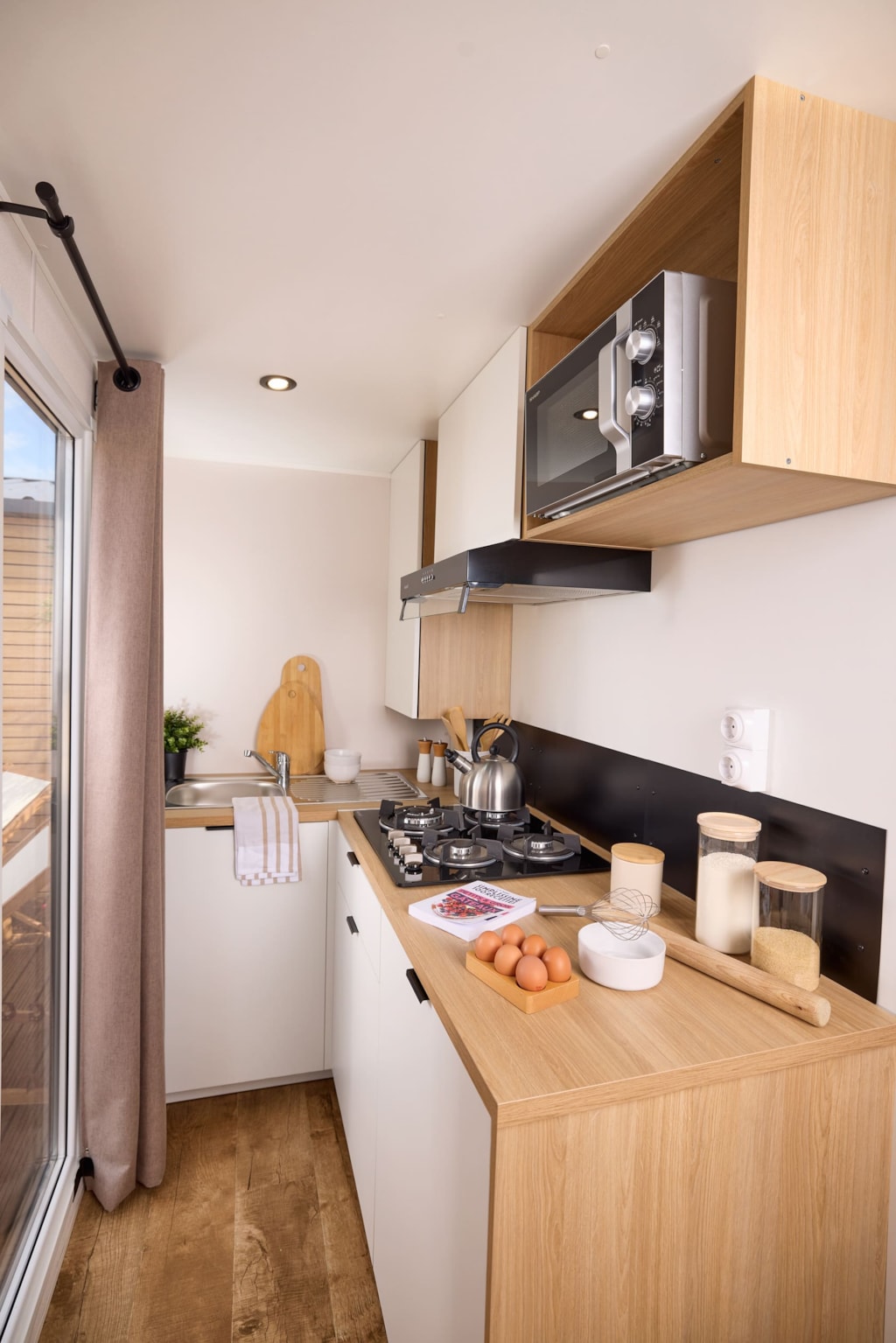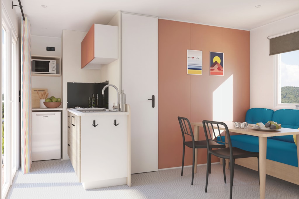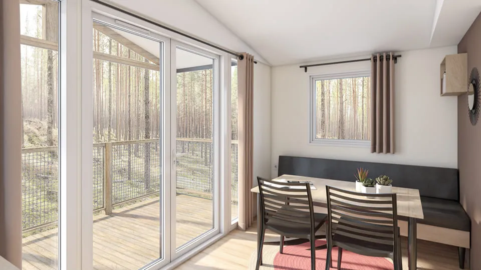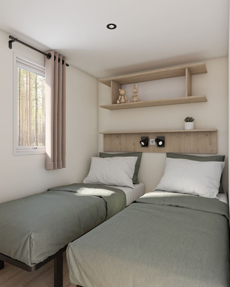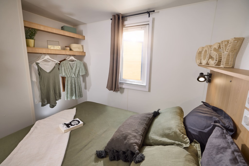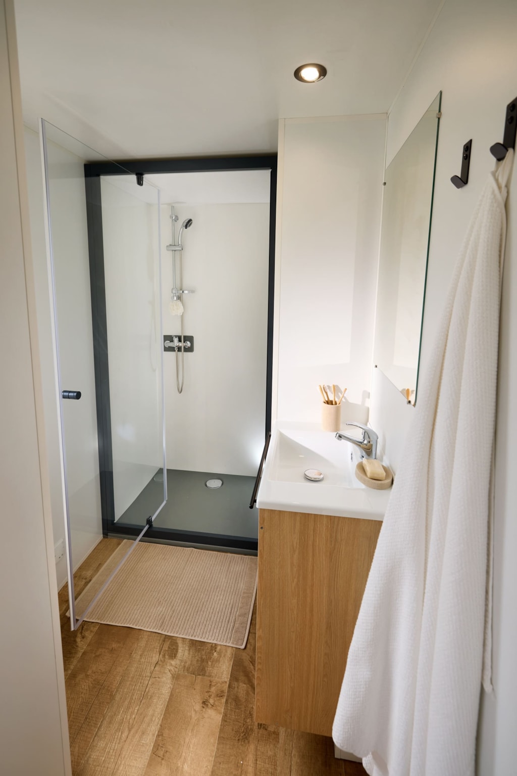 Des mobil-homes de 2025 avec climatisation réversible dotés d’un esthétique intérieur et extérieur sobre et épuré. Une superficie totale de 38 m2 dont 9 m2 de terrasse couverte panoramique qui offre beaucoup de luminosité sur une pièce de vie agréable. Une salle de douche et des toilettes séparés. Ils comprennent une chambre avec un lit double et une chambre avec 2 lits simples, le dernier couchage est possible sur la banquette du salon. Chaque mobil-home dispose d'une terrasse couverte et d'une place de stationnement.