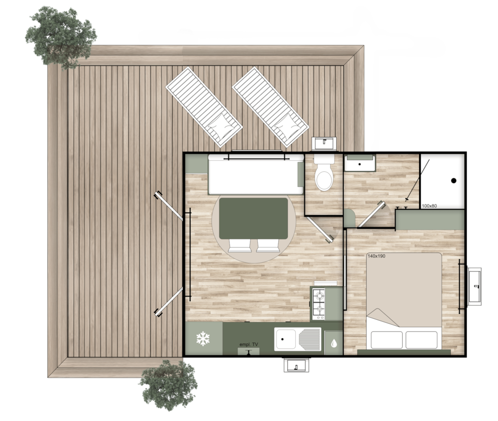 Die Lage, der besonders großer Stellplatz, gut mir Hecken abgetrennt. Dazu die beiden Swimmingpools.