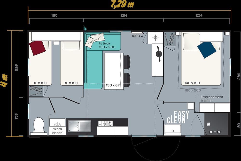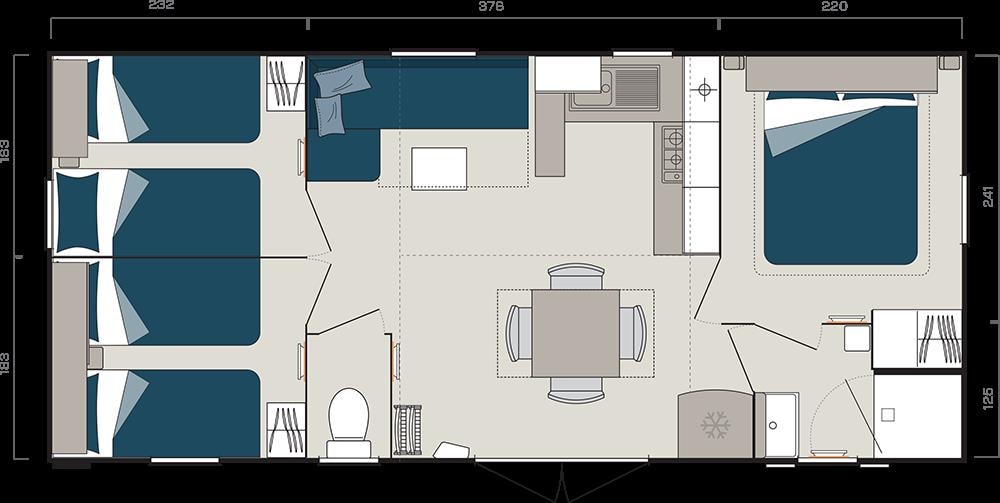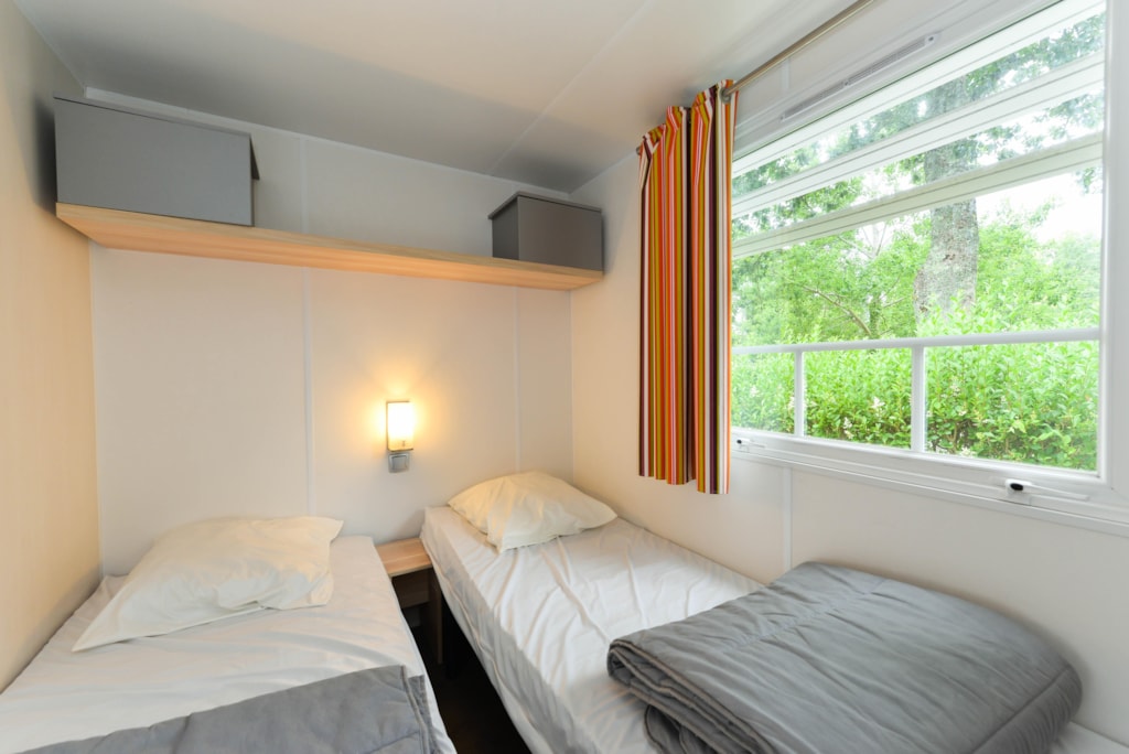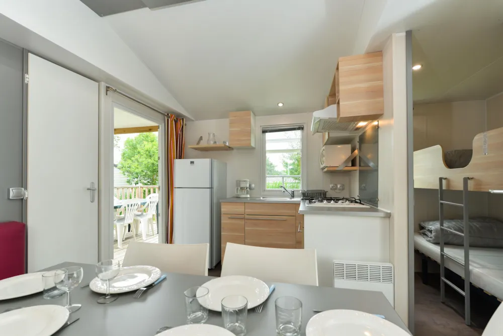 Diese Unterkunft ist ideal für 2 Paare und 2 Kinder oder 1 Paar und 4 Kinder. Mit einer Fläche von 29m² besteht dieses Mobilheim aus: einer ausgestatteten Küche, einem Wohnzimmer mit einer Sitzbank, einem Schlafzimmer mit einem Bett 160 x 190 und Kleiderschrank, einem Schlafzimmer mit 2 Betten 80 x 190 und Kleiderschrank, einem Schlafzimmer mit 2 Etagenbetten 80 x 190, einem Badezimmer mit Dusche-Waschbecken, separatem WC und einer halb überdachten Holzterrasse. Dieses Mobilheim verfügt über eine Heizung im Hauptraum sowie im Badezimmer und in den Schlafzimmern. Bettwäsche, Bettbezüge, Kopfkissenbezüge, Handtücher und Haushaltsprodukte werden nicht bereitgestellt (wir bieten sie als Option an). Alle unsere Mietunterkünfte sind Nichtraucherunterkünfte.