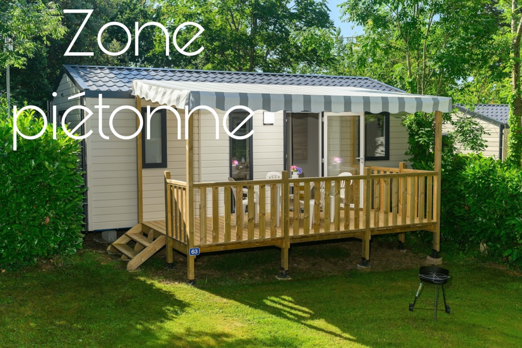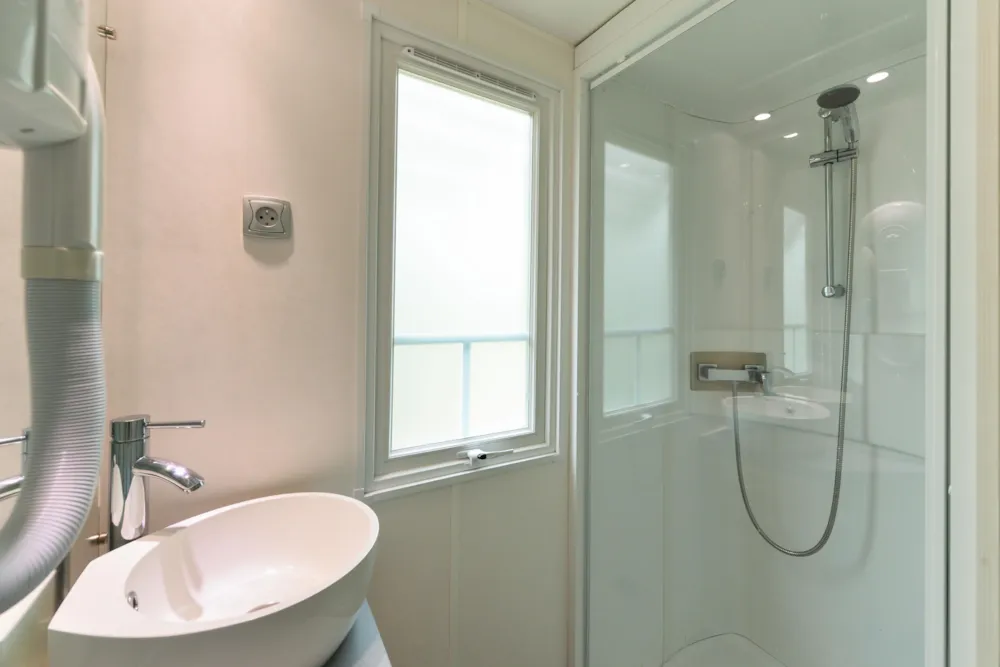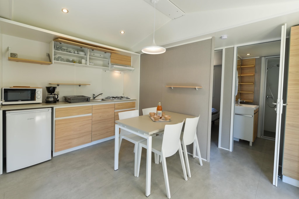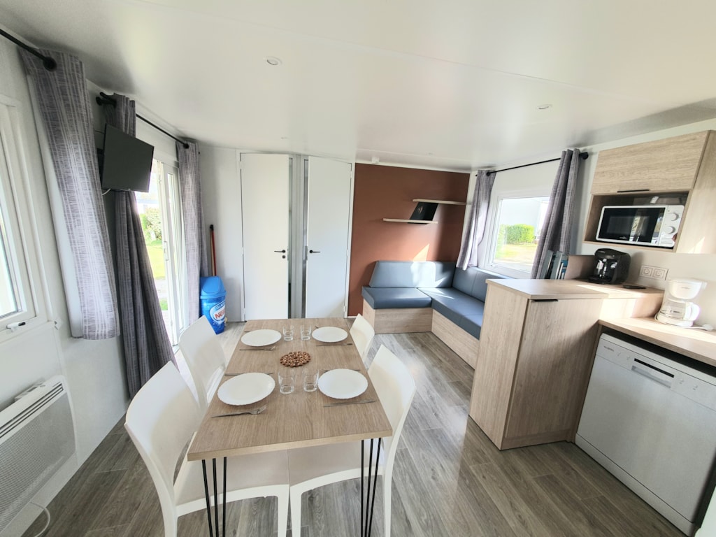 Diese Unterkunft ist ideal für 2 Paare oder 1 Paar und 2 Kinder. Mit einer Fläche von 32m² besteht dieses Mobilheim aus: einer ausgestatteten Küche mit Geschirrspüler für 10 Personen, einem Wohnzimmer mit einer Sitzbank, einem Fernseher, einem Schlafzimmer mit einem Bett 160 x 190, einem zweiten Schlafzimmer mit 2 Betten 90 x 190, einem Badezimmer mit Dusche/Waschbecken und Handtuchtrockner, einem separaten WC und einer großen, überdachten Holzterrasse. Dieses Mobilheim verfügt über eine Heizung im Hauptraum sowie im Badezimmer dank des Handtuchtrockners. Bettwäsche, Bettbezüge, Kopfkissenbezüge, Handtücher und Haushaltsprodukte werden nicht bereitgestellt (wir bieten sie als Option an). Alle unsere Mietunterkünfte sind Nichtraucherunterkünfte.