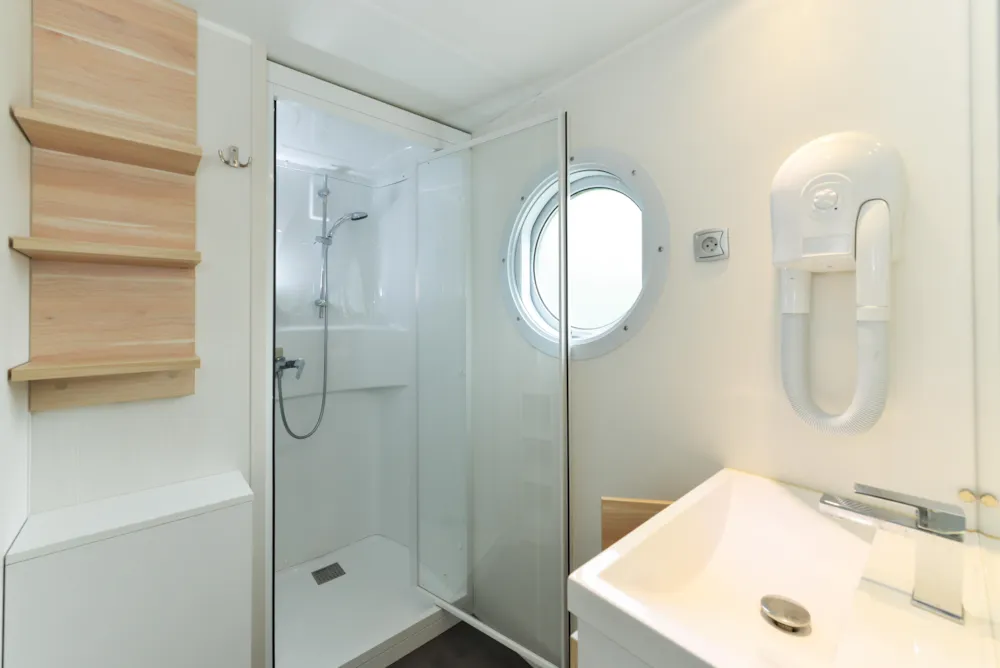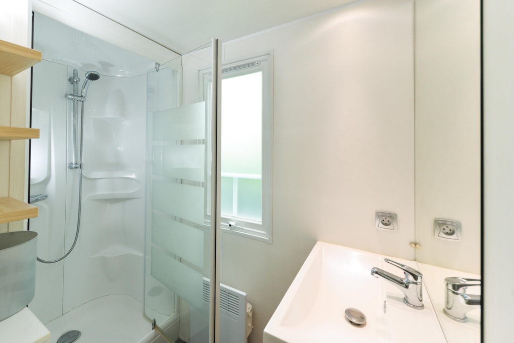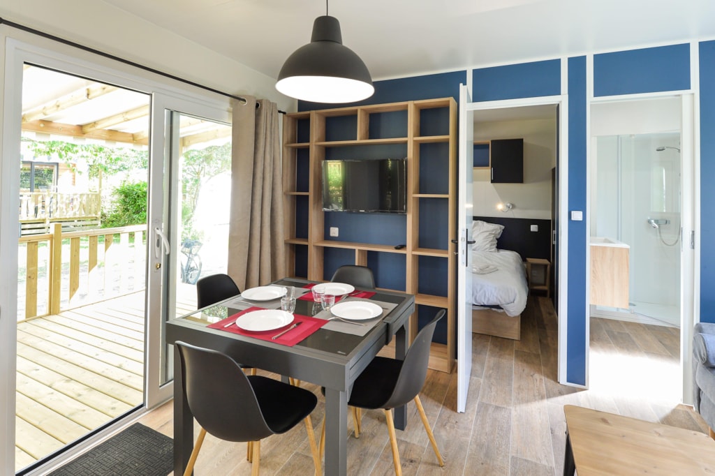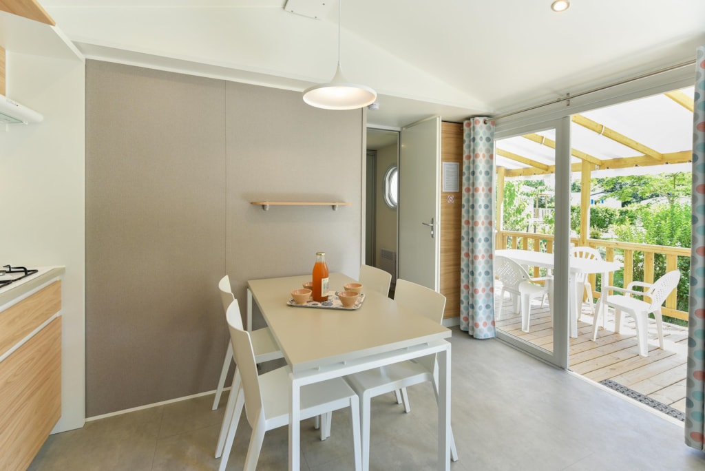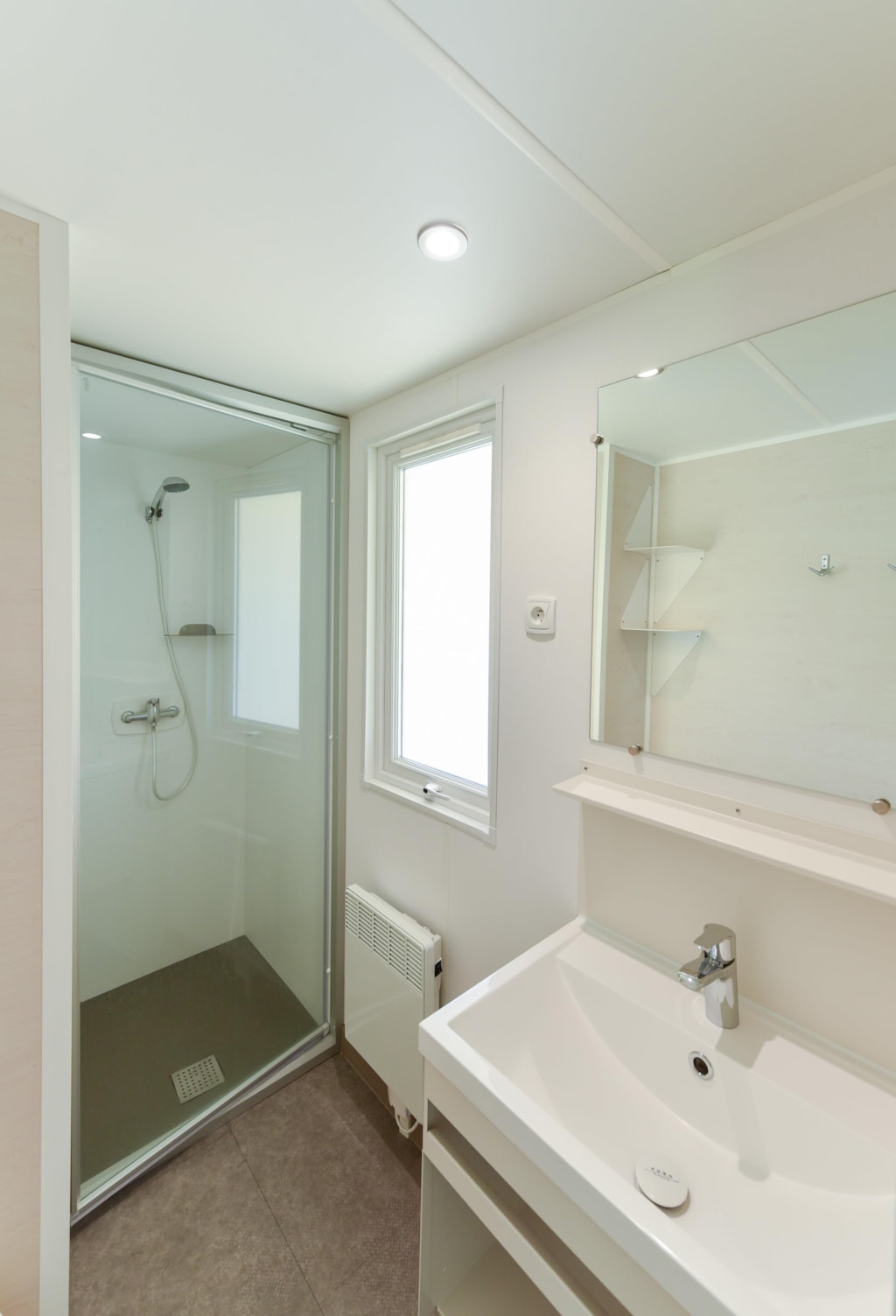 Diese Unterkunft ist ideal für 2 Paare oder 1 Paar und 2 Kinder. Mit einer Fläche von 32m² besteht dieses Mobilheim aus: einer ausgestatteten Küche mit Geschirrspüler für 10 Personen, einem Wohnzimmer mit einer Sitzbank, einem Fernseher, einem Schlafzimmer mit einem Bett 160 x 190, einem zweiten Schlafzimmer mit 2 Betten 90 x 190, einem Badezimmer mit Dusche/Waschbecken und Handtuchtrockner, einem separaten WC und einer großen, überdachten Holzterrasse. Dieses Mobilheim verfügt über eine Heizung im Hauptraum sowie im Badezimmer dank des Handtuchtrockners. Bettwäsche, Bettbezüge, Kopfkissenbezüge, Handtücher und Haushaltsprodukte werden nicht bereitgestellt (wir bieten sie als Option an). Alle unsere Mietunterkünfte sind Nichtraucherunterkünfte.