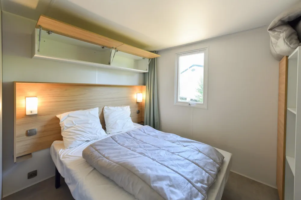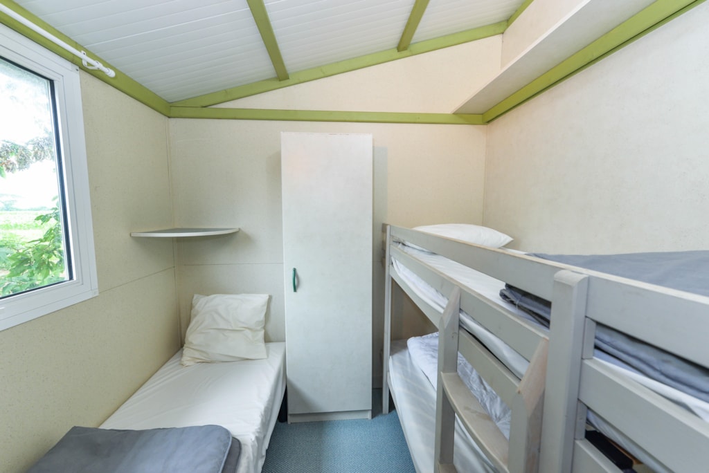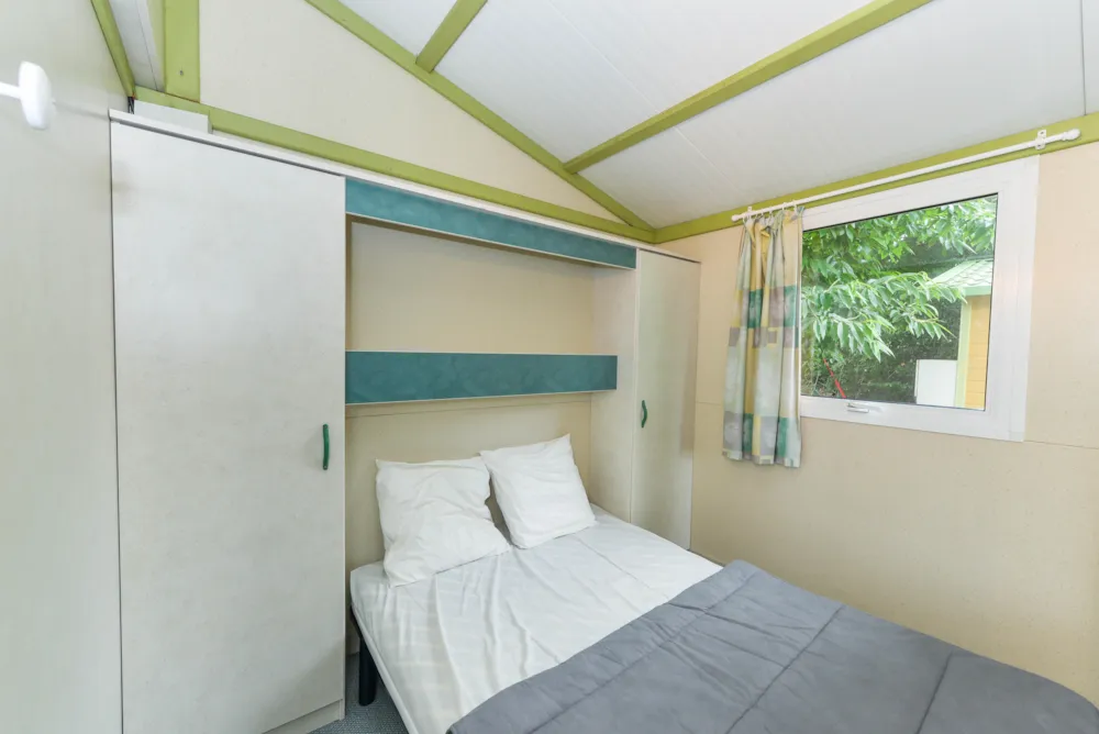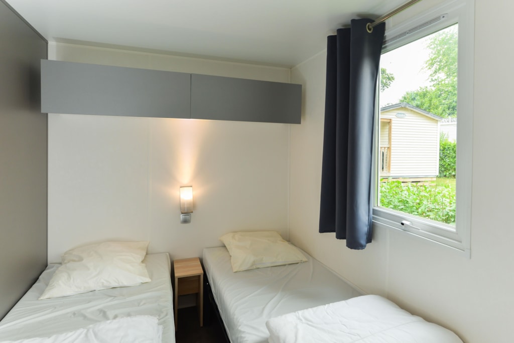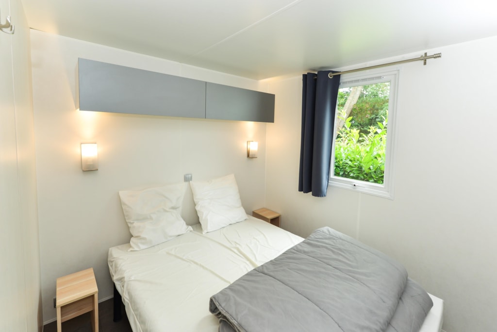 Diese Unterkunft ist ideal für 1 Paar oder 1 Paar und max. 2 Kinder. Mit einer Fläche von 25m² besteht dieses Mobilheim aus: einer ausgestatteten Küche, einem Wohnzimmer mit einer Sitzbank, einem Schlafzimmer mit einem Bett 140 x 190 und Kleiderschrank (oder Babybett-Ecke), einem zweiten Schlafzimmer mit 2 Betten 80 x 190 + Kleiderschrank, einem Badezimmer mit Dusche-Waschbecken, separatem WC und einer halb überdachten Holzterrasse. Dieses Mobilheim verfügt über eine Heizung im Hauptraum sowie im Badezimmer. Bettwäsche, Bettbezüge, Kopfkissenbezüge, Handtücher und Haushaltsprodukte werden nicht bereitgestellt (wir bieten sie als Option an). Alle unsere Mietunterkünfte sind Nichtraucherunterkünfte.