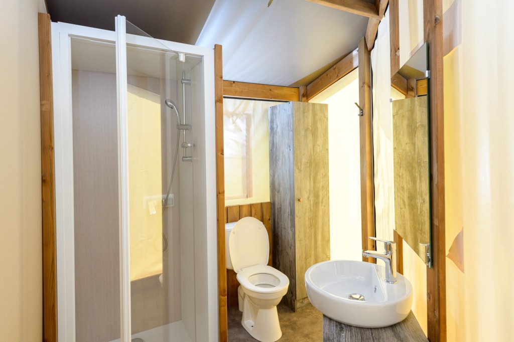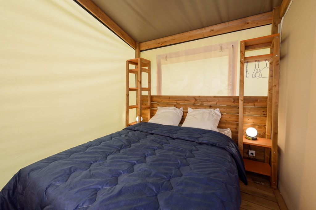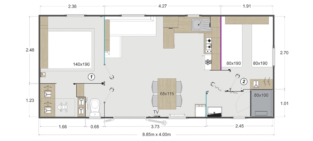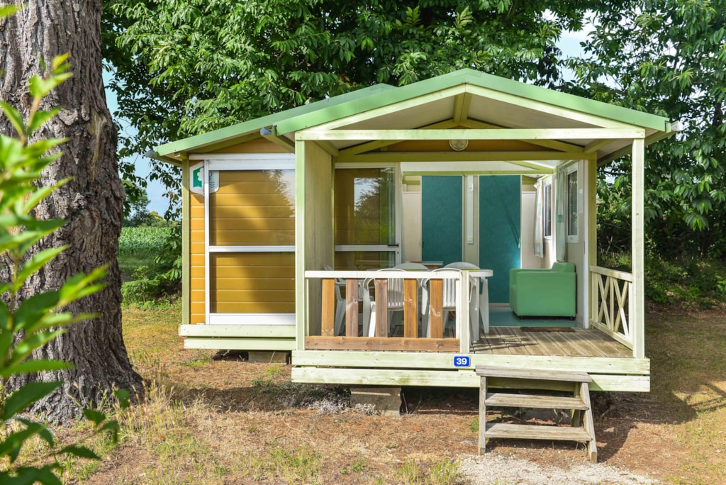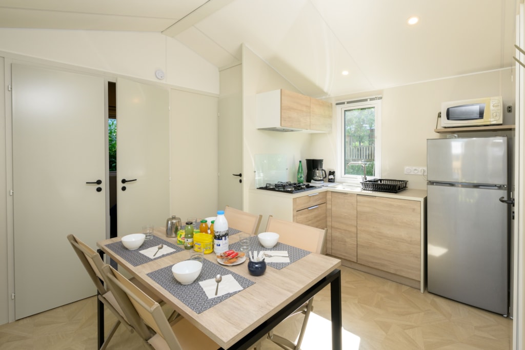 Diese Unterkunft ist ideal für 1 Paar oder 1 Paar und max. 2 Kinder. Mit einer Fläche von 25m² besteht dieses Mobilheim aus: einer ausgestatteten Küche, einem Wohnzimmer mit einer Sitzbank, einem Schlafzimmer mit einem Bett 140 x 190 und Kleiderschrank (oder Babybett-Ecke), einem zweiten Schlafzimmer mit 2 Betten 80 x 190 + Kleiderschrank, einem Badezimmer mit Dusche-Waschbecken, separatem WC und einer halb überdachten Holzterrasse. Dieses Mobilheim verfügt über eine Heizung im Hauptraum sowie im Badezimmer. Bettwäsche, Bettbezüge, Kopfkissenbezüge, Handtücher und Haushaltsprodukte werden nicht bereitgestellt (wir bieten sie als Option an). Alle unsere Mietunterkünfte sind Nichtraucherunterkünfte.