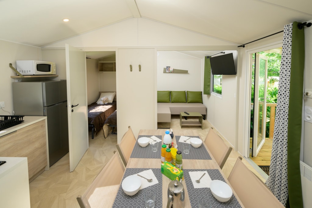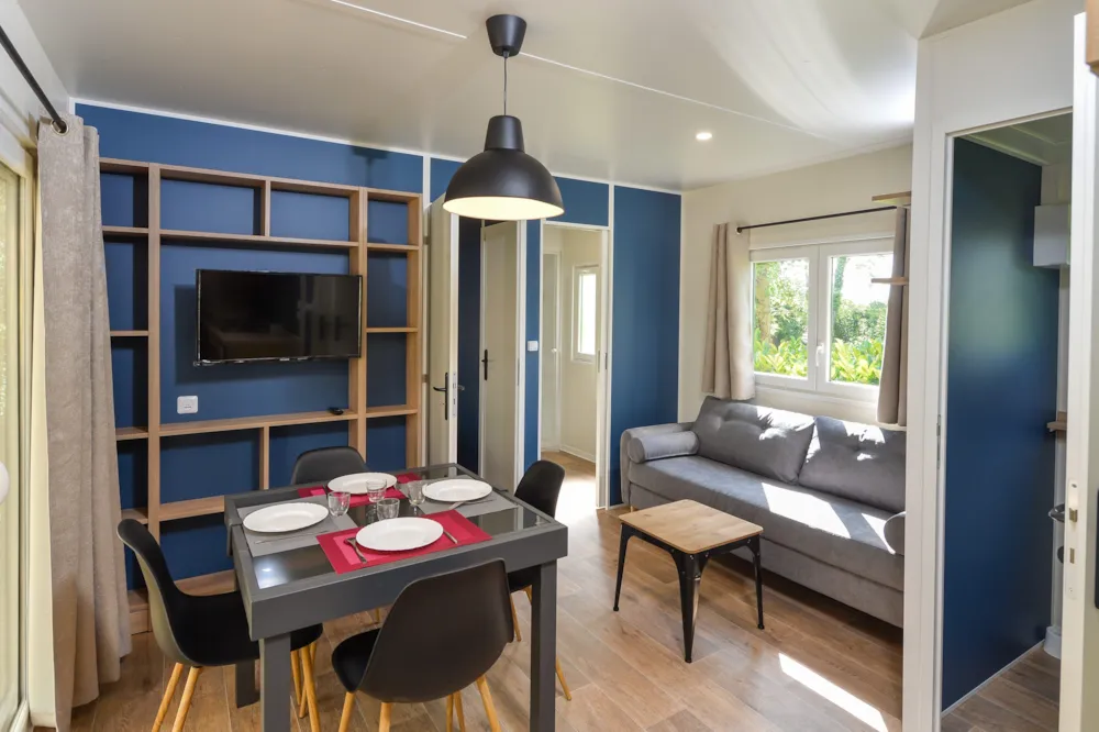 Diese Unterkunft ist ideal für 2 Paare oder 1 Paar und 2 Kinder. Mit einer Fläche von 27m² besteht dieses Mobilheim aus: einer ausgestatteten Küche, einem Wohnzimmer mit einer Sitzbank, einem Fernseher, einem Schlafzimmer mit einem Bett 140 x 190 und einer Ecke für ein Babybett + Kleiderschrank, einem zweiten Schlafzimmer mit 2 Ausziehbetten 80 x 190 + Kleiderschrank, einem Badezimmer mit Dusche-Waschbecken, separatem WC und einer überdachten Holzterrasse. Dieses Mobilheim verfügt über eine Heizung im Hauptraum sowie im Badezimmer. Bettwäsche, Bettbezüge, Kopfkissenbezüge, Handtücher und Haushaltsprodukte werden nicht bereitgestellt (wir bieten sie als Option an). Alle unsere Mietunterkünfte sind Nichtraucherunterkünfte.