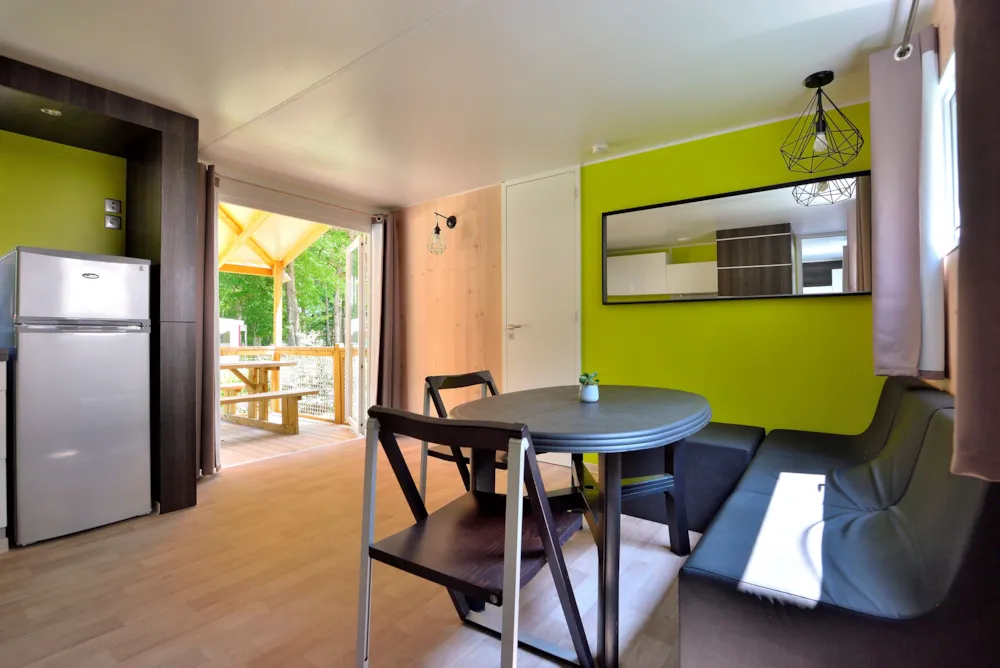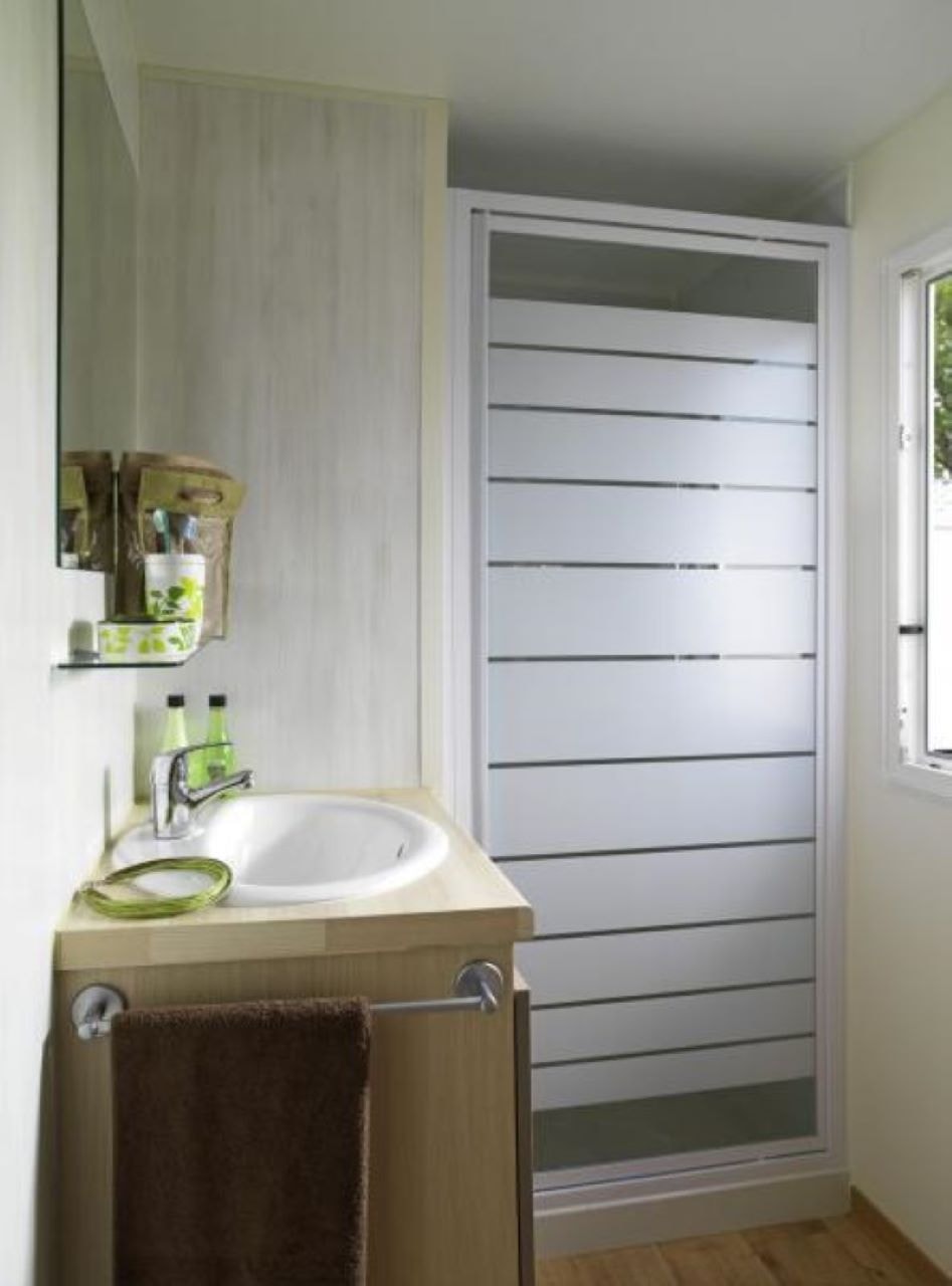 The New Valley cottage has all the comforts you need for your camping stay. It has 2 bedrooms (1 with 1 double bed and 1 with 2 single beds) and can accommodate up to 4 people. You'll also find a fully-equipped kitchen, 2 bathrooms and a semi-covered terrace.