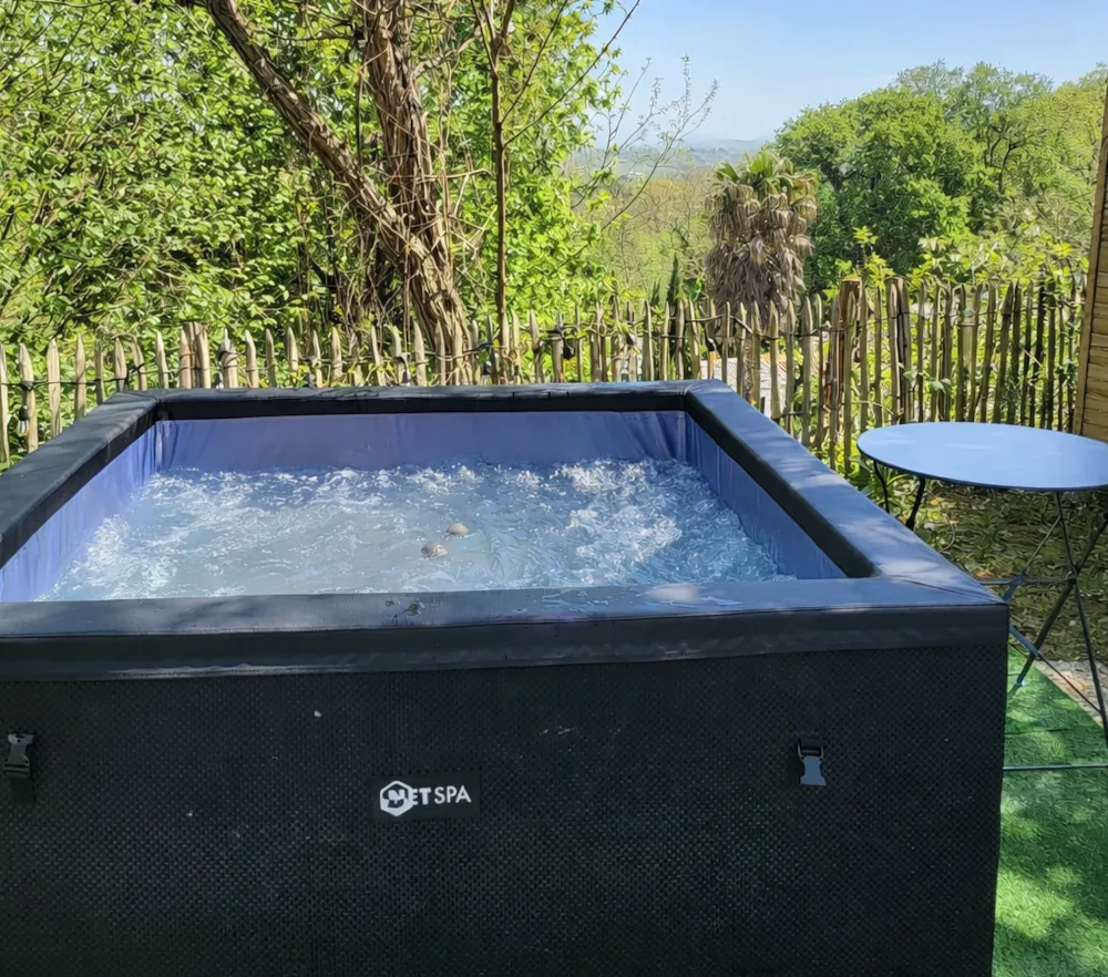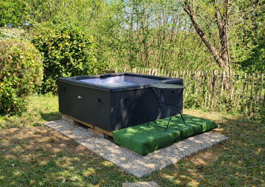 Außen: Blick auf die Natur, komplette Gartenmöbel (1 Tisch, 6 Stühle und 2 Liegestühle) auf einer großen halbüberdachten Holzterrasse, Jacuzzi.