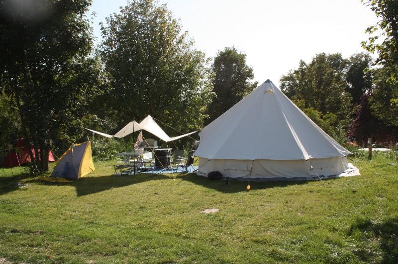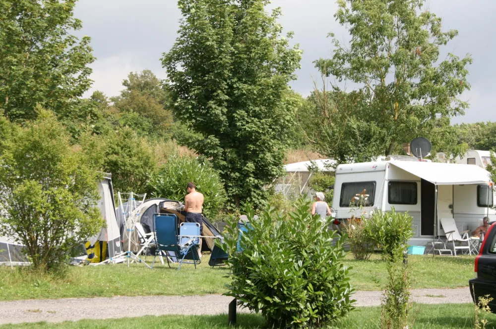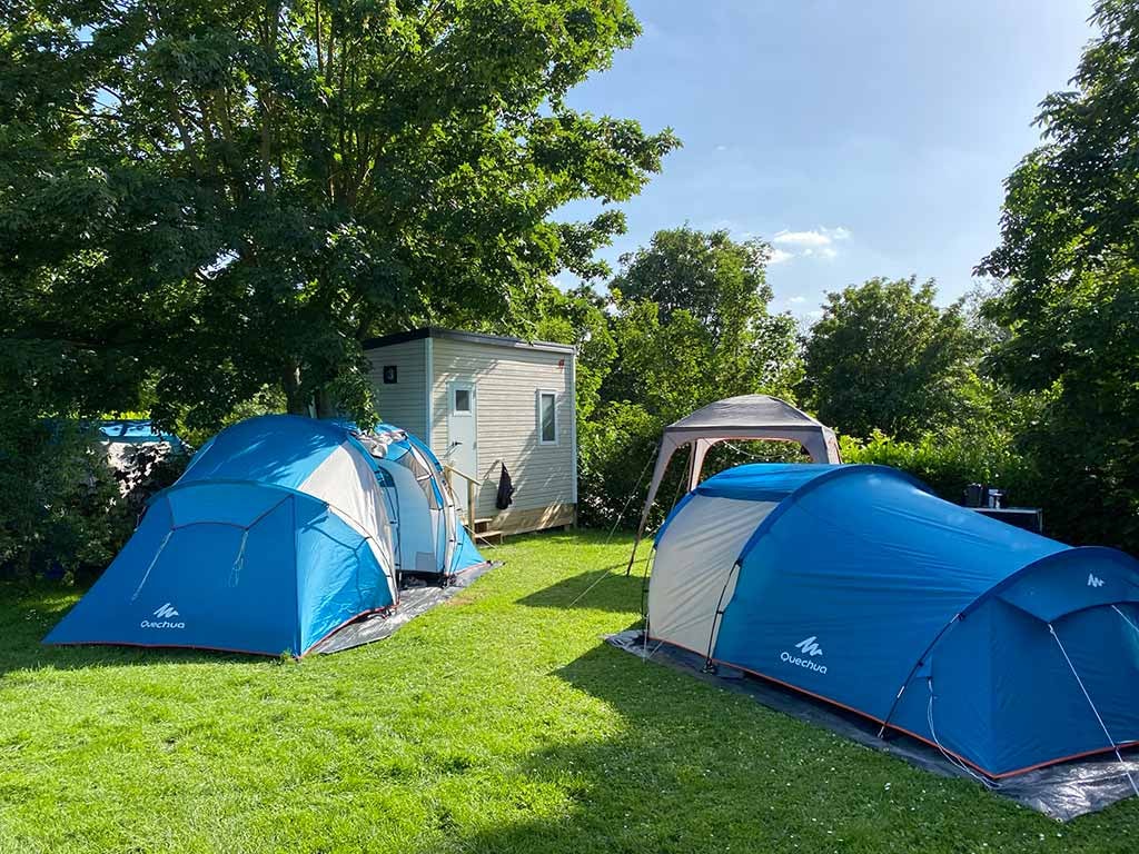 Emplacement camping Grand Confort pour caravane, tente ou camping car. Point d'eau individuel, surface minimum 120m², sanitaire individuel privatif avec douche, lavabo, wc, évier et frigidaire table top