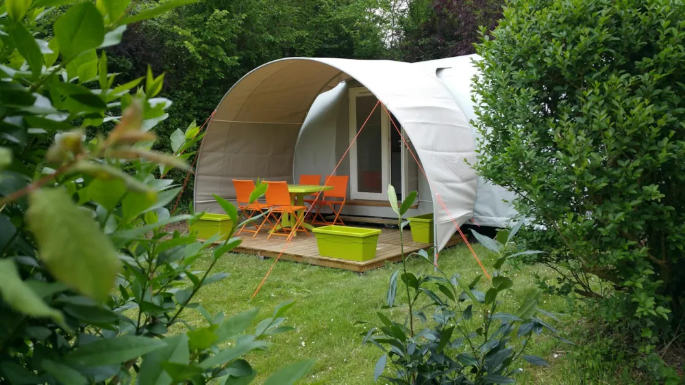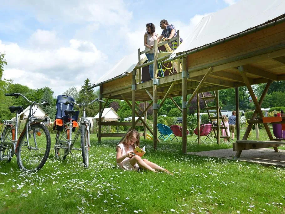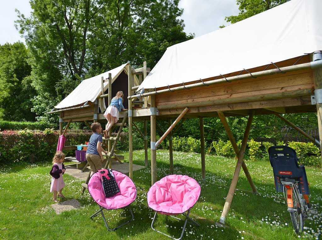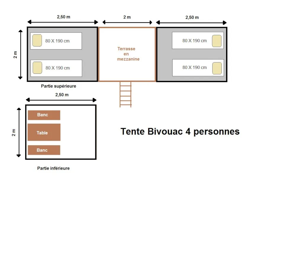 2 tents on stilt connected by a terrace (access by a ladder, not recommended for young children)