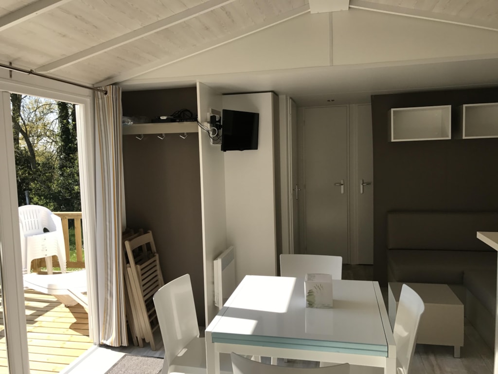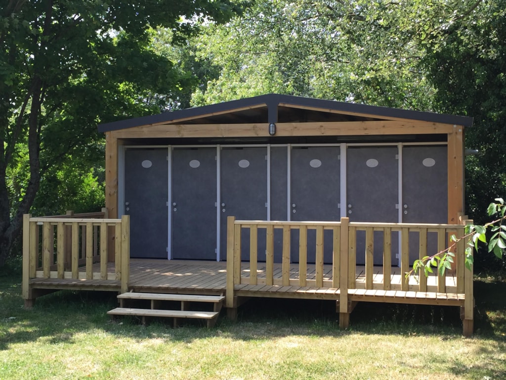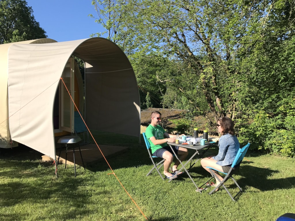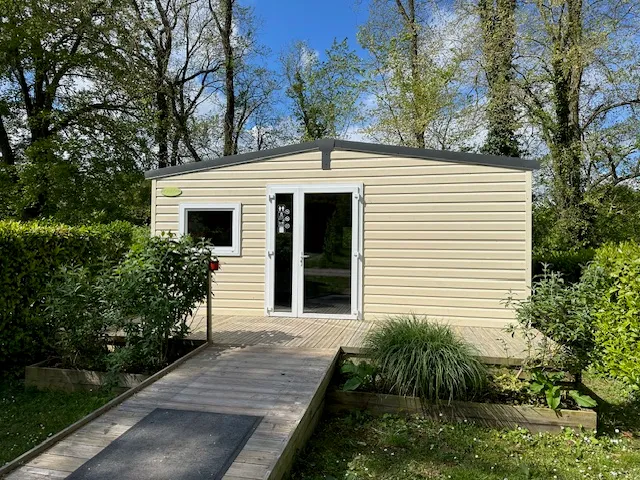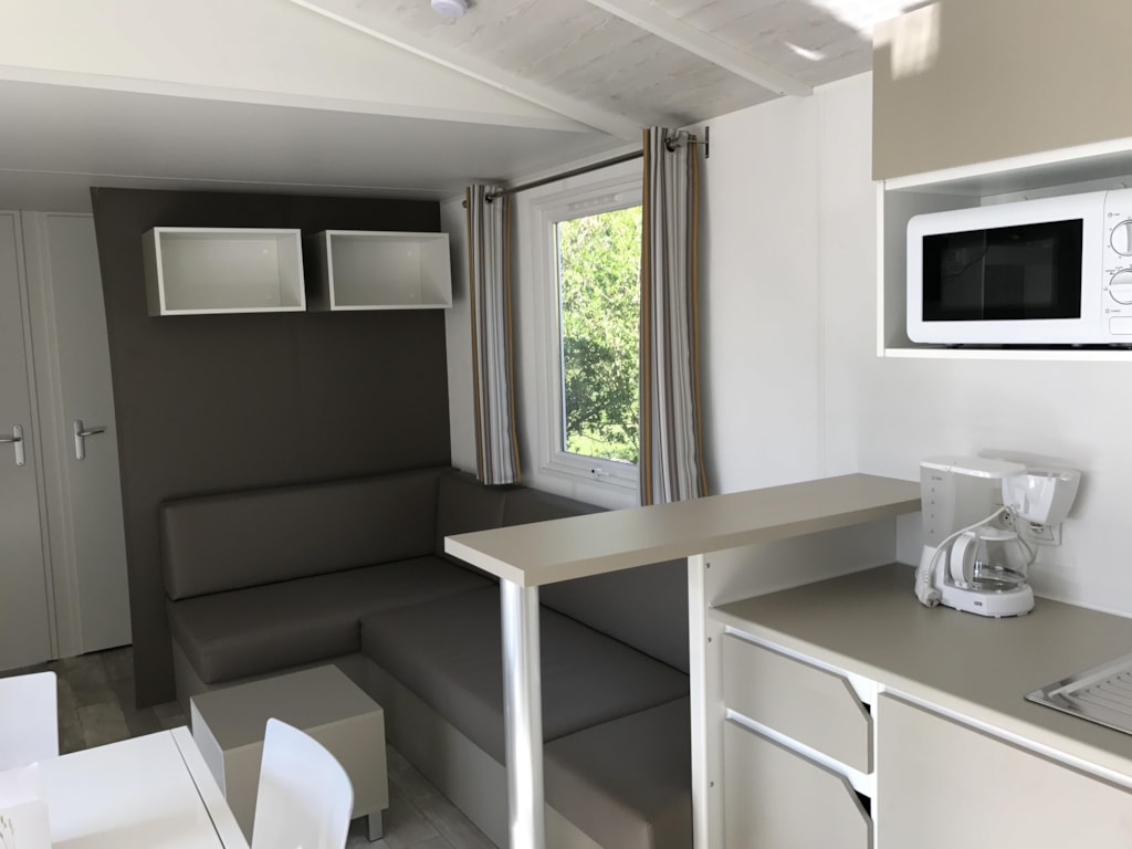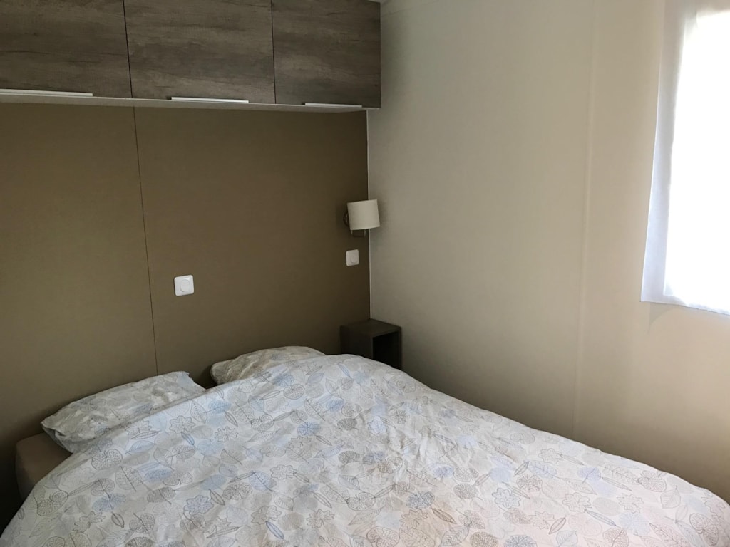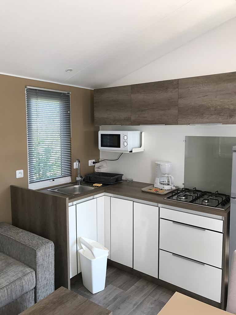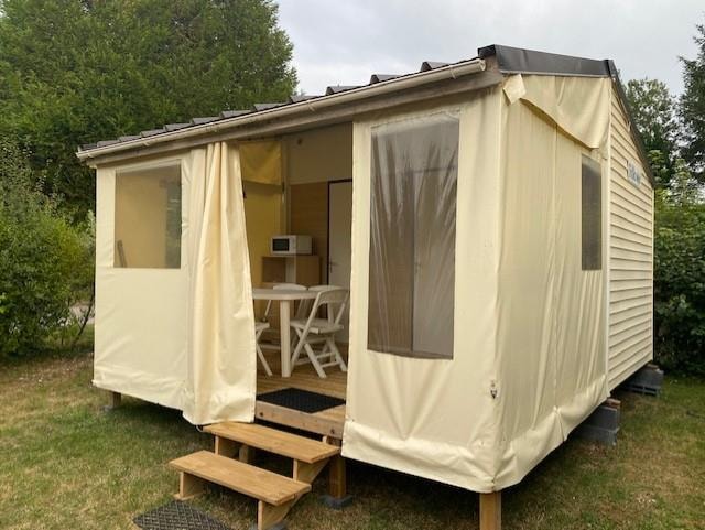 Hébergement moitié mobil home avec deux chambres, l'une avec un lit double, l'autre avec un lit simple, un lit gigogne et un lit cabine, moitié terrasse fermée toilée avec un espace kitchenette comprenant un plaque de cuisson, un micro onde, les ustensiles de cuisine et la vaisselle. Pas de sanitaires ni de douche. Accès aux sanitaires du camping inclus.