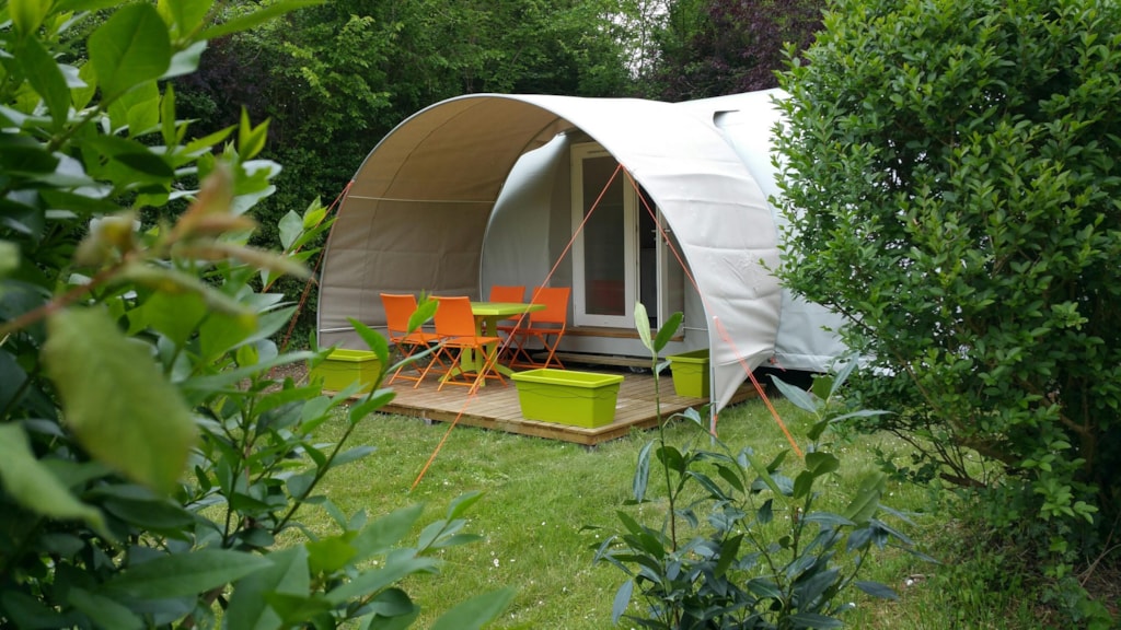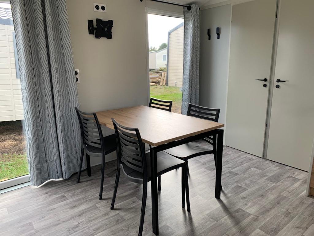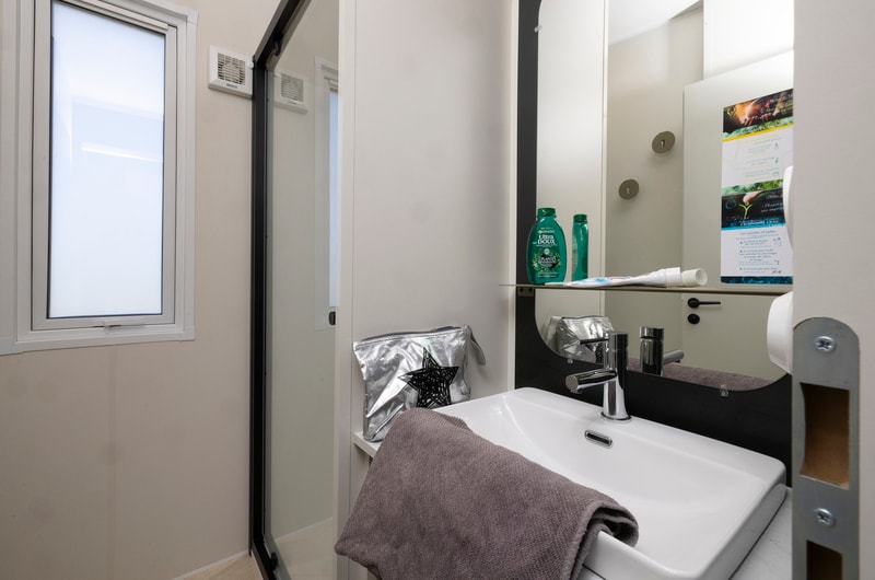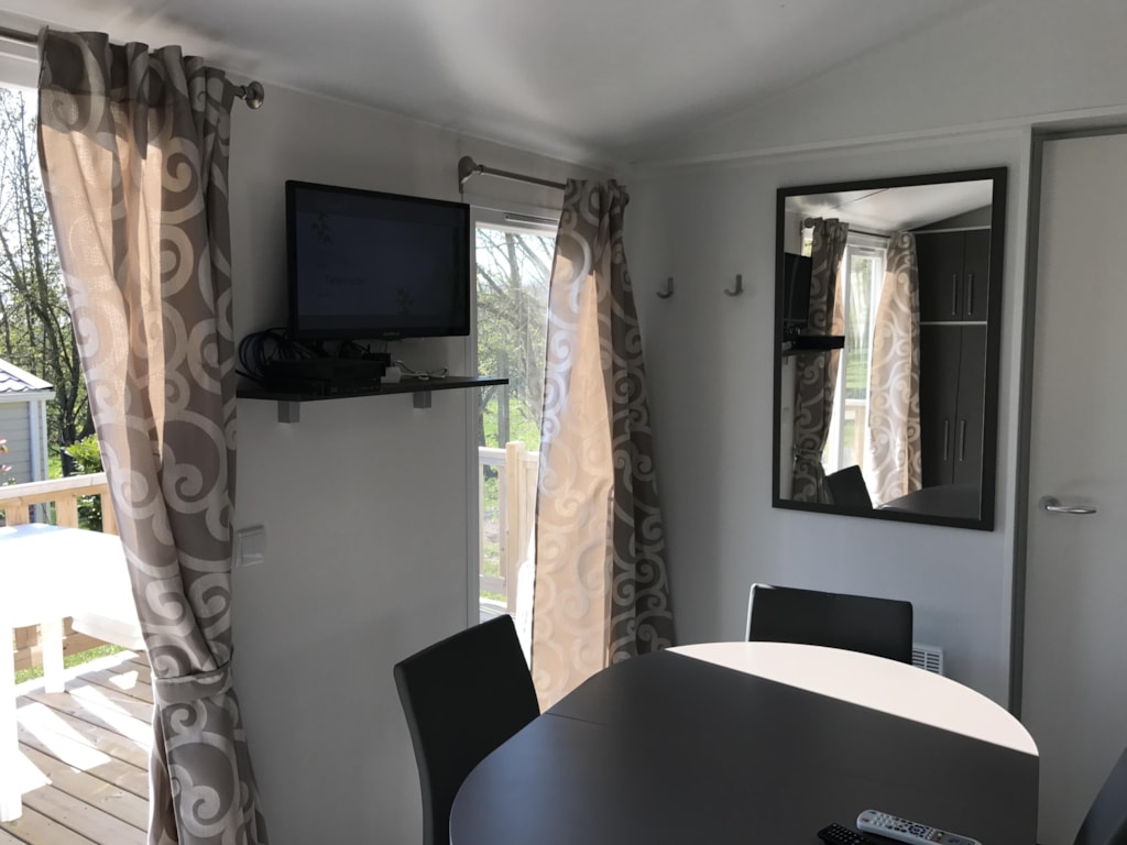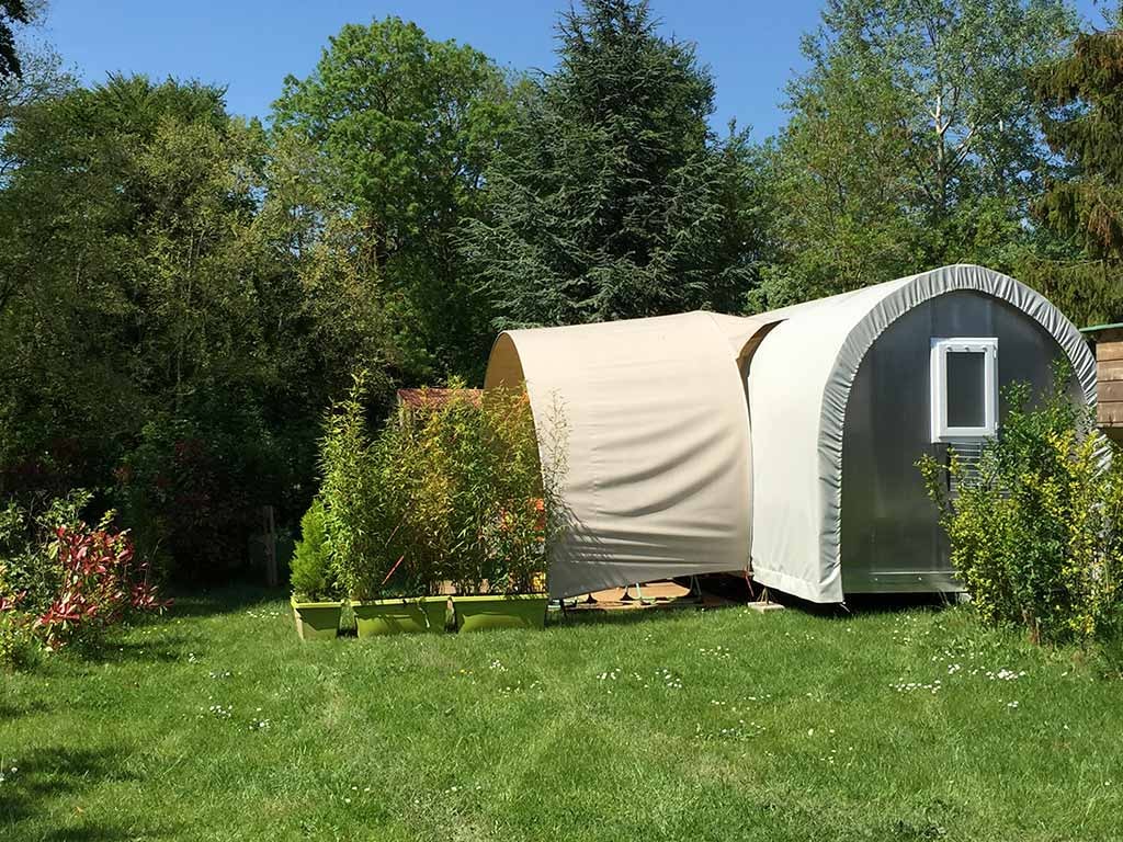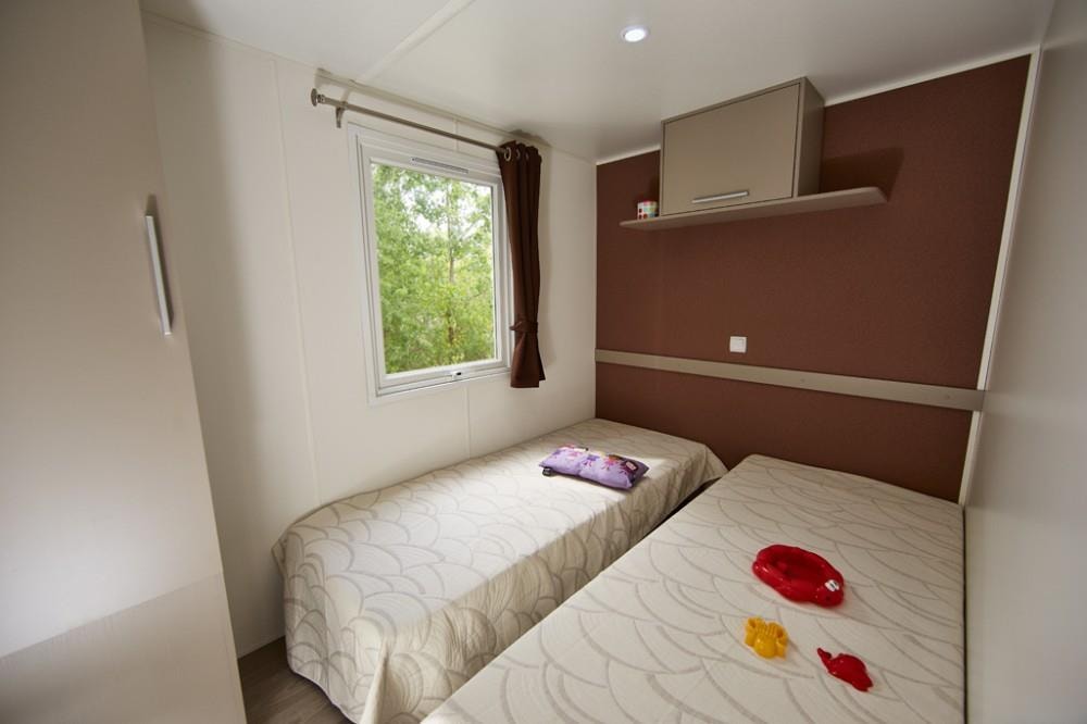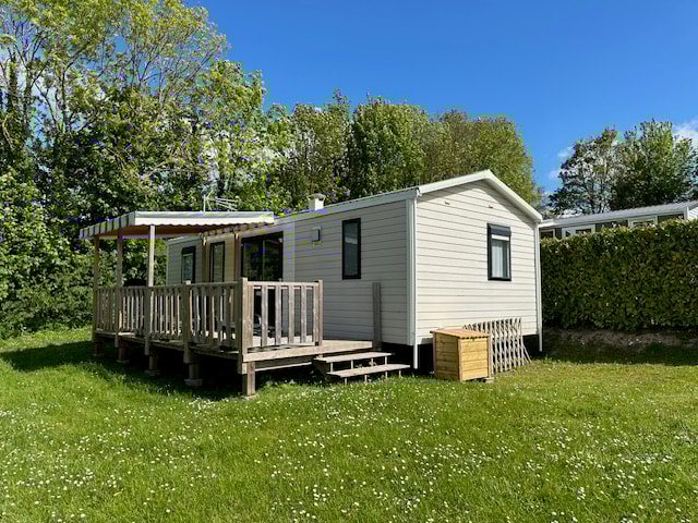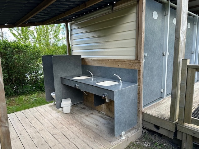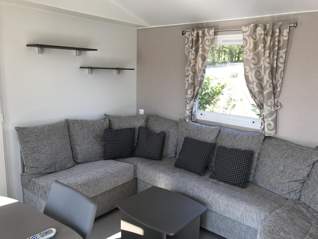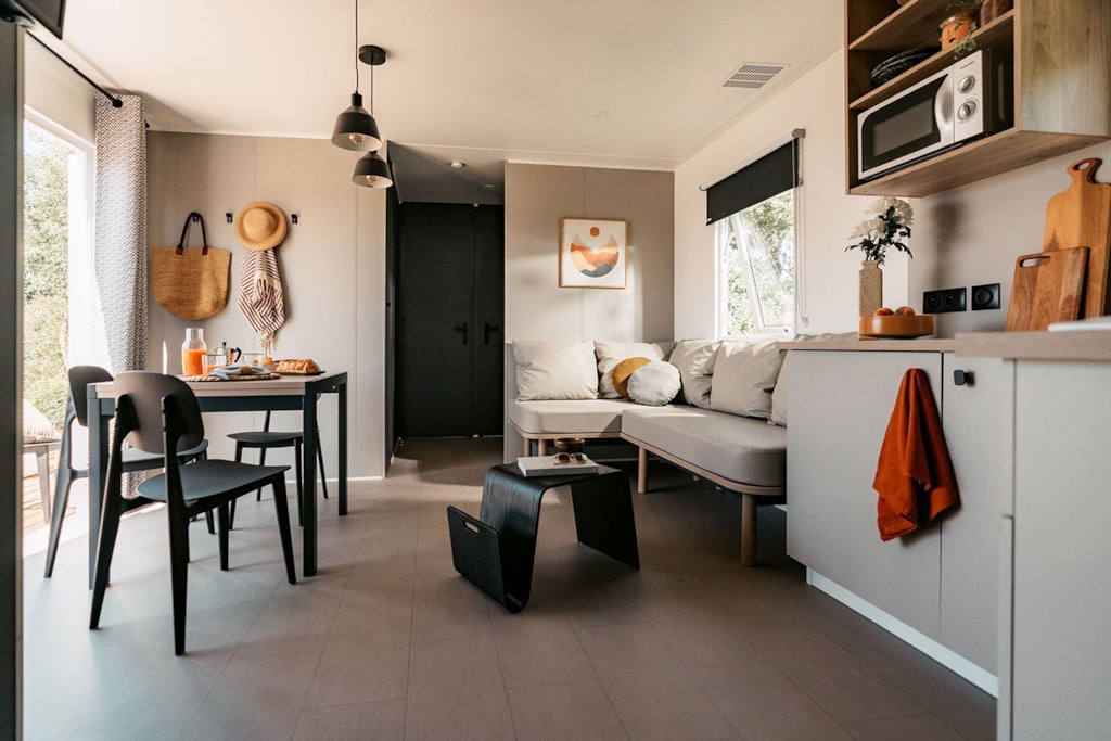 Hébergement moitié mobil home avec deux chambres, l'une avec un lit double, l'autre avec un lit simple, un lit gigogne et un lit cabine, moitié terrasse fermée toilée avec un espace kitchenette comprenant un plaque de cuisson, un micro onde, les ustensiles de cuisine et la vaisselle. Pas de sanitaires ni de douche. Accès aux sanitaires du camping inclus.
