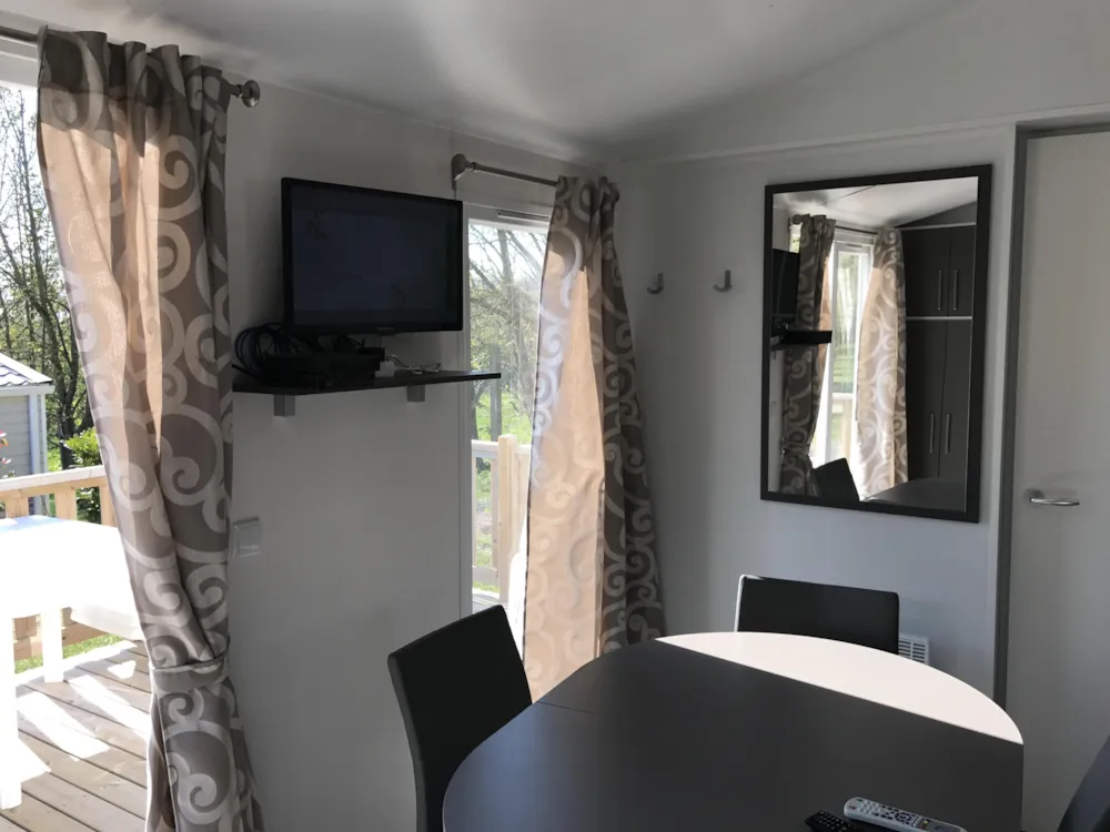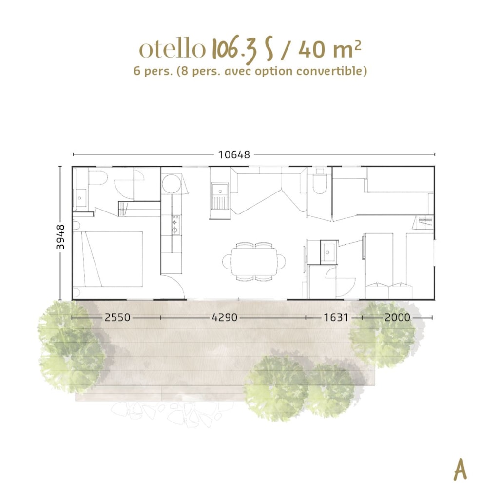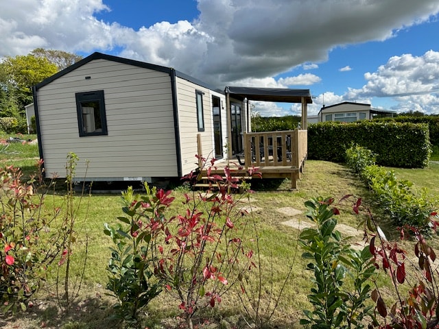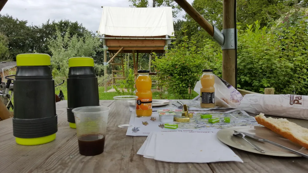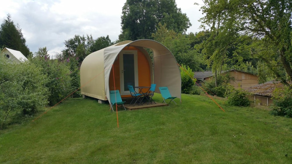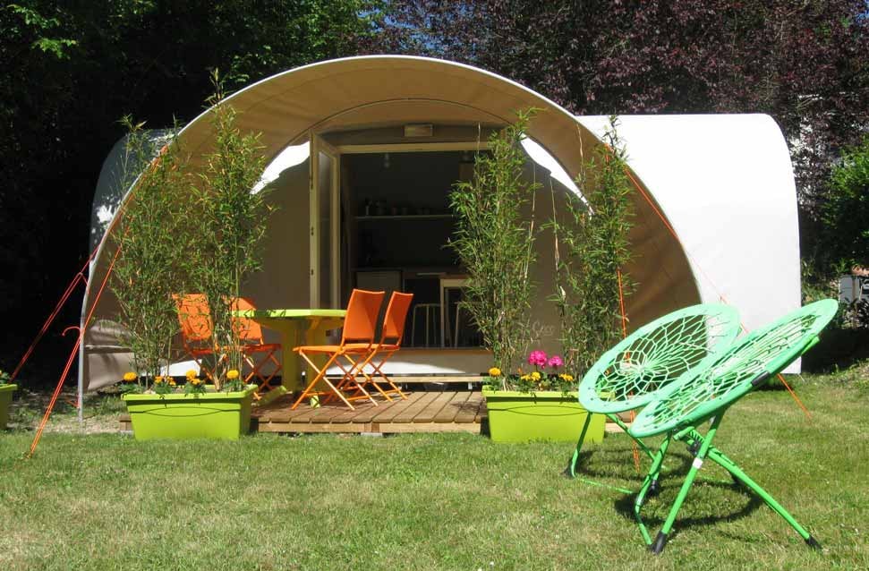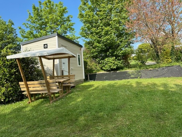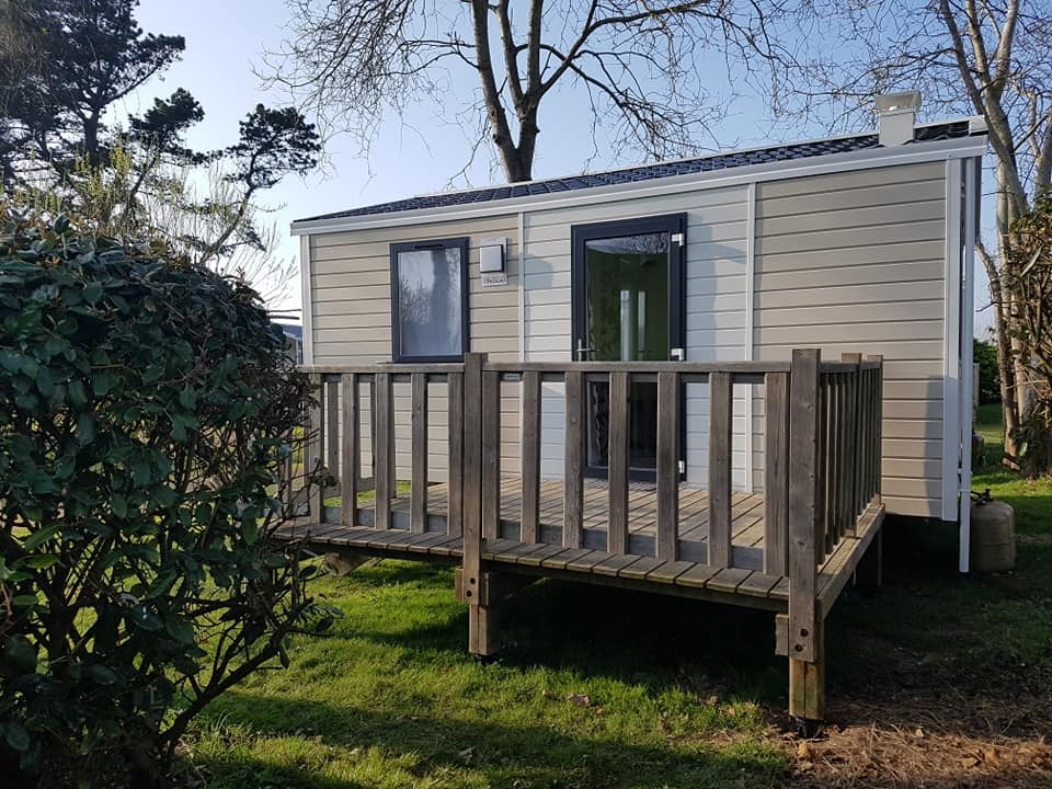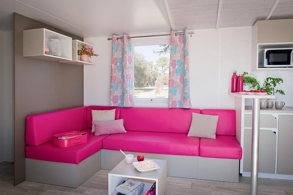 Hébergement moitié mobil home avec deux chambres, l'une avec un lit double, l'autre avec un lit simple, un lit gigogne et un lit cabine, moitié terrasse fermée toilée avec un espace kitchenette comprenant un plaque de cuisson, un micro onde, les ustensiles de cuisine et la vaisselle. Pas de sanitaires ni de douche. Accès aux sanitaires du camping inclus.