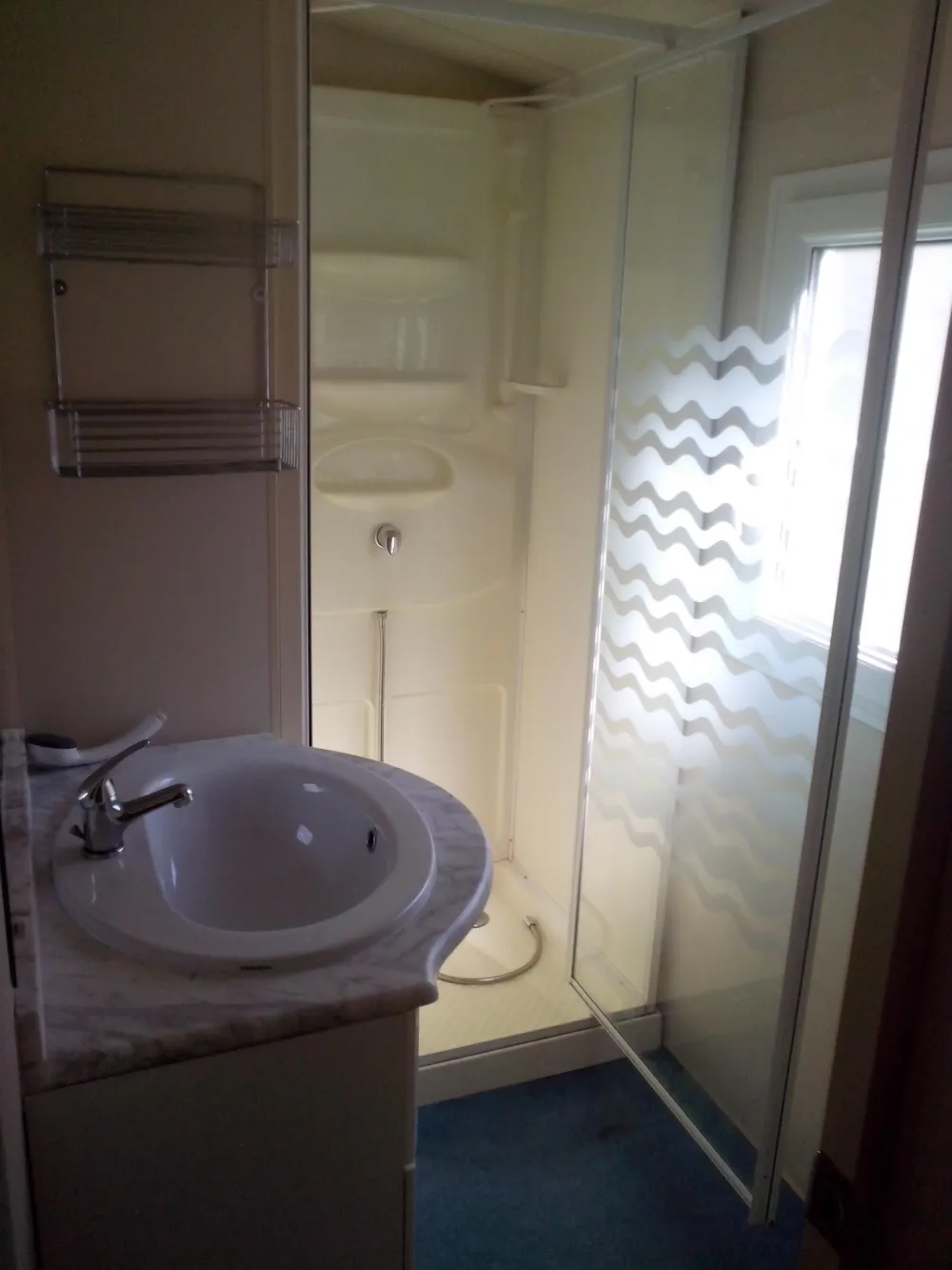 Emplacement tente, caravane , van ou camping-car ombragé comprenant une place de parking et un sanitaire privatif ( une douche + 1 wc + un lavabo + 1 frigo ) + électricité 10 ampères