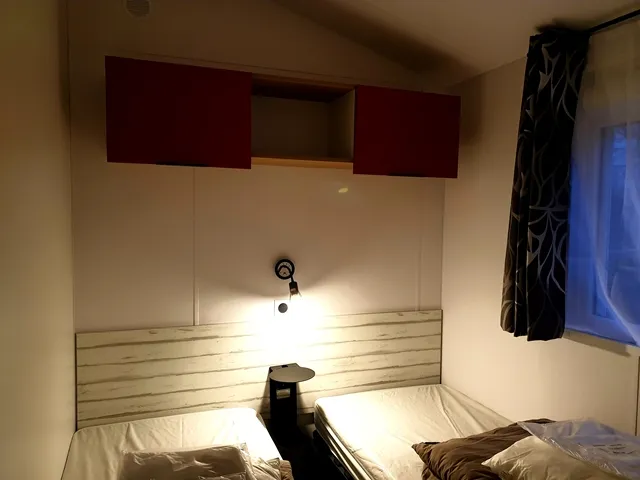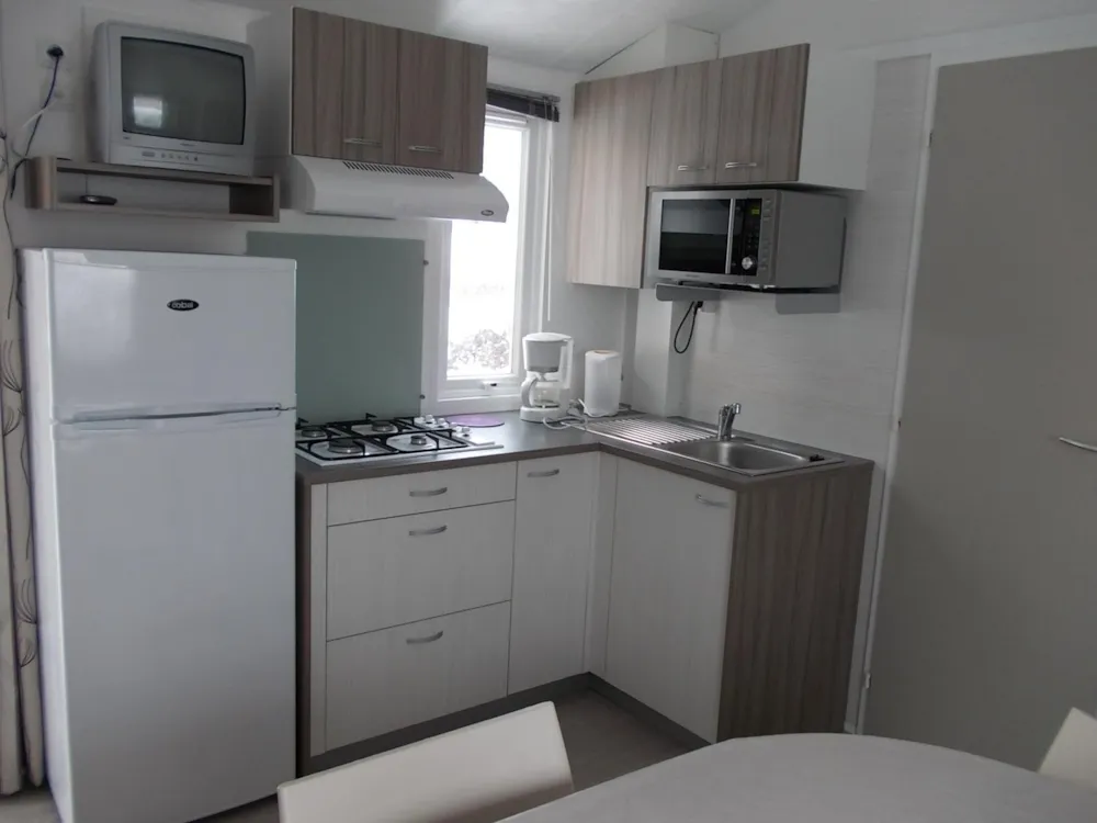 Mobil-Home alle Jahreszeiten von 2013 - 2 Zimmer(Kammern) - 1 elterliches Zimmer(Kammer) mit 1 großem Bett (140 x 190) - 1 Zimmer(Kammer) mit 2 Betten einer Person (80 x 190) - Fensterläden(Blätter) auf allen Kammeröffnungen Küche - 1 drücke 4 Feuer Gas - 1 Ultrakurzwelle Multifunktion - 1 Kaffeekanne(Kneipenwirtin) - 1 vollständiges Küchengeschirr Tiegel, Ofen(Pfanne), Dienst von Teller) - 1 Kühlschrank mit Teil(Seite) friert ein - Salon(Messe) - 1 Bank - 1 TV - 1 Waschraum + getrenntes WC
