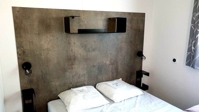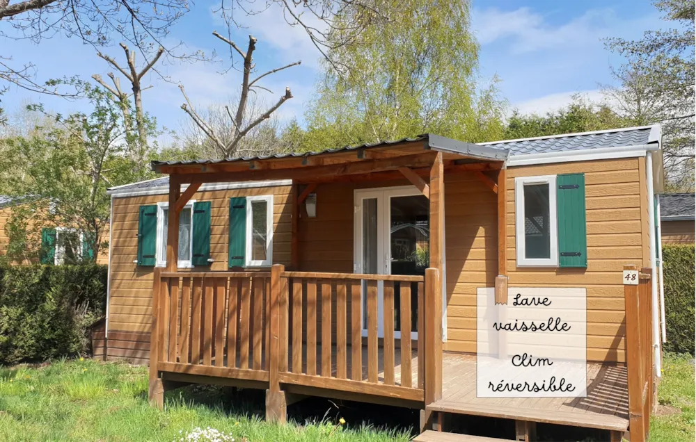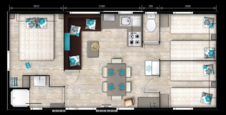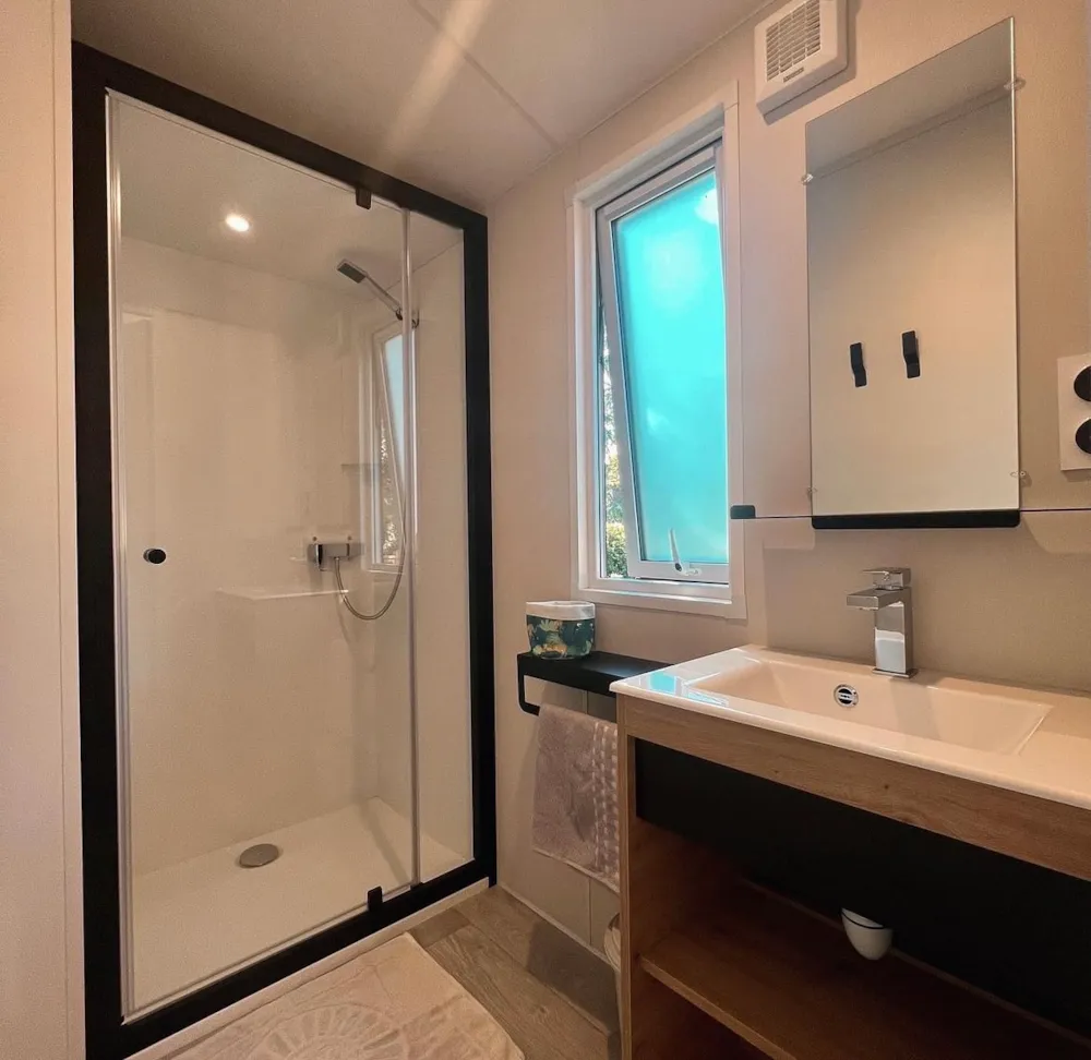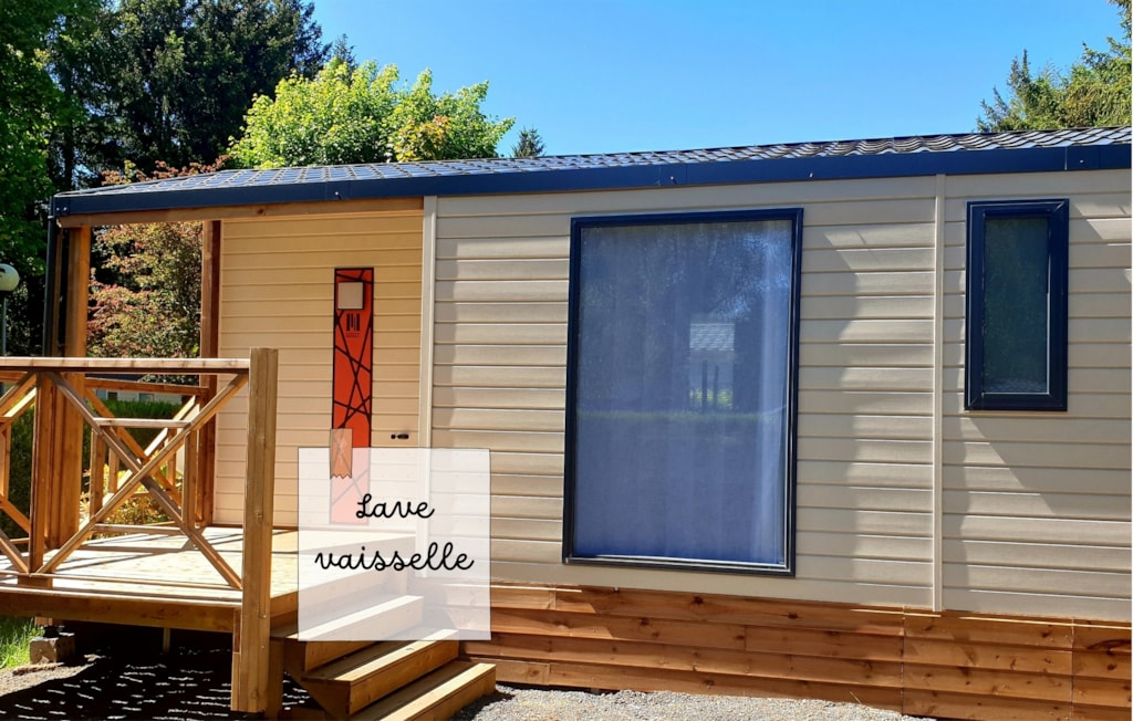 Nos Chalet-Mobil BAHIA sont des modèles de 2023/2024 ils offres une surface de 27 m² + terrasse de 15m² composé : -1 chambre parentale ergonomiques avec meubles ponts, dressing, chevets et liseuses. un lit de 140cm en offrant un bel espace de circulation. pouvant accueillir un lit bébé. -1 Seconde chambre tout aussi spacieuse équipée de 2 lits de 80cm. -1 salle d'eau tout confort, avec douche de 80x100 cm et vasque avec mitigeur, ventilation motorisée. - 1 wc. -1 Cuisine panoramique, totalement ouverte sur l’extérieur grâce à une porte double vitrée et une baie fixe donnant sur la terrasse, équipée, d'une plaque de cuisson gaz 4 feux, d'une hotte encastrée, d'un Lave-vaisselle, d'un micro-onde multifonctions, d'une cafetière filtre et d'un frigo-congélateur. -1 Pièce de vie lumineuse et de belles dimensions elle est équipée d’un grand canapé en L et ouvre sur une terrasse.