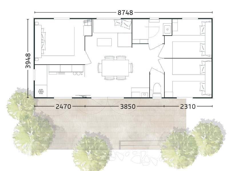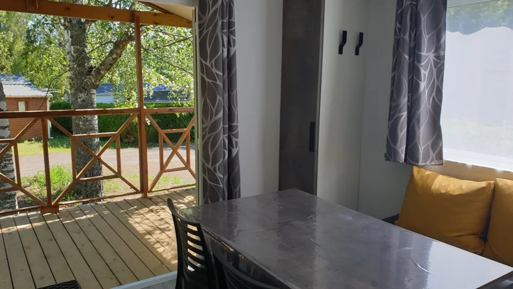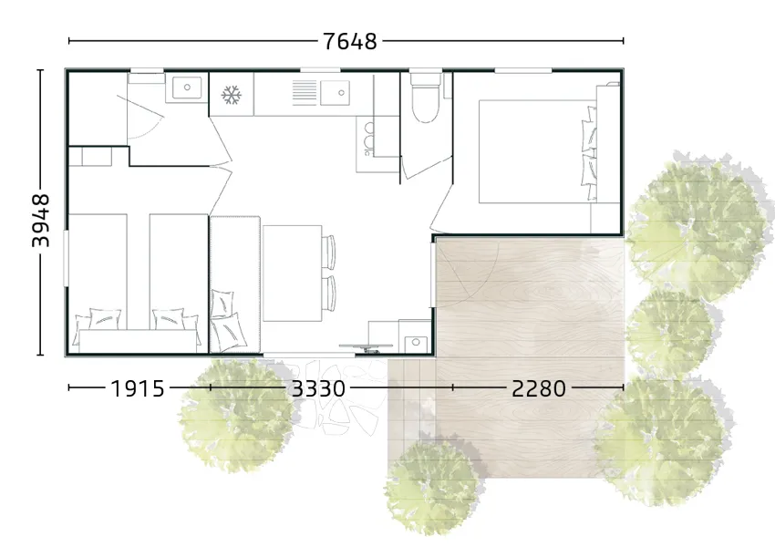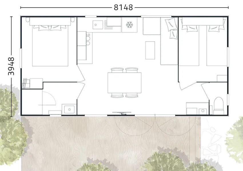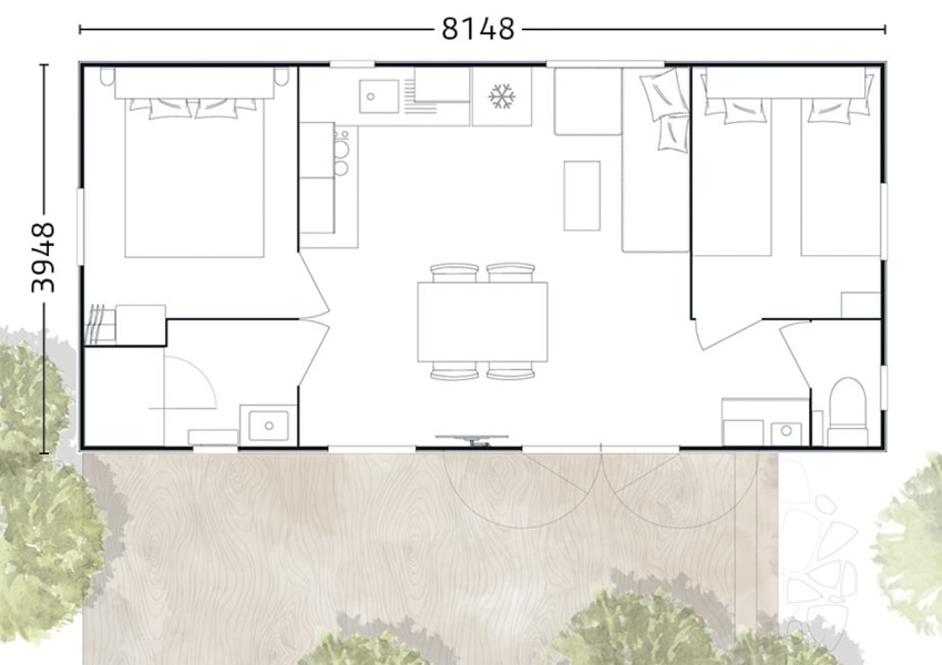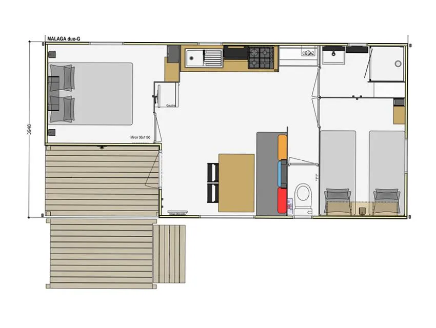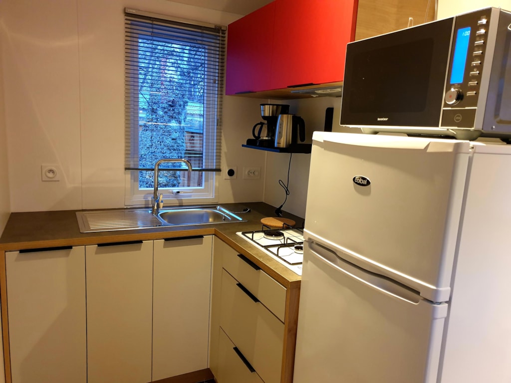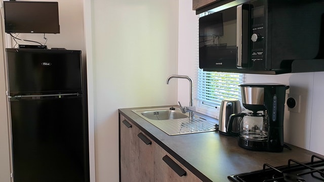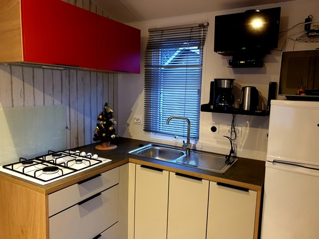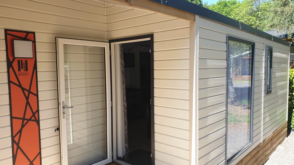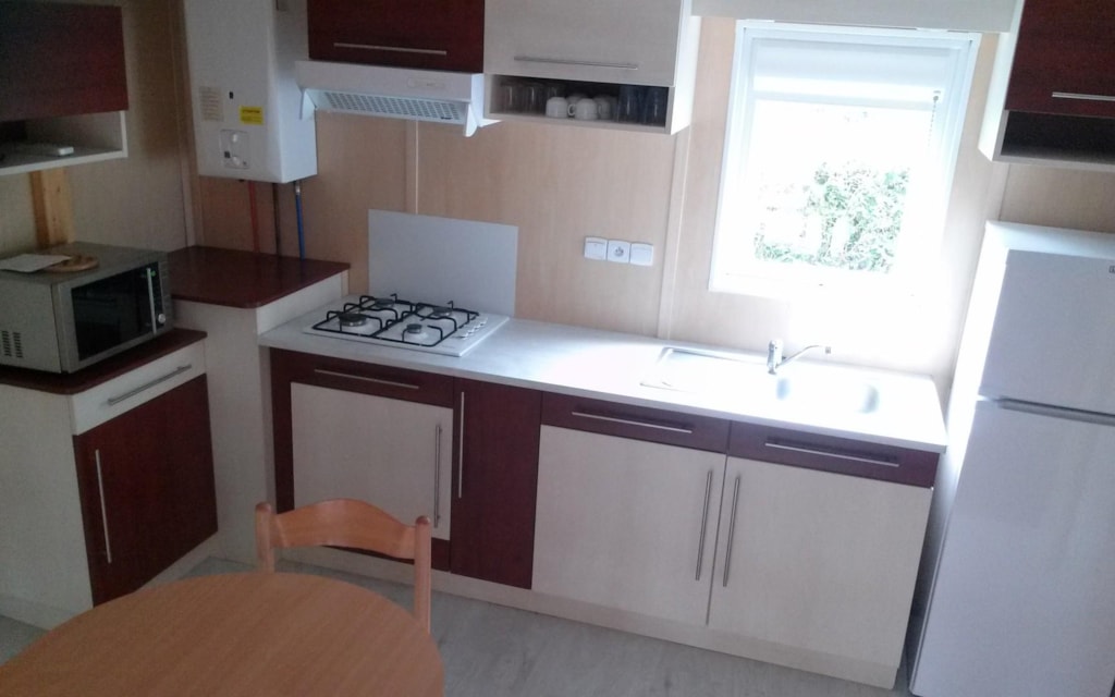 Le Mobile Home Modulo Duo est un modèle de 2021 d'une superficie de 27 m² + terrasse de 15m² composé : -1 chambre parentale ergonomiques avec meubles ponts, équipée d'un lit de 140cm. -1 Seconde chambre équipée de 2 lits de 80cm. -1 salle d'eau tout confort, avec douche de 80x100 cm et vasque avec mitigeur, ventilation motorisée. - 1 wc. -1 Cuisine en L équipée, d'une plaque de cuisson gaz 4 feux, d'une hotte encastrée, d'un micro-onde multifonctions, d'une cafetière filtre et d'un frigo-congélateur. -1 Pièce de vie spacieuse avec 1 salon séparé spécifiquement en retrait afin de le rendre plus agréables., cette pièce de vie est lumineuse et ouverte sur la terrasse.