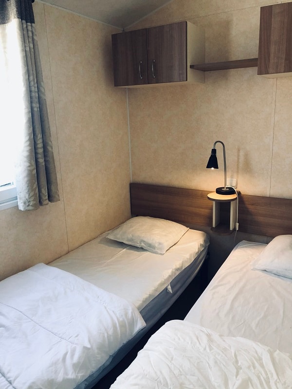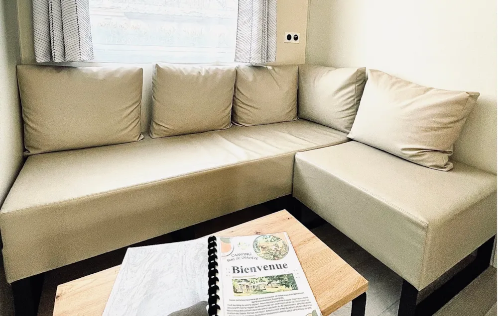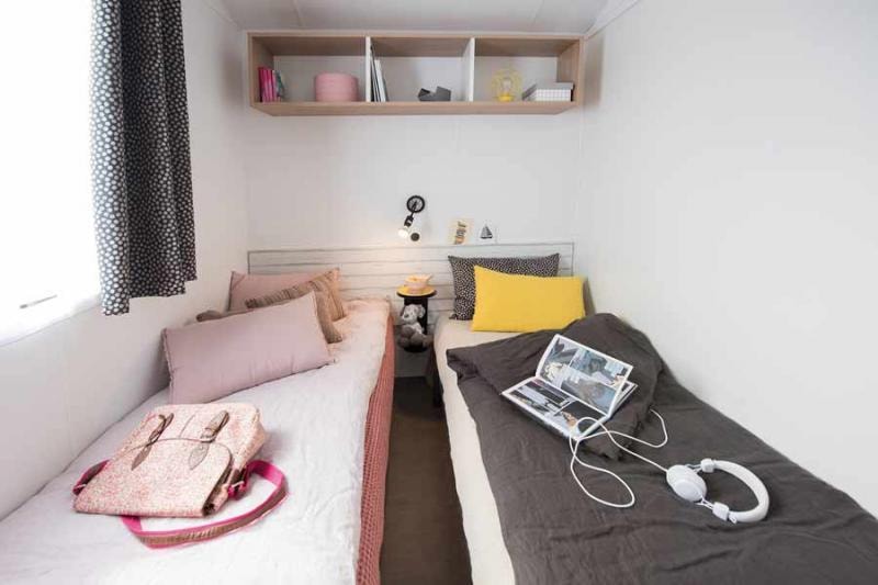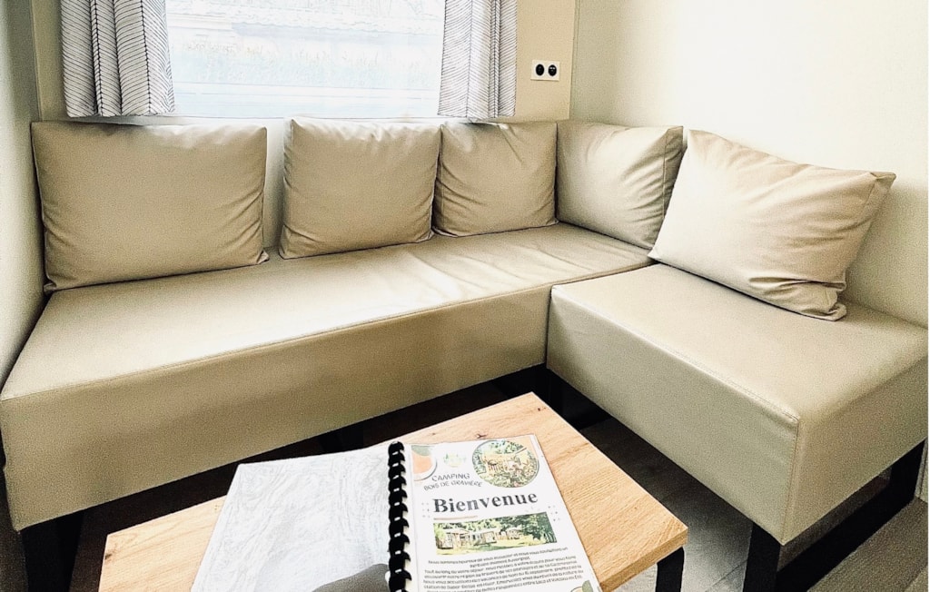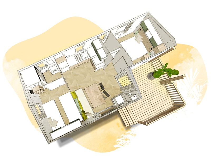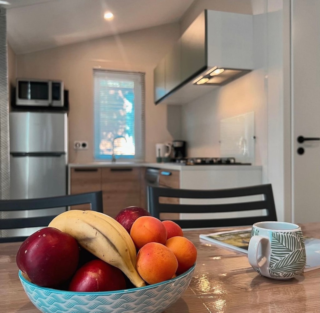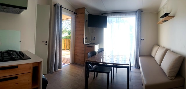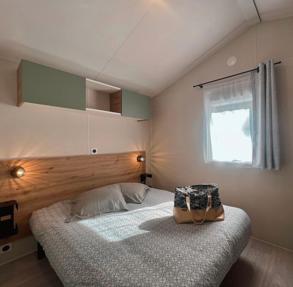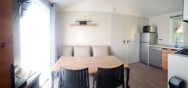 Le Bergame est un modèle de 2023, ouvert et tourné vers l’extérieur sa cuisine est panoramique et fonctionnelle avec un coin repas des plus lumineux, équipée d'une plaque 4 feux gaz , d'un micro-onde multifonction, d'une cafetière filtre, d'un frigo congélateur et ouvrant directement sur la terrasse. La pièce de vie spacieuse et ouvre directement sur la terrasse. le salon est lumineux et décline de belles dimensions. Il est équipé d’une grande banquette d'angle. Cet agencement permet à l’espace salon d’être au plus proche de la lumière. La chambre parentale et équipée d'un lit de 140x190cm et peut facilement accueillir un lit bébé, les deux autres chambres accueille chacune 2 lits d'une personne de 80cm une salle d'eau avec douche de 80cm et vasque et des wc séparé complète l'aménagement