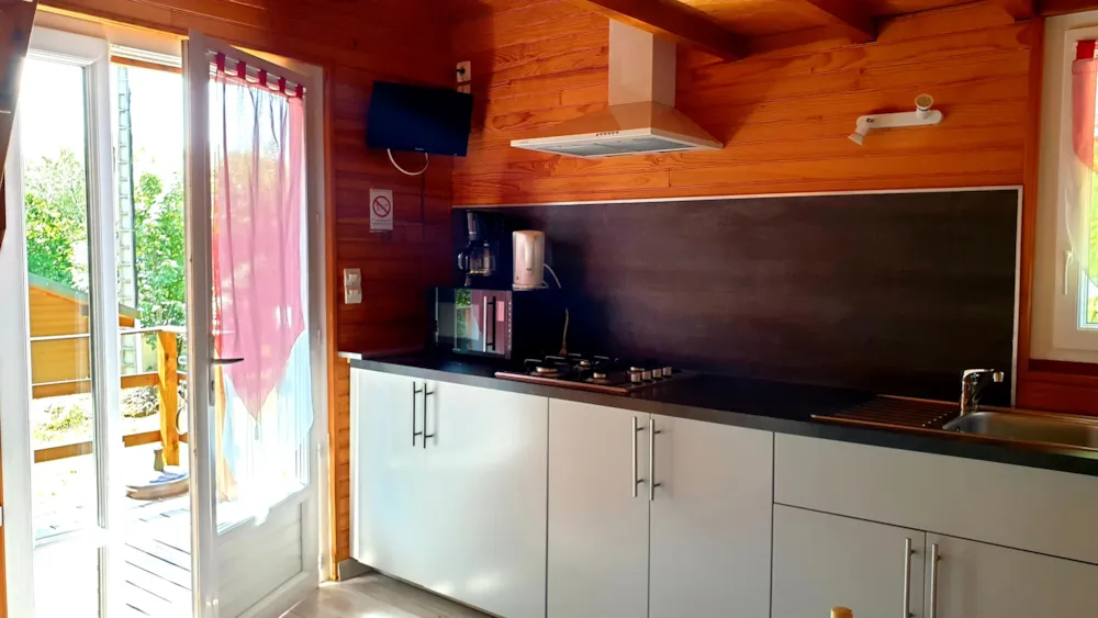 Le chalet tradition 6 personnes à une superficie de 35m² + terrasse de 15m² entièrement couverte il se compose : -d'1chambre parentale spacieuse pouvant accueillir 1 lit bébé meublé d'un lit de 140cm et de rangement pont - de 2 chambres équipée de 2 lits de 80cm chacune, il est possible de rapprocher les lits dans une,ce qui permet d'accueillir 2 couples. -d'1 salle d'eau avec douche de 80cm et vasque -d'1 wc séparé -d’une cuisine en enfilade avec de nombreux rangement, équipée d'une plaque de cuisson gaz 4 feux , d'une réfrigérateur congélateur, d'une hotte encastrée, d'un four micro-onde multifonction et d'un lave-vaisselle - d'une pièce de vie large et fonctionnelle, avec un séjour/coin repas spacieux doté d’une grande ouverture permettant d'accéder directement sur une terrasse couverte de 15m².