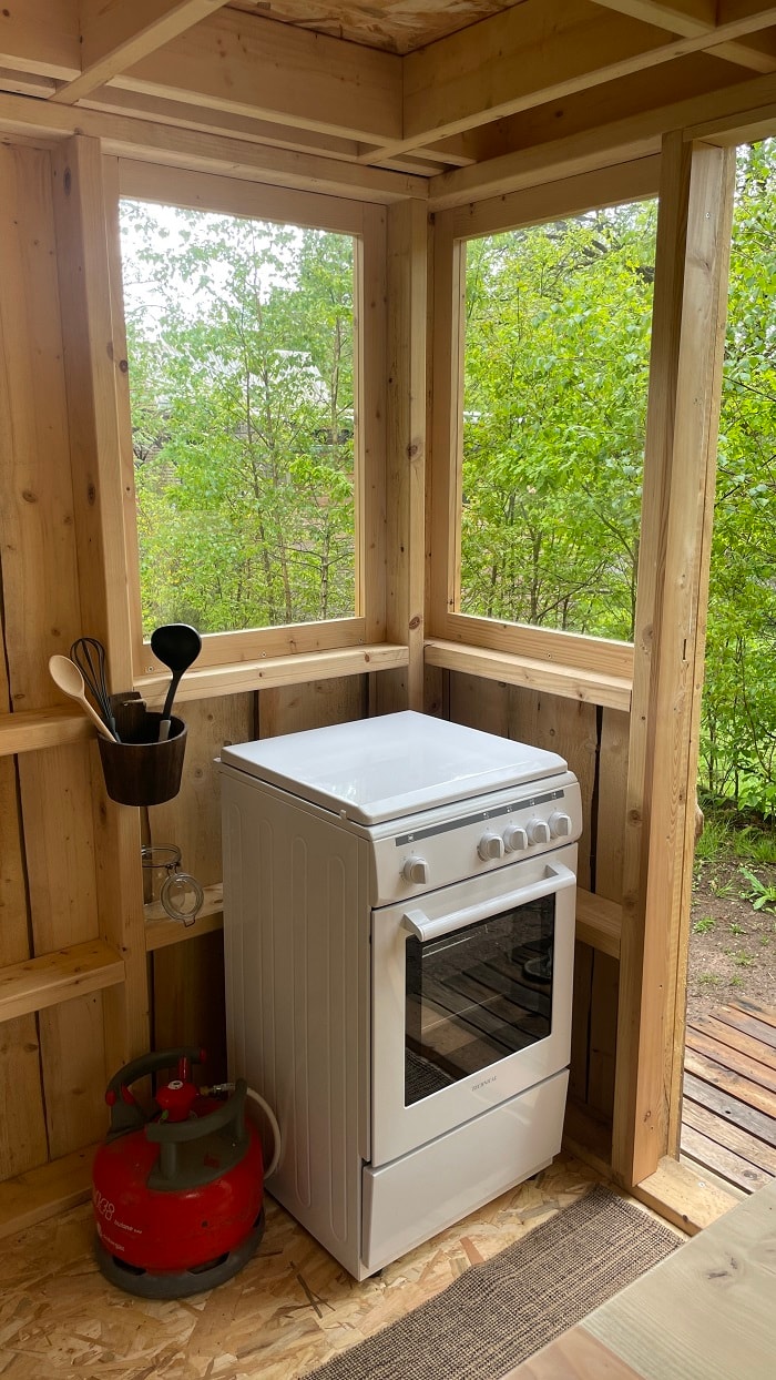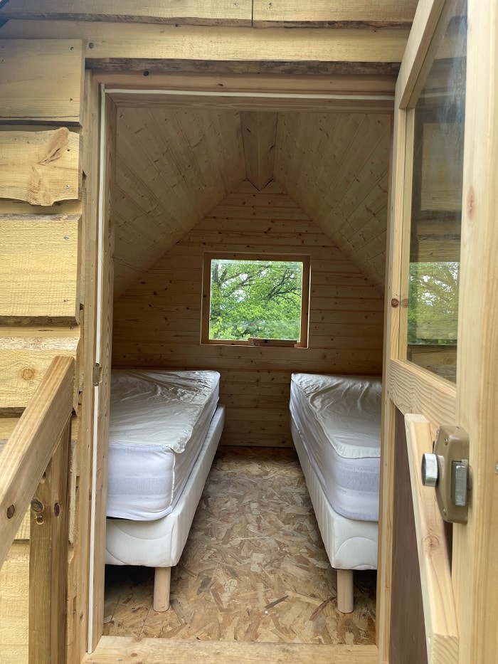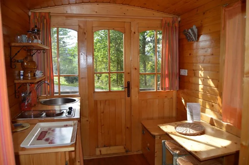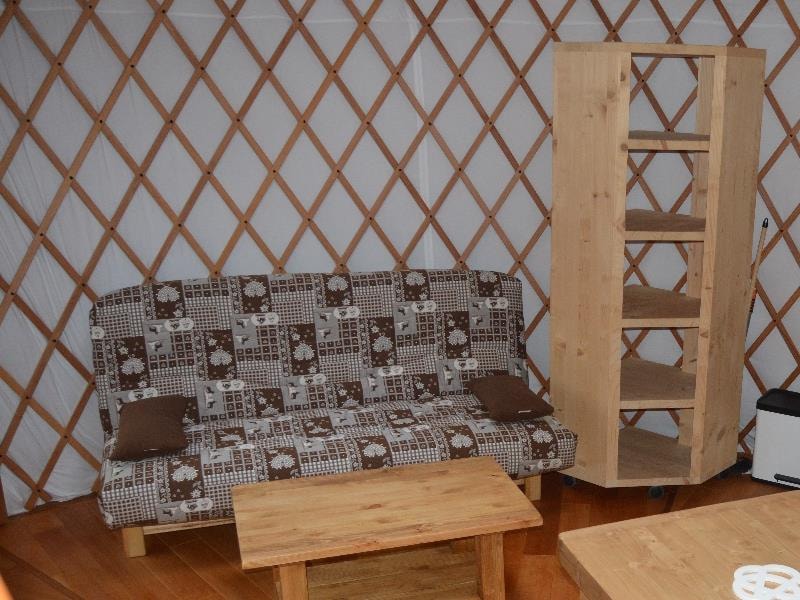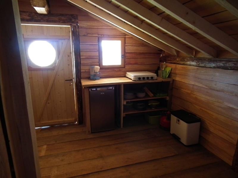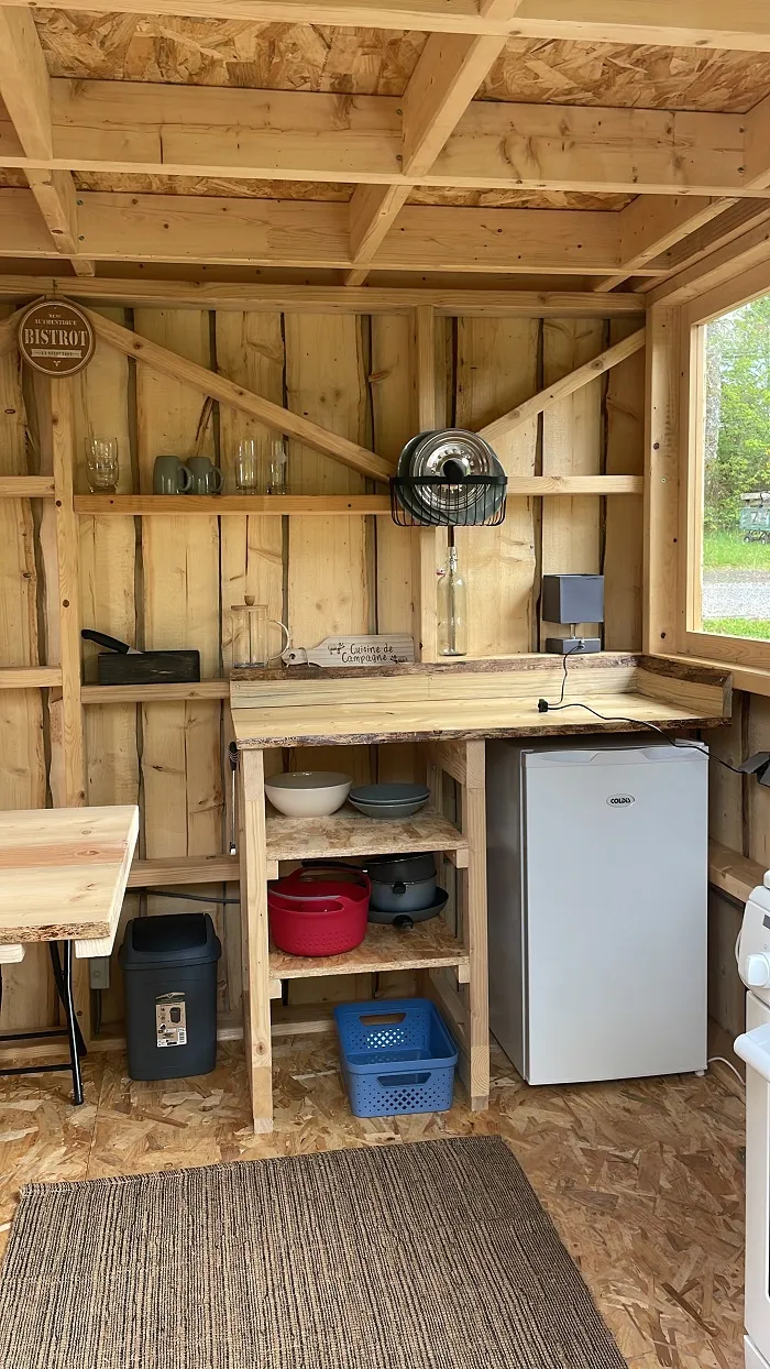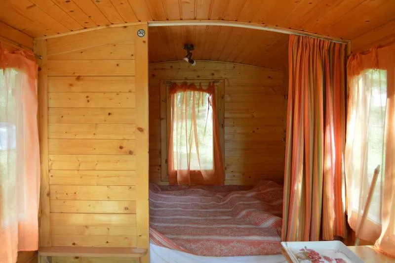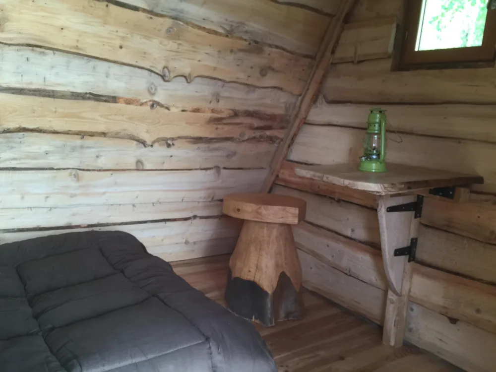 Einzigartige Unterkunft für bis zu 2 Personen. Sie finden einen Holzofen und Campingutensilien für Ihre Mahlzeiten. Sie haben ein Doppelbett und wir stellen Ihnen Bettwäsche (Doppelschlafsack) zur Verfügung. Terrasse und Gartenmöbel. Die Unterkunft ist nicht beheizt.