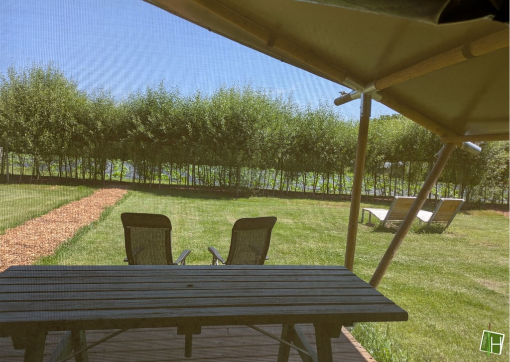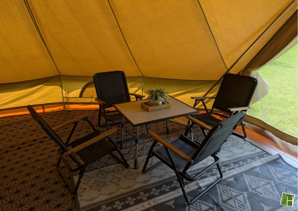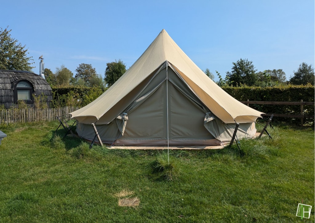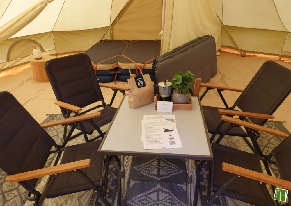 Come and spend the night in one of our 2 tipi tents! As soon as you arrive at the tent field, you can already see 'De Hoogstamen' standing upright in both corners. There is room for 4 people to spend the night in each tipi tent. Everything necessary is provided, such as cooking utensils, crockery and cutlery, a dining table with 4 folding chairs, a Nespresso coffee machine, a kettle, electric cool box and 4 beds. Just opposite the tent area in the main building, there is a sanitary facility where you are welcome to use a toilet and shower. In short: everything is ready for you! Why wait?!