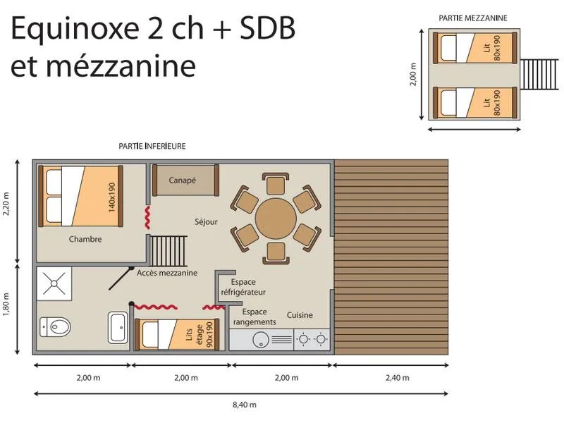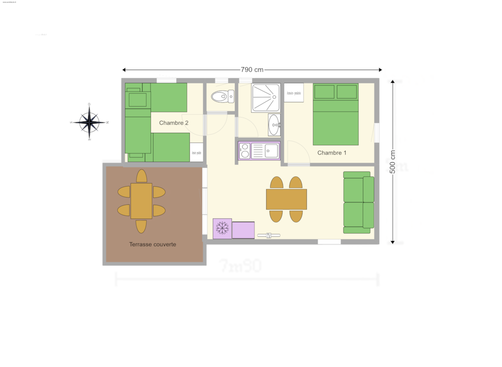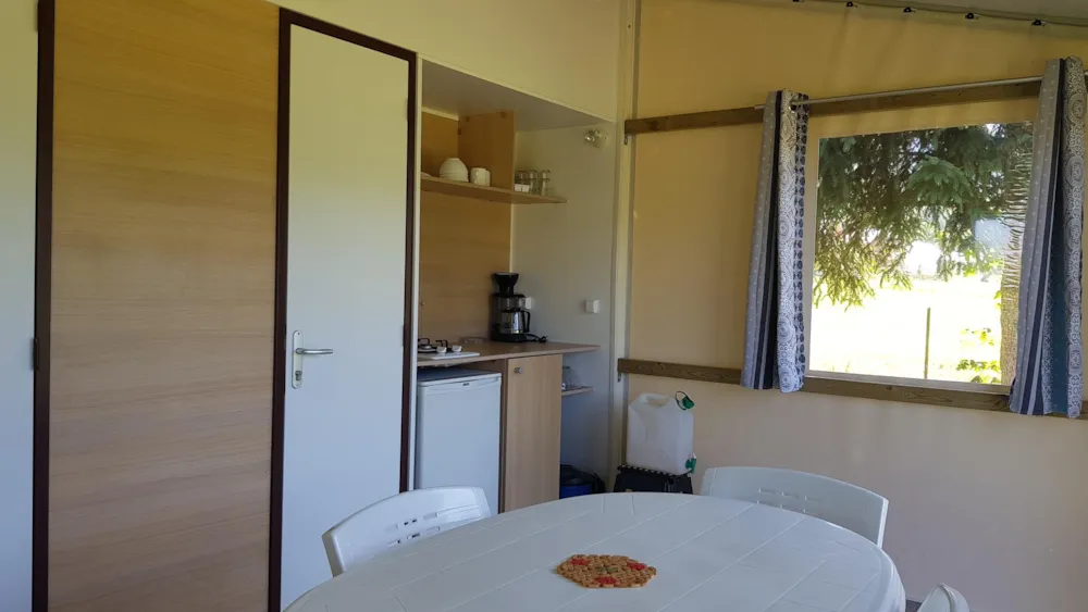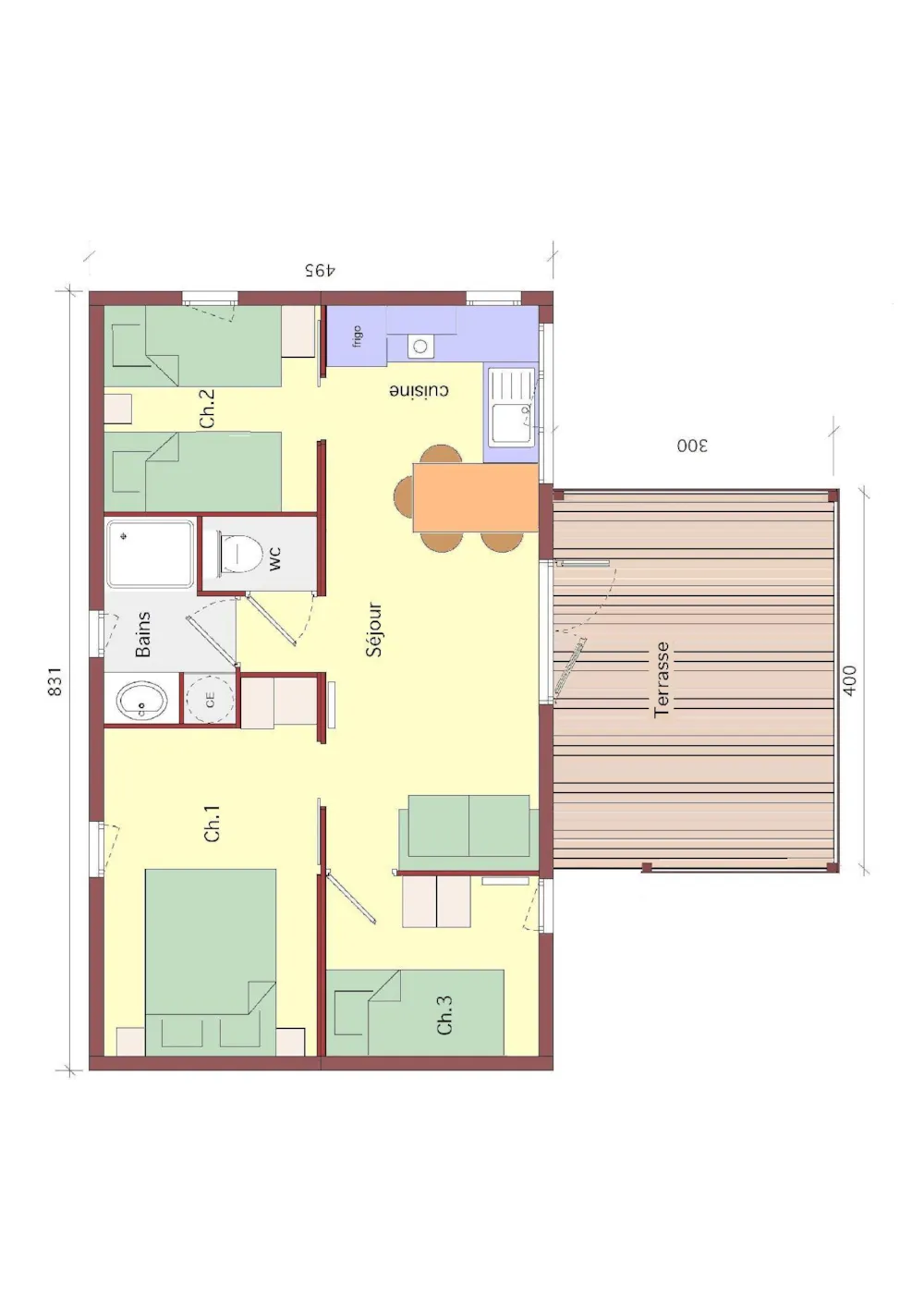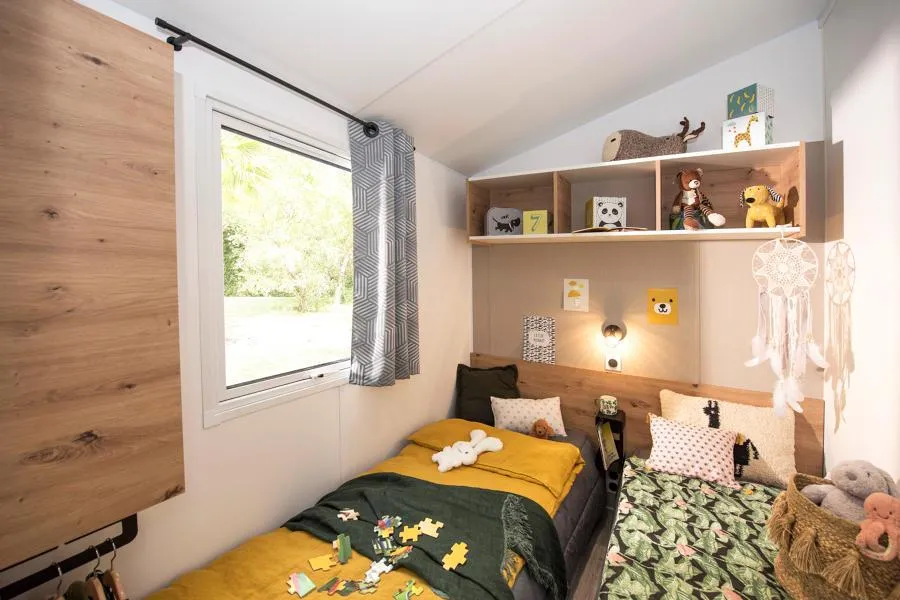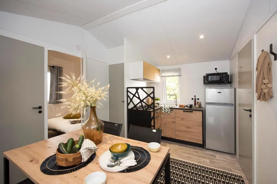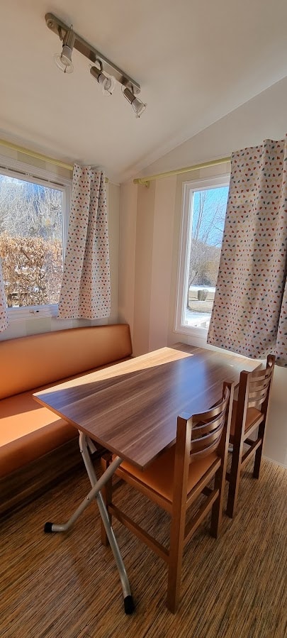 Mobile home 21m² with 2 bedrooms (max 2 adults + 2 childrens). 1 bathroom with shower, independent lavabo.Wc. 1 living room / kitchen with 4 gas burners, fridge, coffee maker and microwave. 1 wooden terrace with garden furniture. Arrival between 14h and 20h. a deposit of 270 euros will be required. departure must be done before 10 am, the rental must be cleaned and stored as you found it. a sum of € 60 is retained if the rent is not cleaned properly. Animals strictly forbidden.