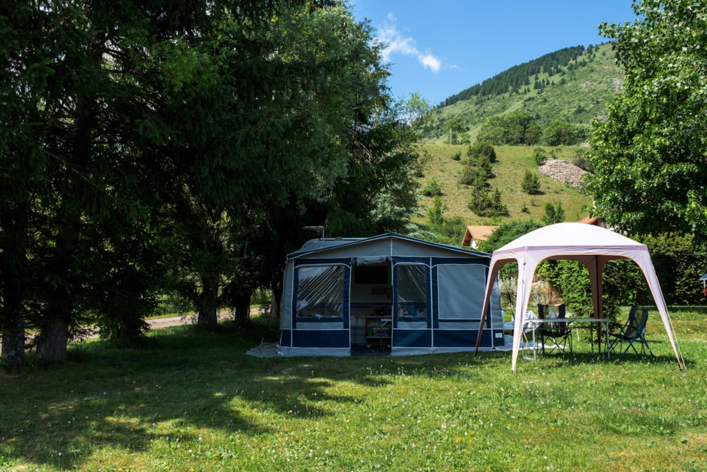 Grasbewachsener Stellplatz von 90 bis 120 m², der Platz für 1 Fahrzeug + 1 Wohnwagen oder 1 Wohnmobil bietet. Möglichkeit, 1 Kinderzelt auf dem Stellplatz aufzustellen.Maximal 1 bis 6 Personen.Möglichkeit des Stromanschlusses 3 oder 6 Ampere mit Aufpreis.