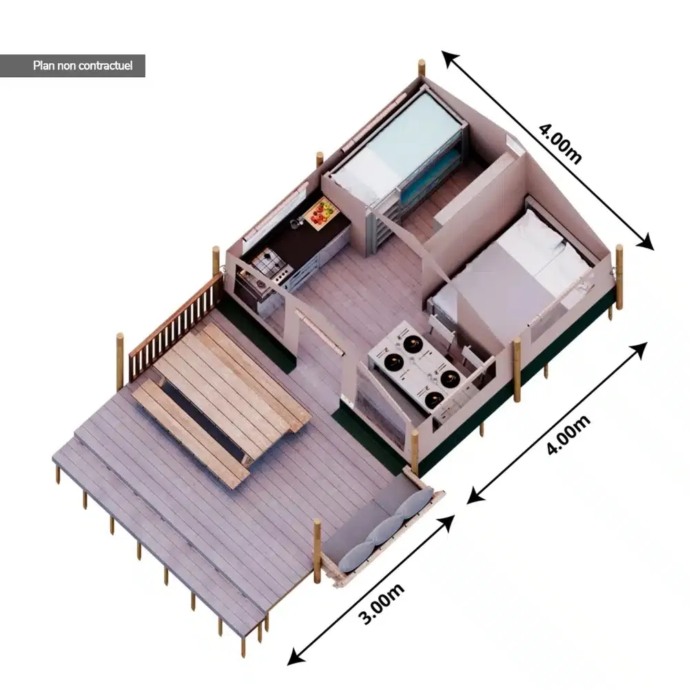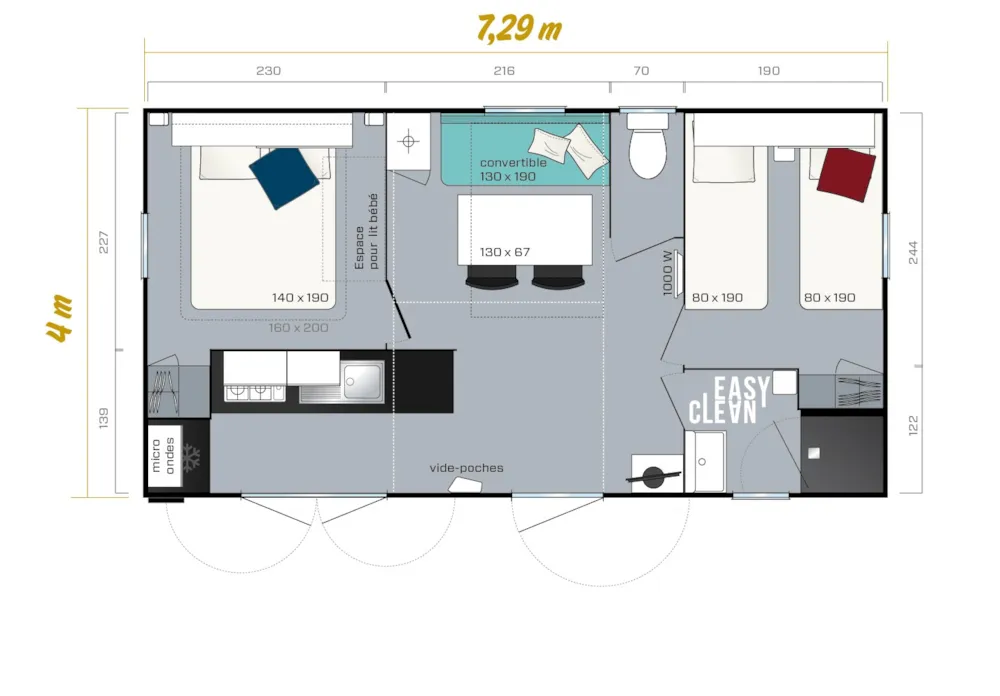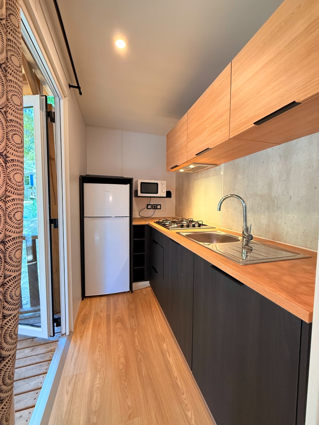 Dies ist das geräumigste Mobilheim; es ermöglicht Ihnen, Ihren Urlaub in der Natur zu genießen, ohne auf Komfort verzichten zu müssen.