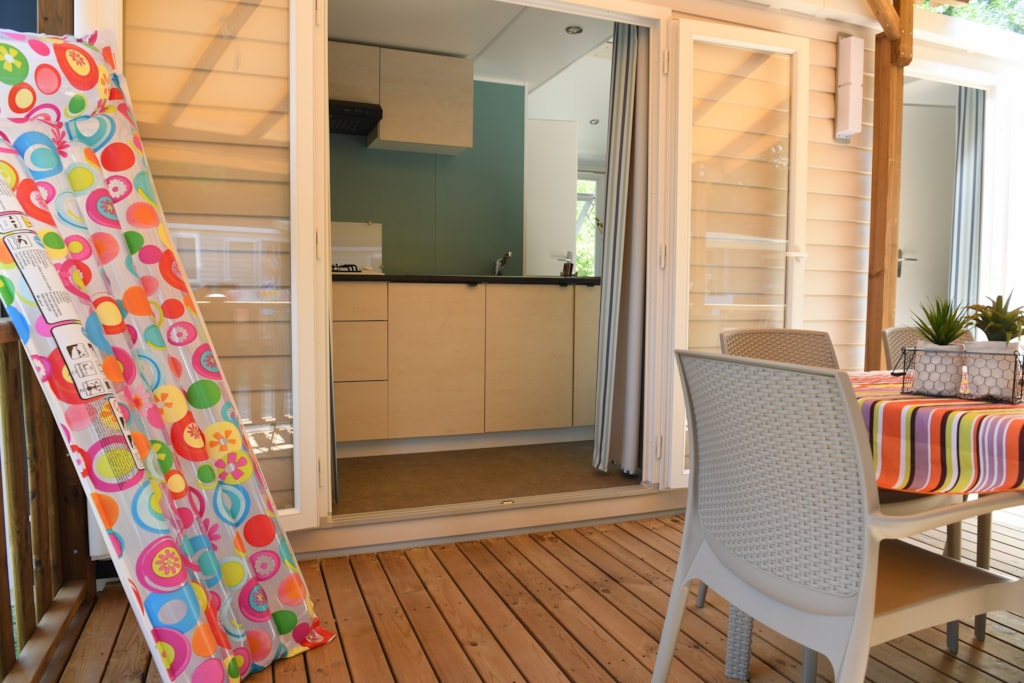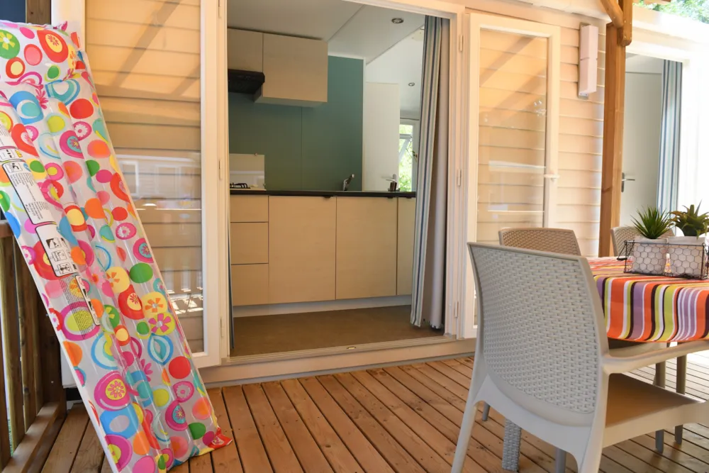 Wie all unsere Mobilheime verfügt es über eine Holzterrasse mit Gartenmöbeln.