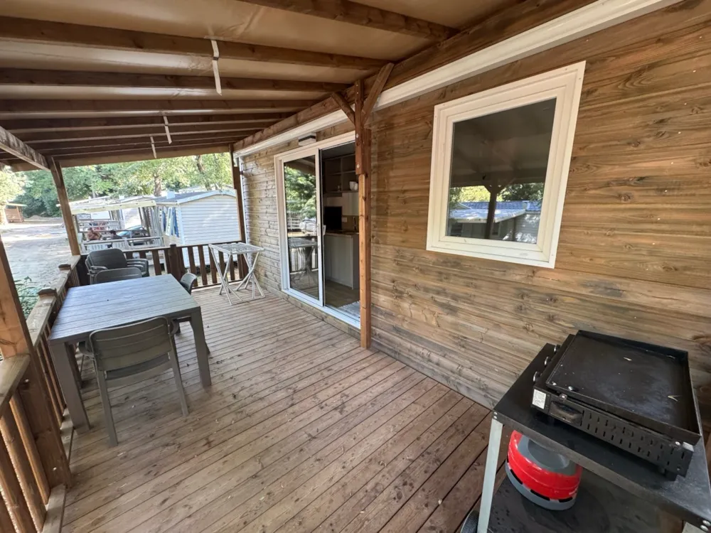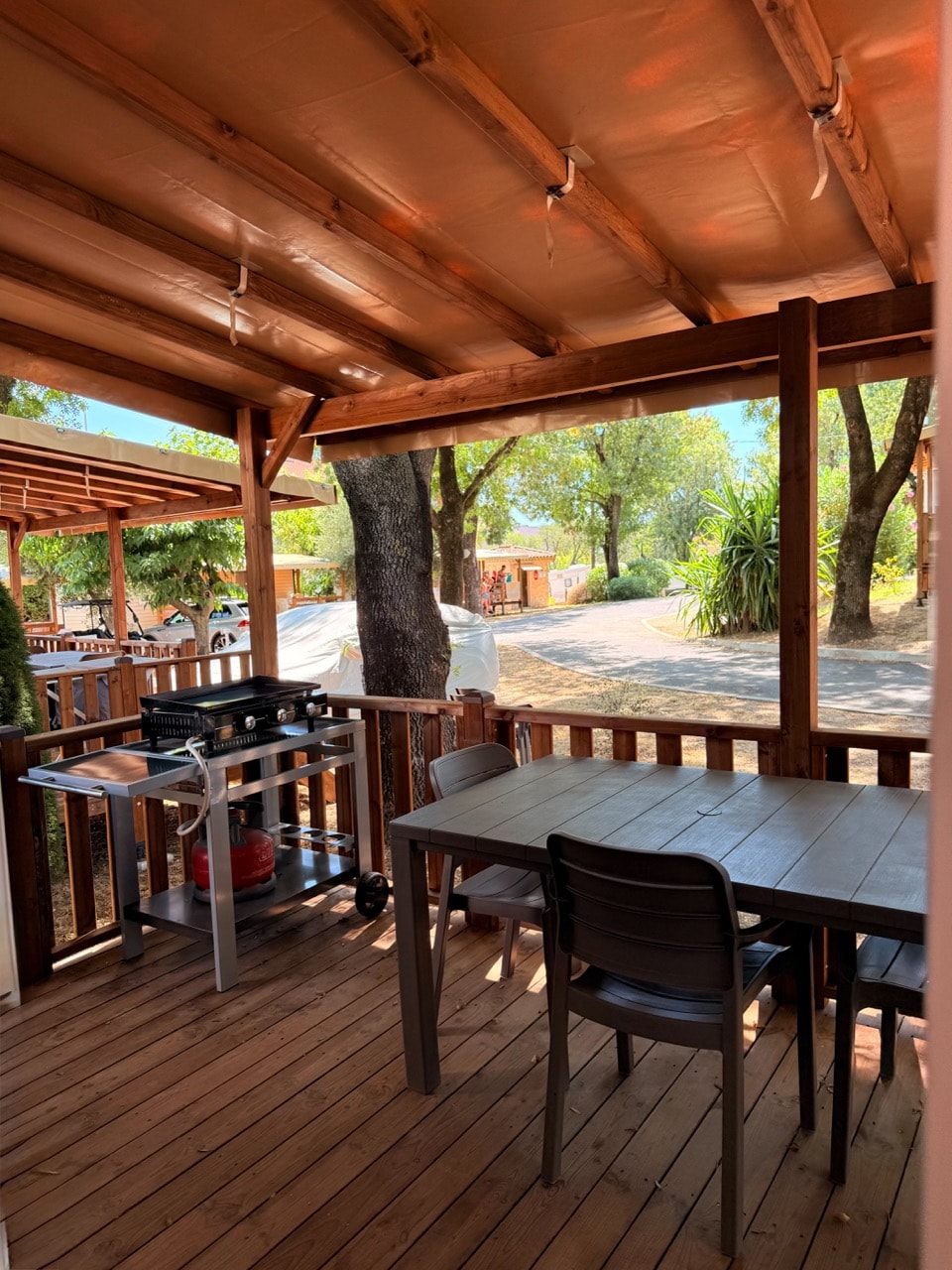 Wie alle unsere Mobilheime ist die Terrasse überdacht und mit Gartenmöbeln sowie einer Plancha ausgestattet, mit der Sie Grillgerichte zubereiten können.