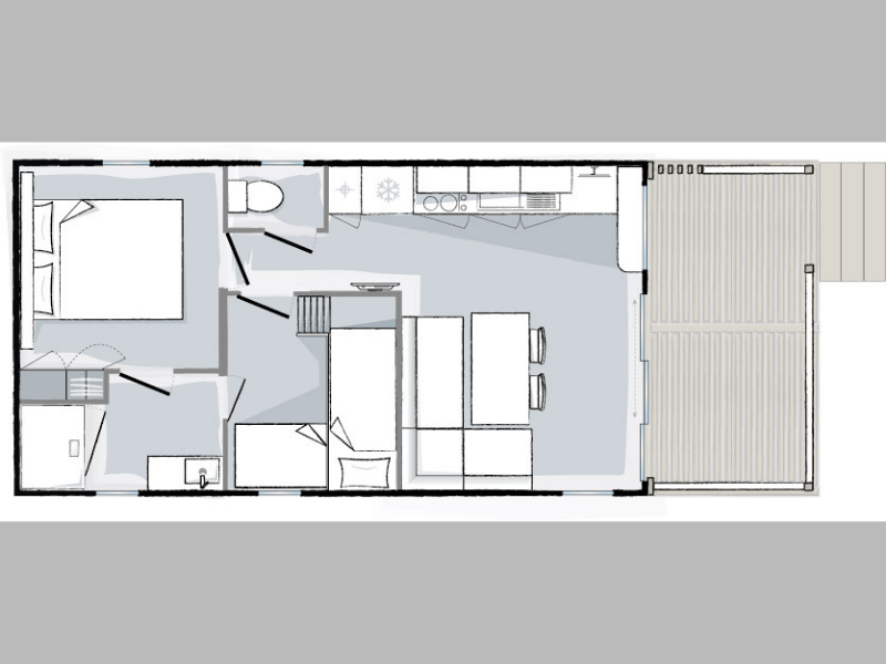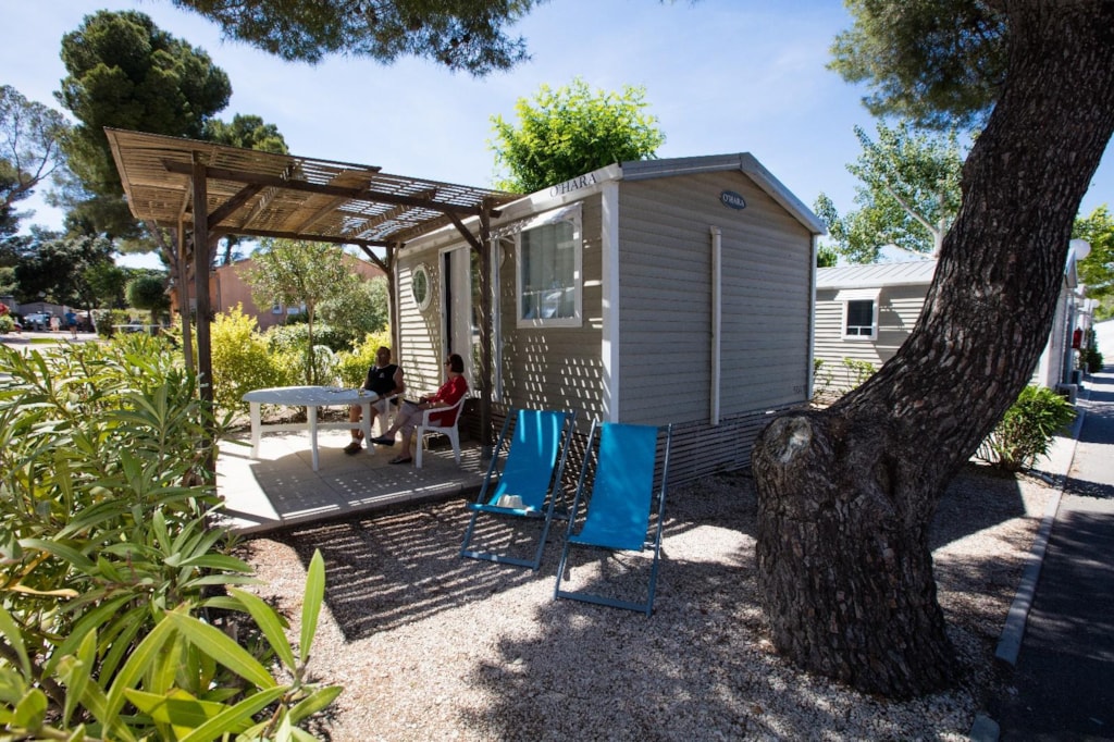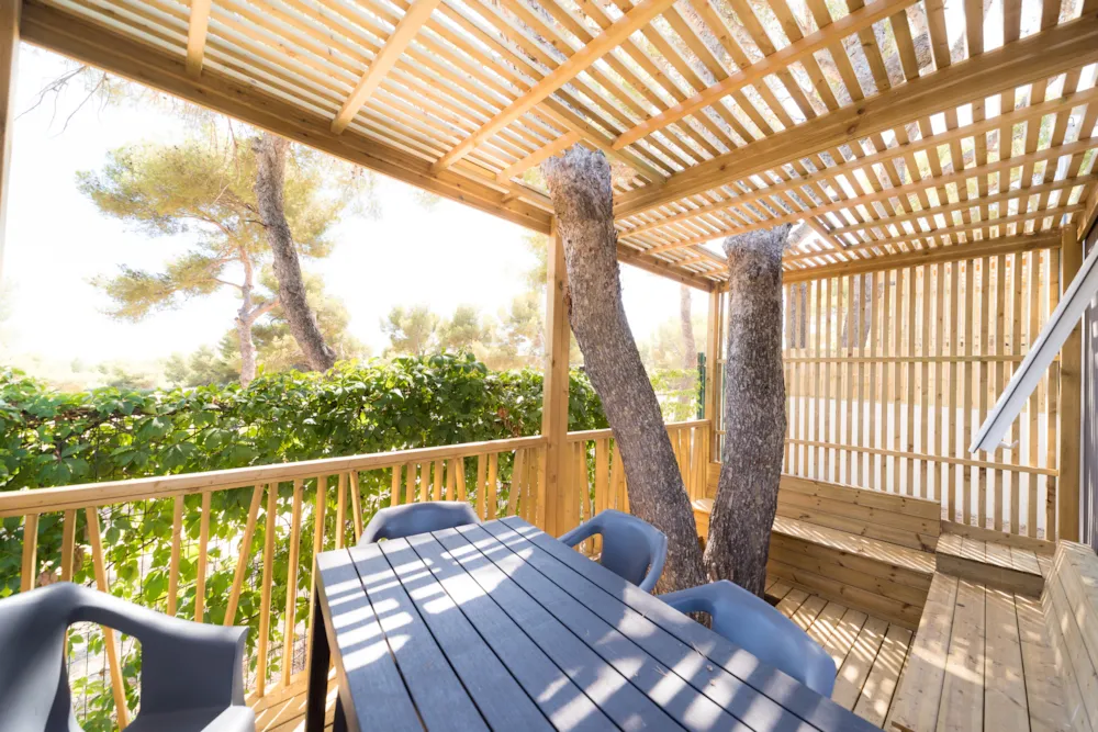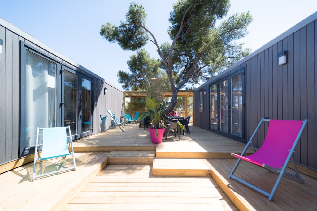 Le Mobil-Home tribu composé de deux Mobil-Home 6 Places Premium partageant leur terrasse commune d'au moins 40m2.
