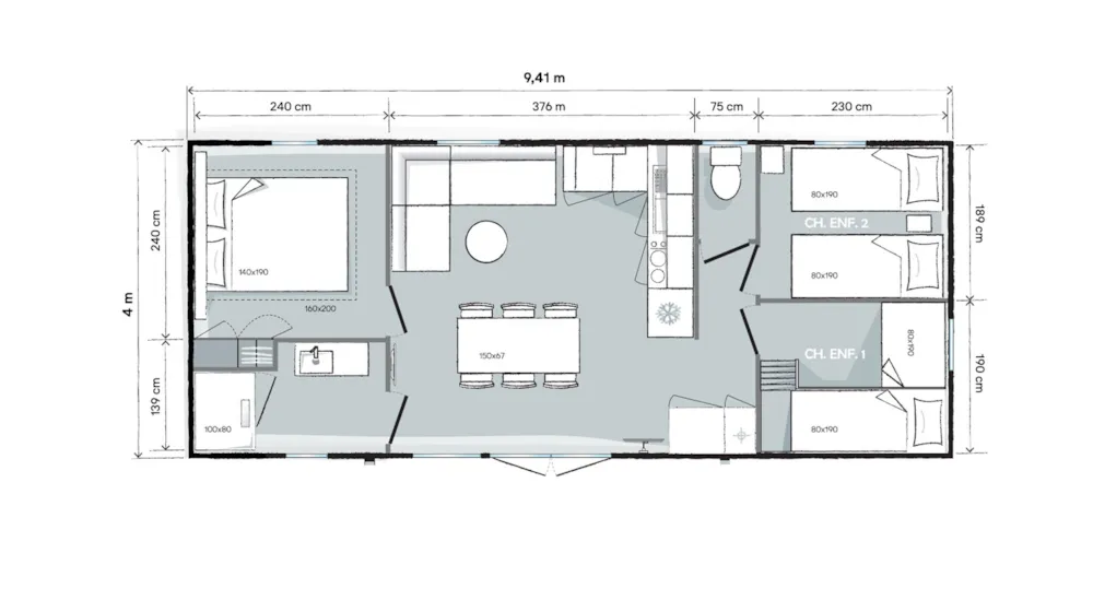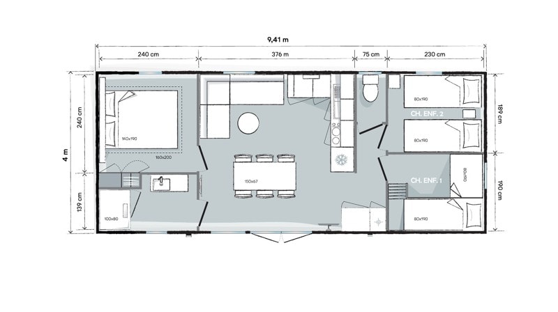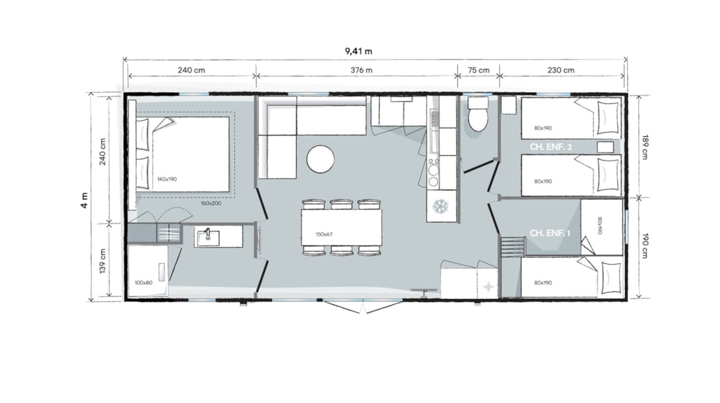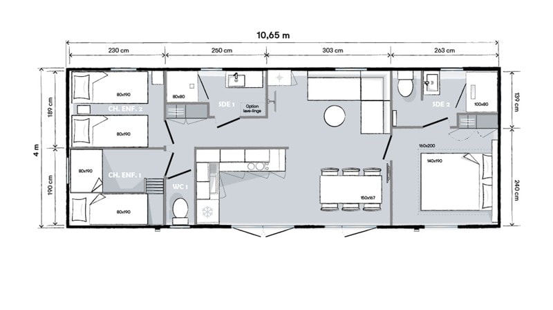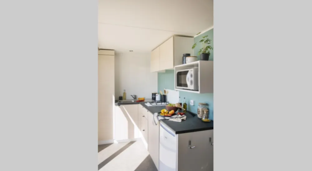 Grâce à notre gamme standard, profitez de vacances ensoleillées en famille ou entre amis à moins de 100 m des plages de sable blanc de la Saulce et de Ste Croix, accessibles à pied. Cet hébergement est disponible en 4 places et est équipé de 2 chambres, dont la première possède un lit double et la seconde deux simples, d’une cuisine aménagée (réfrigérateur, micro-onde, cafetière à filtre, plaque de cuisson etc), d’un coin repas, d’une salle d’eau, de WC indépendant et d’une terrasse couverte. Tout cela adapté pour les personnes à mobilité réduite. Cette gamme se trouve côté route. Sont fournis dans chaque location : des couettes, des oreillers et salon de jardin. Ne sont pas fournis : les draps (disponibles en suppléments) et autres linges de maison. Tous nos mobil-homes sont climatisés. Photos mises à disposition par le fournisseur de mobil-home.