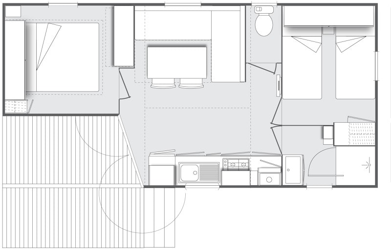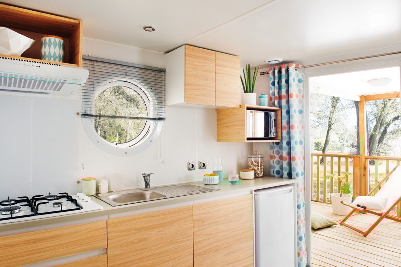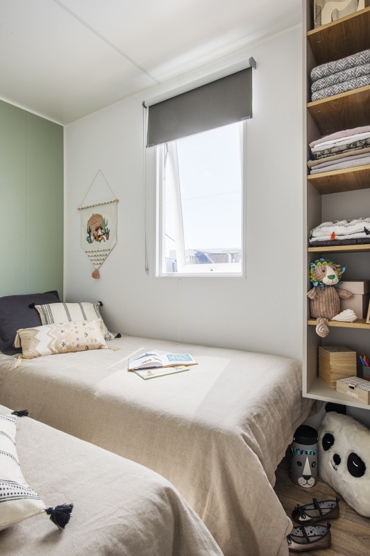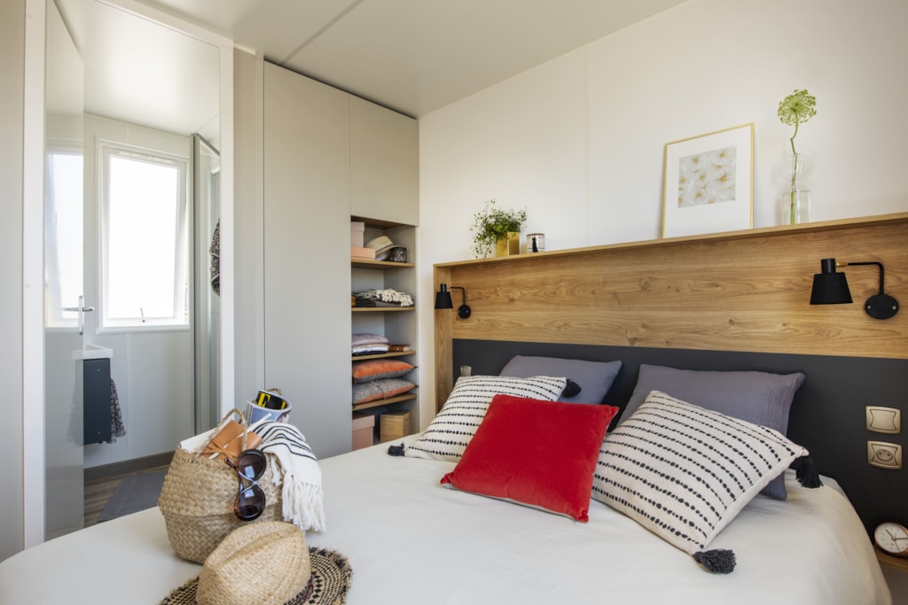 Grâce à notre gamme Premium, partagez des moments inoubliables en famille ou entre amis dans votre location de 38m2, avec ses 3 chambres, sa salle de bain spacieuses et son grand espace à vivre. L’accès n’est possible uniquement par escaliers. Elle est déconseillée aux personnes rencontrant des difficultés à marcher et aux PMR. Notre gamme Premium met à votre disposition une cuisine toute équipée avec son lave-vaisselle ainsi qu’un salon avec télévision. Son point fort, sa grande terrasse en hauteur et sa splendide vue pinède et/ou mer. Vous aurez l’occasion de vous dépayser et de vous détendre grâce aux chants de nos cigales et des chaises longues mises à votre disposition. Sont fournis dans chaque location : des couettes, des oreillers, une cafetière à filtre et un salon de jardin. Ne sont pas fournis : les draps et autres linges de maison (serviettes, tapis de bain, torchons etc) Ils sont toutefois disponibles en location. Tous nos mobil-homes sont climatisés. Photos mises à disposition par le fournisseur de mobil-home.