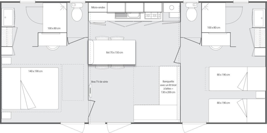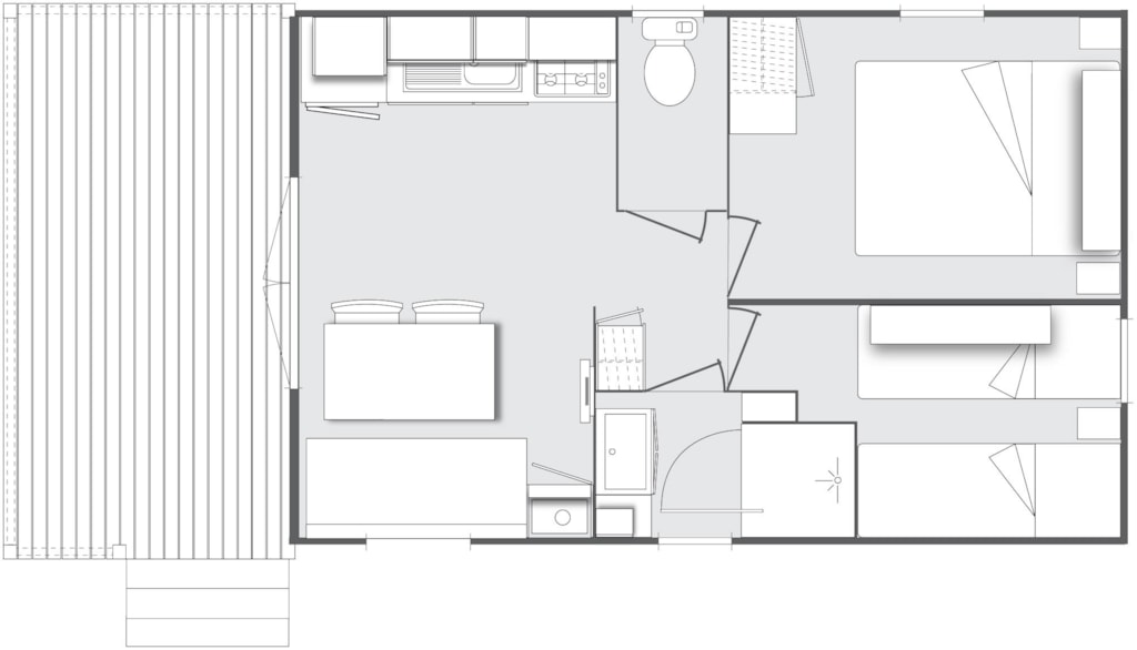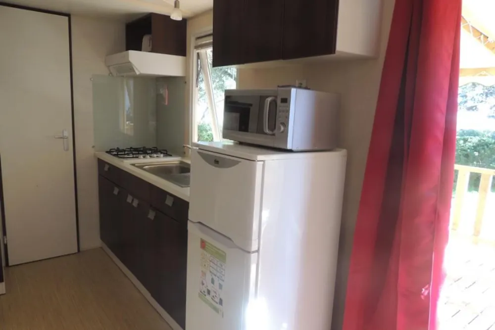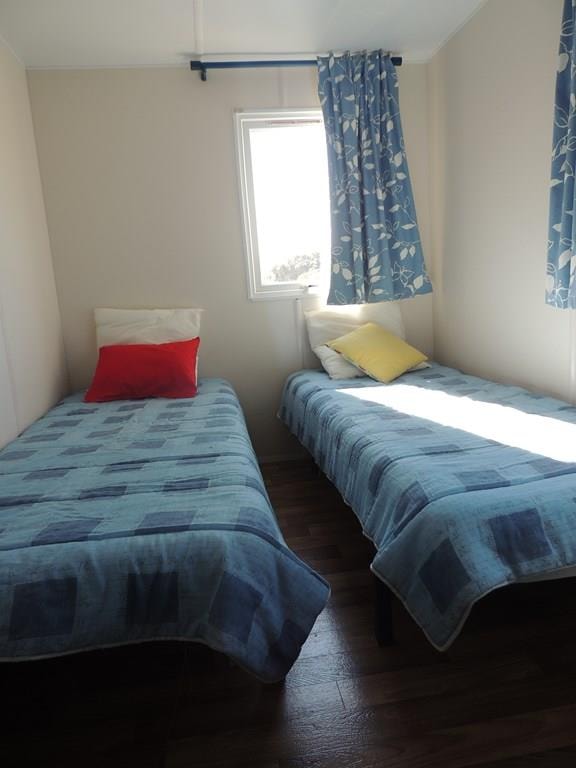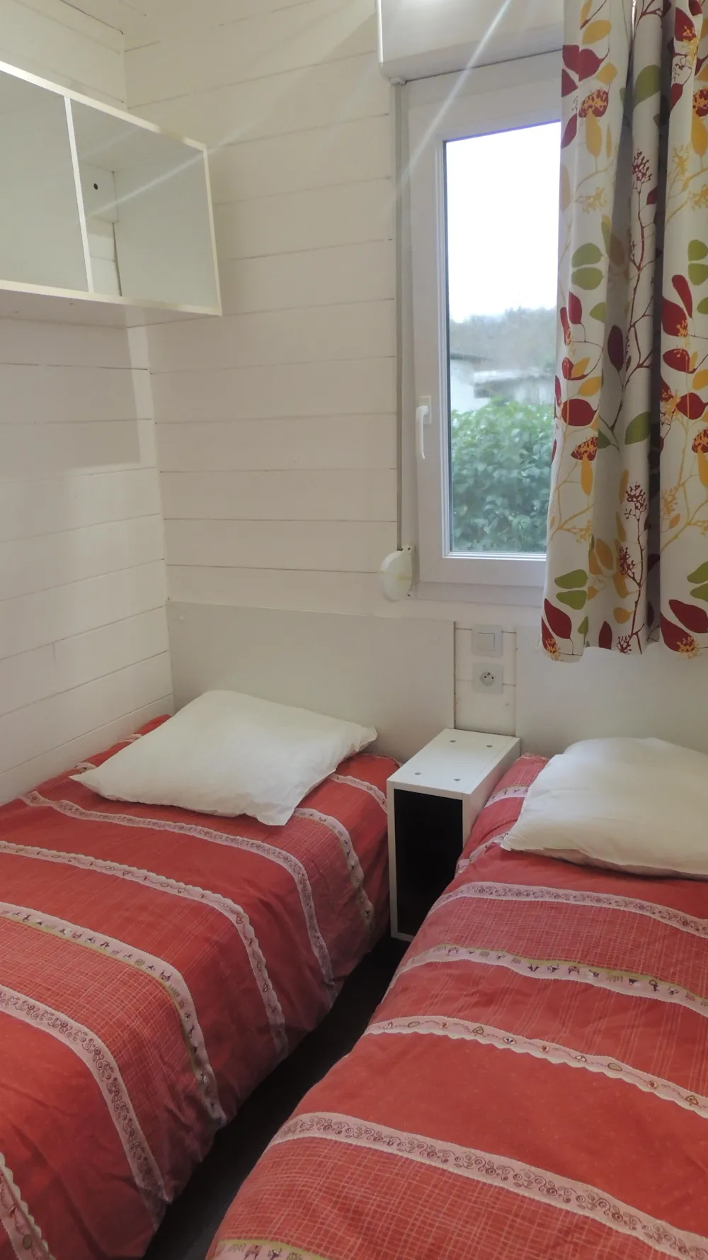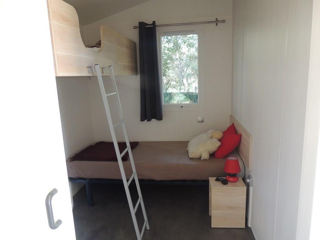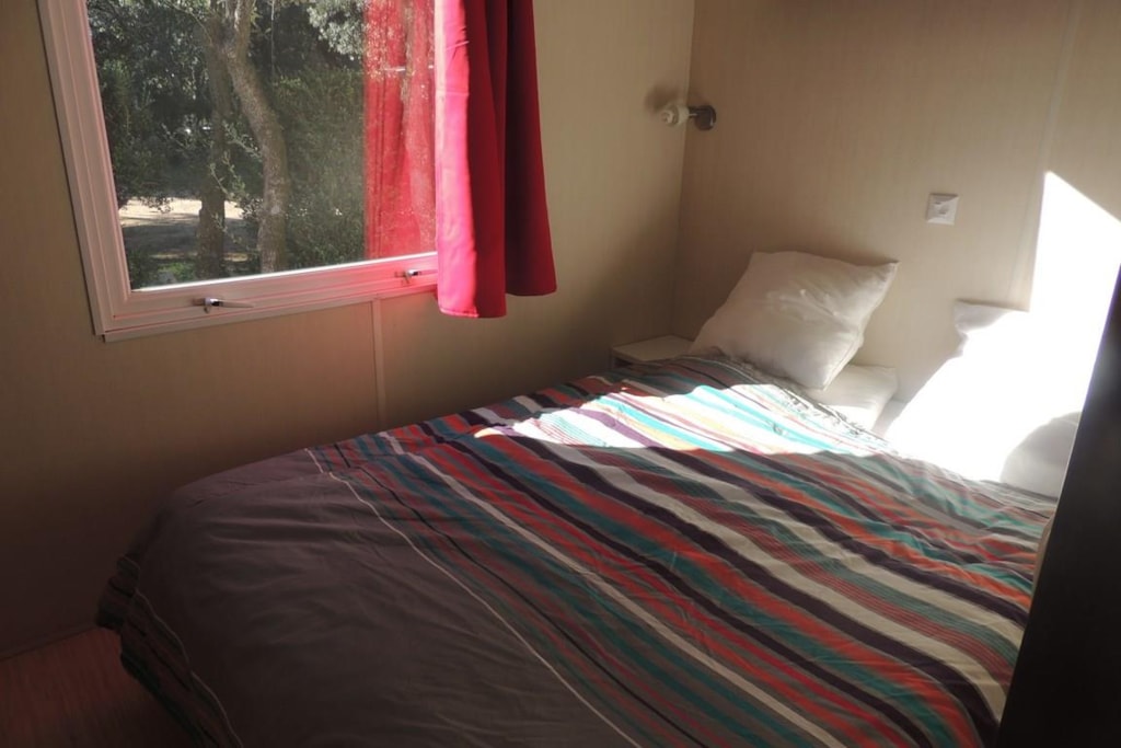 Mobil-home évasion- TV incluse - Climatisation : 2 chambres : peut accueillir jusqu'à 5 personnes, 30m² + terrasses couverte comprise 2 chambres avec 3 lits 1 personnes (dont 1 superposé pour 1 enfant), 1 chambre avec 1 grand lit 140.. Possibilité de rajouter une petite tente supplémentaire (avec suppléments) sur demande.