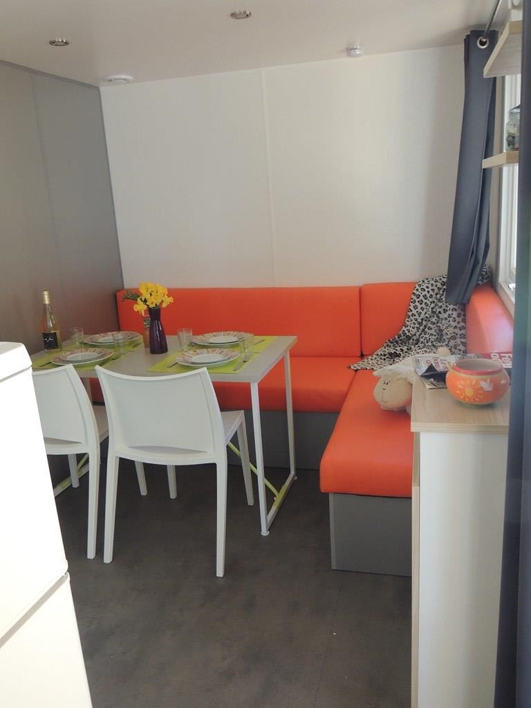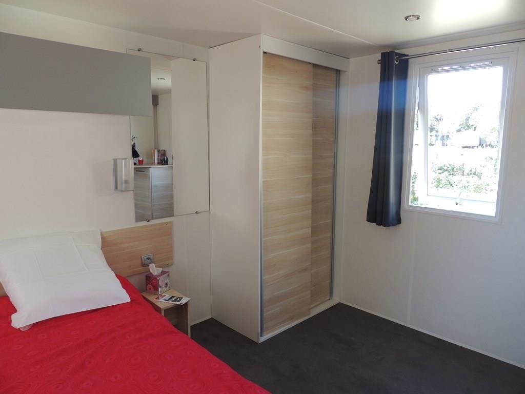 Mobil Home SUNNY pouvant accueillir jusqu'à 4 personnes.TV incluse - 27,30m² terrasse couverte comprise. 1 chambre avec 1 grand lit et 1 chambre avec 2 lits 1 personne. Possibilité de rajouter une petite tente supplémentaire (avec suppléments) sur demande.