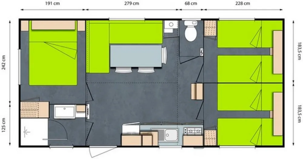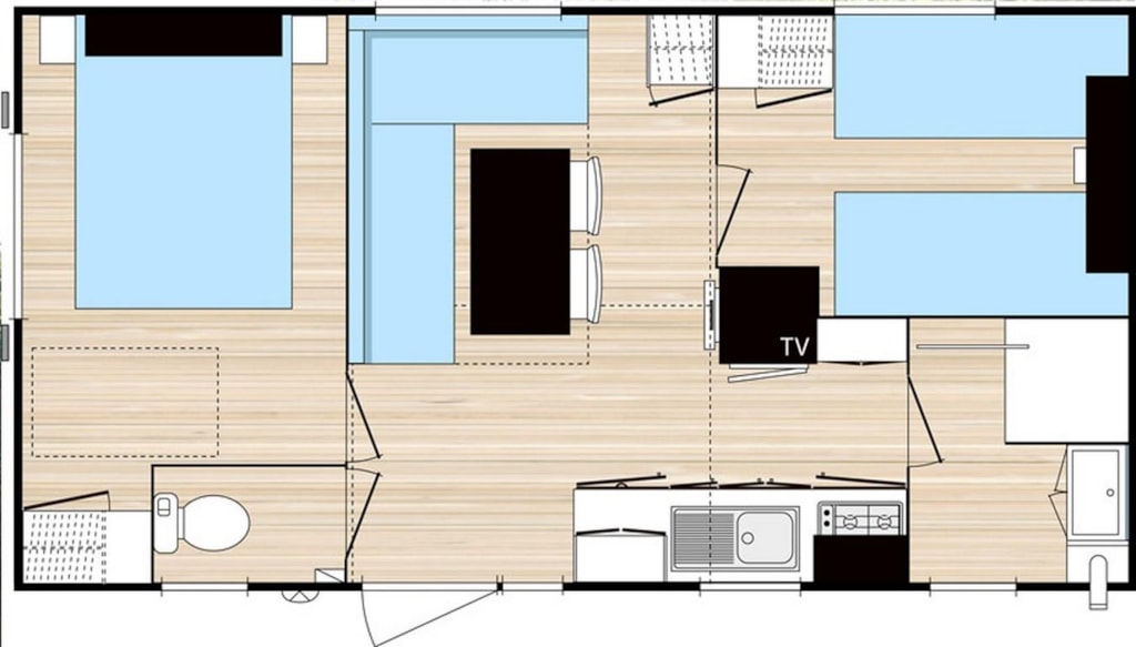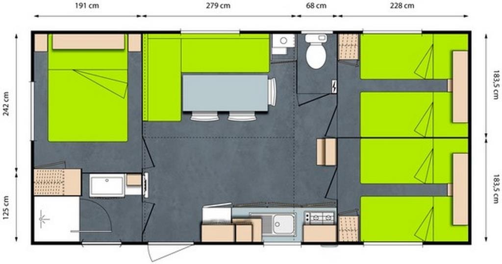Mobil Home HOLIDAY peut accueillir jusqu'à 5 personnes. TV incluse -25,20m²+ une terrasse 2 chambres : une avec un lit 2 personnes et la deuxième avec 3 lits 1 personne.Possibilité de rajouter une petite tente supplémentaire (avec suppléments) sur demande.