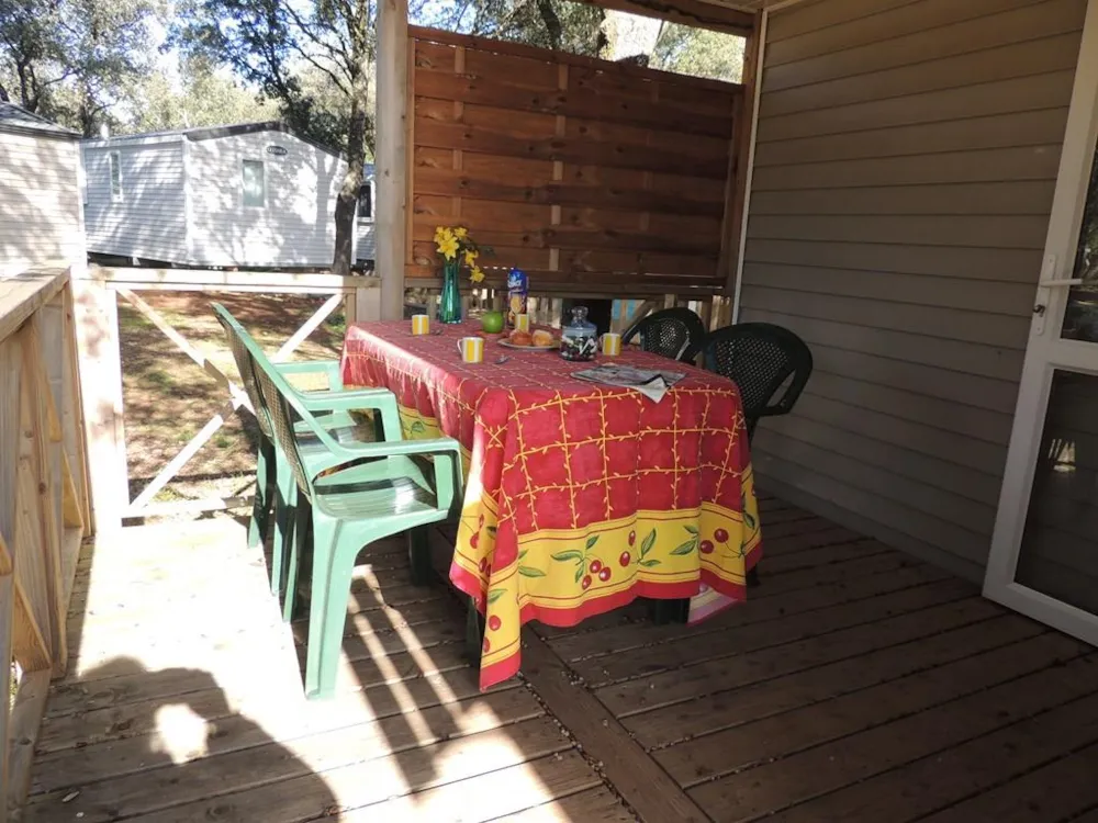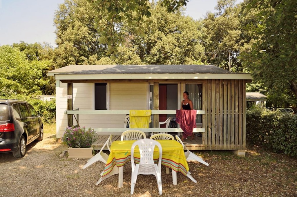 Mobil Home FAMILY + pouvant accueillir jusqu'à 6 personnes- TV incluse - Climatisation . Tout confort. 2 chambres : 1 avec 1 grand lit et une deuxième avec 2 lits une personne ; 27,30m² + une terrasse. Possibilité de rajouter une petite tente supplémentaire (avec suppléments) sur demande.