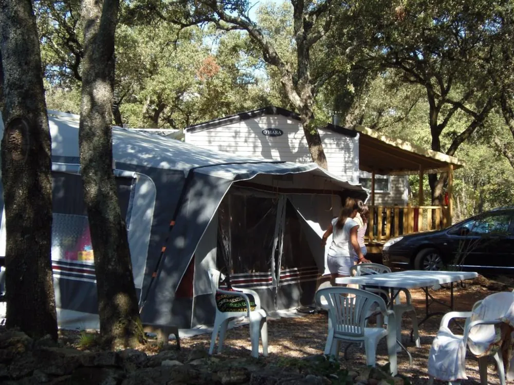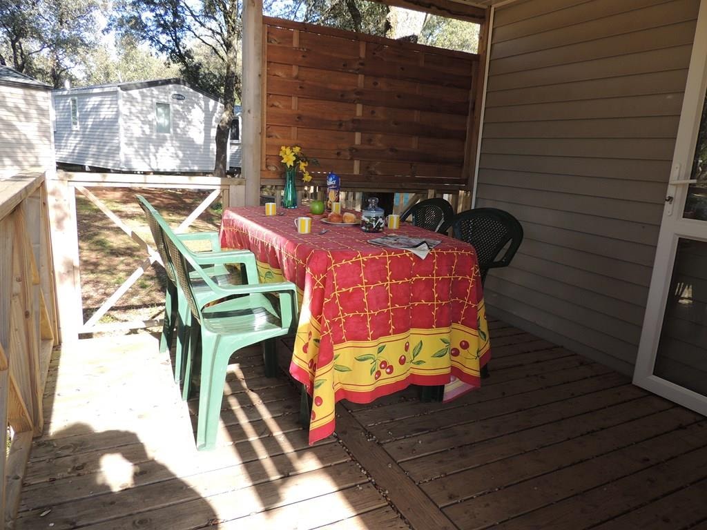 Chalet 2 chambres tout confort TV incluse très agréable avec cuisine équipée, frigo, micro onde, salle de bain, salon et terrasse couverte de 15m². Possibilité de rajouter une petite tente supplémentaire (avec suppléments) sur demande. Arrivé/départ: dimanche