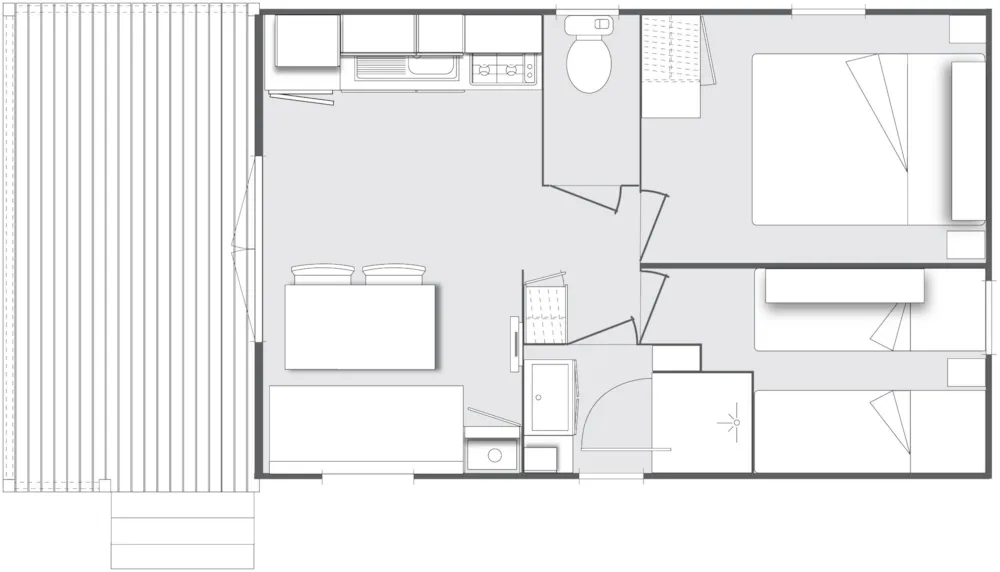 Mobil-home FAMILY PLUS 3 chambres- TV incluse - : peut accueillir jusqu'à 8 personnes, 32m² + terrasses couverte . 2 chambres avec 2 lits 1 personnes, 1 chambre avec 1 grand lit. Idéal pour les familles.Possibilité de rajouter une petite tente supplémentaire (avec suppléments) sur demande.