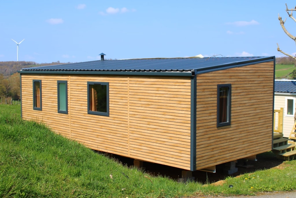 MOBILHEIM PREMIUM 2p (20 m²), 1 SCHLAFZIMMER, KLIMAANLAGE, TV, ÜBERDACHTE TERRASSE, QUEEN-SIZE-BETT.
