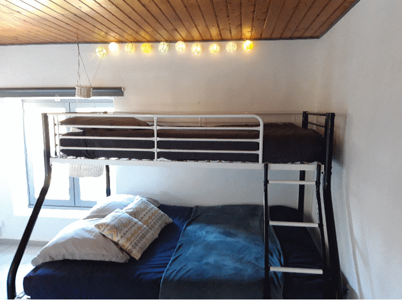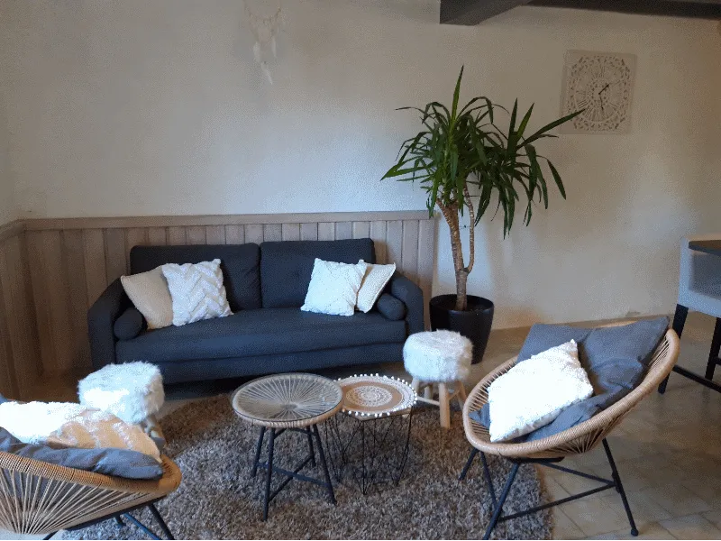 Gite of 90 m² for 6 persons on 2 levels. Ground floor: large living room of 45 m² opening onto kitchen, WC. First floor: 2 bedrooms (sleeps 4), bathroom.
